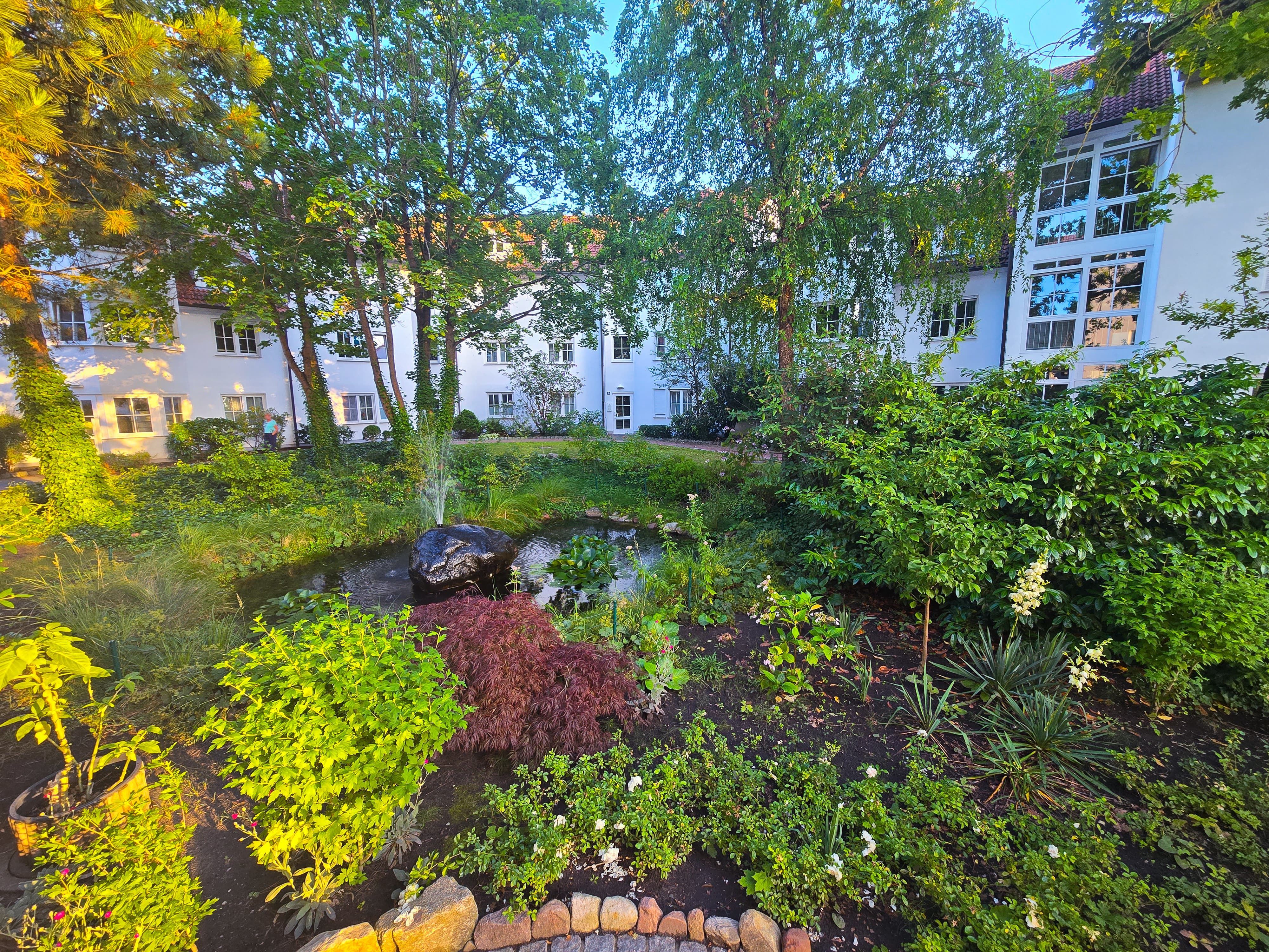 Die Ferienwohnungen liegen in einem kleinen Park mit altem Baumbestand und einem Gartenteich mit Springbrunnen. Bänke und überdachte Freisitze in den gepflegten Gartenanlagen laden zum Verweilen ein.
