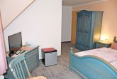 Unsere modern eingerichteten Doppelzimmer (21 qm) sind mit rustikalen Bauernmöbeln komfortabel ausgestattet und in den Farben Blau oder Grün gehalten. Zur Ausstattung gehören bequeme Doppelbetten mit Nachttischen und Leselampen, Sitzmöbel mit Tisch, Kleiderschrank, Kühlschrank, Wasserkocher, Flachbild-TV und Radio. Tassen und Löffel sind ebenfalls vorhanden. Separat für alle Gäste haben wir Geschirr, wie Teller, Teetassen sowie Besteck und Geschirrhandtücher. Ab 2016 gibt es auch einen kostenlosen WLAN-Anschluss. Bei Ihrer Anreise liegen frische Handtücher bereit und die Betten sind selbstverständlich bereits mit Bettwäsche bezogen. Alle Zimmer verfügen über ein separates Bad mit Tageslicht, Dusche und WC. In unserem Frühstücksraum starten Sie den Tag mit einem ausgiebigen Frühstück vom reichhaltigem Buffet. Wir halten auch eine Auswahl an Getränken für Sie bereit.