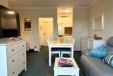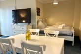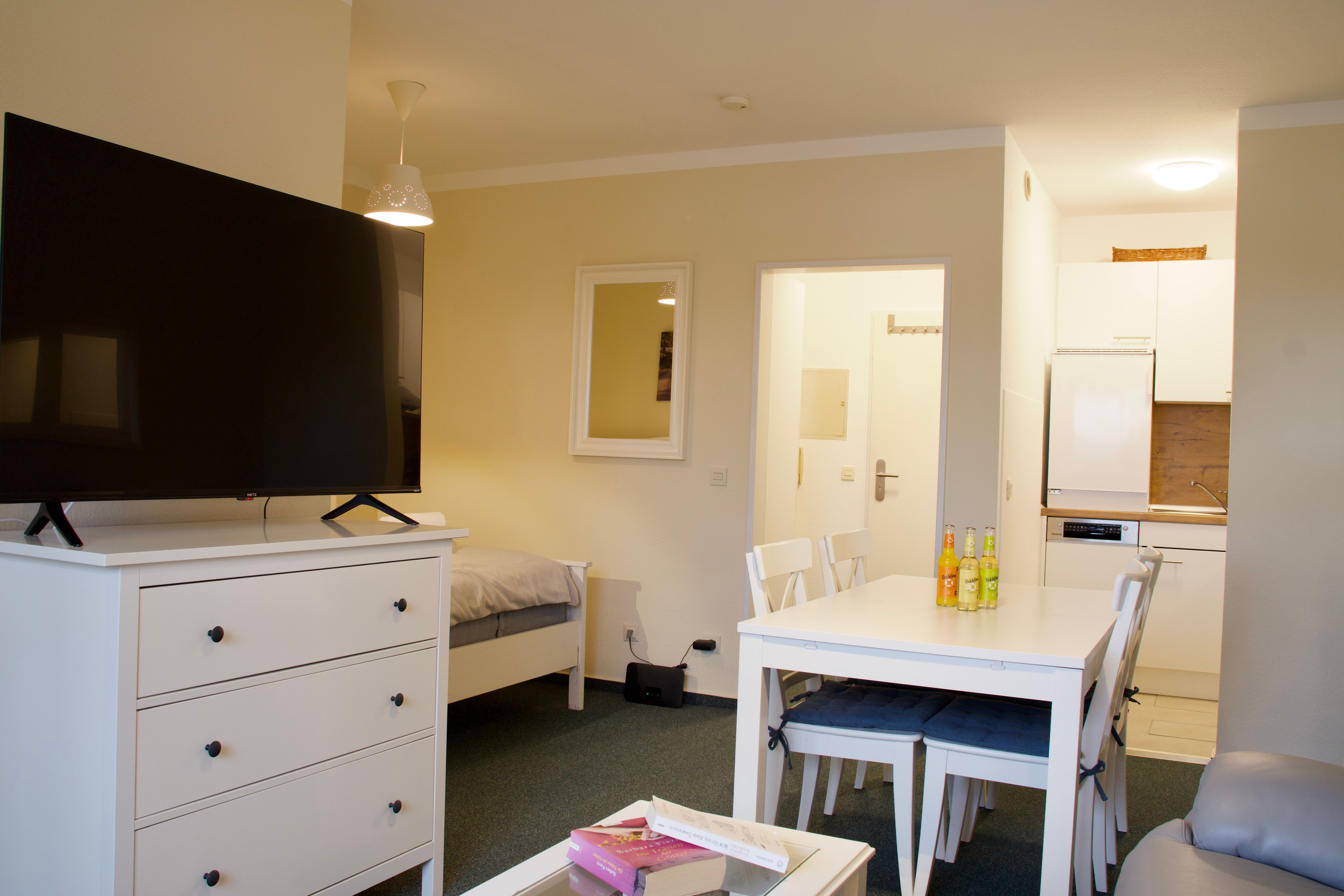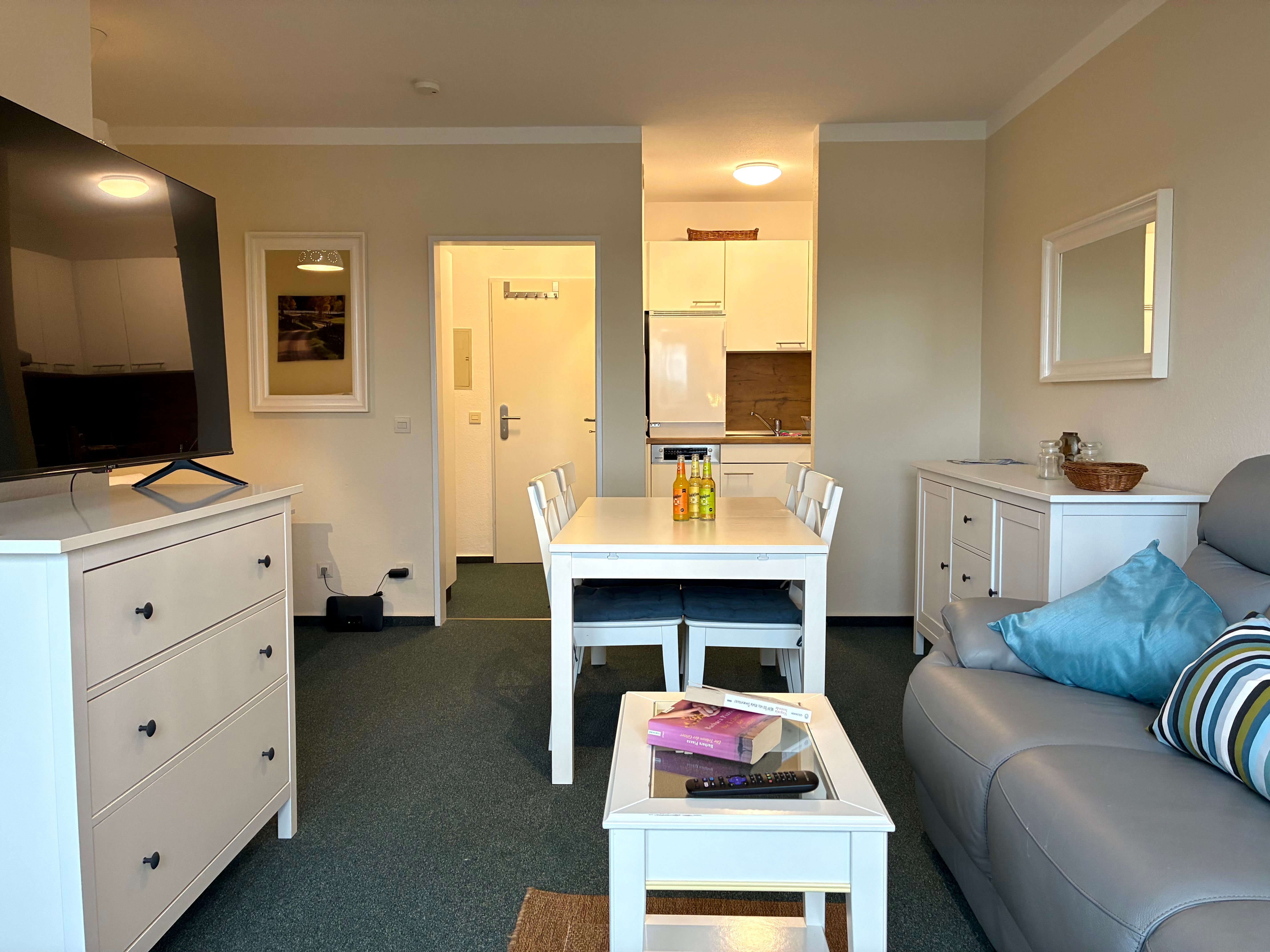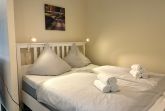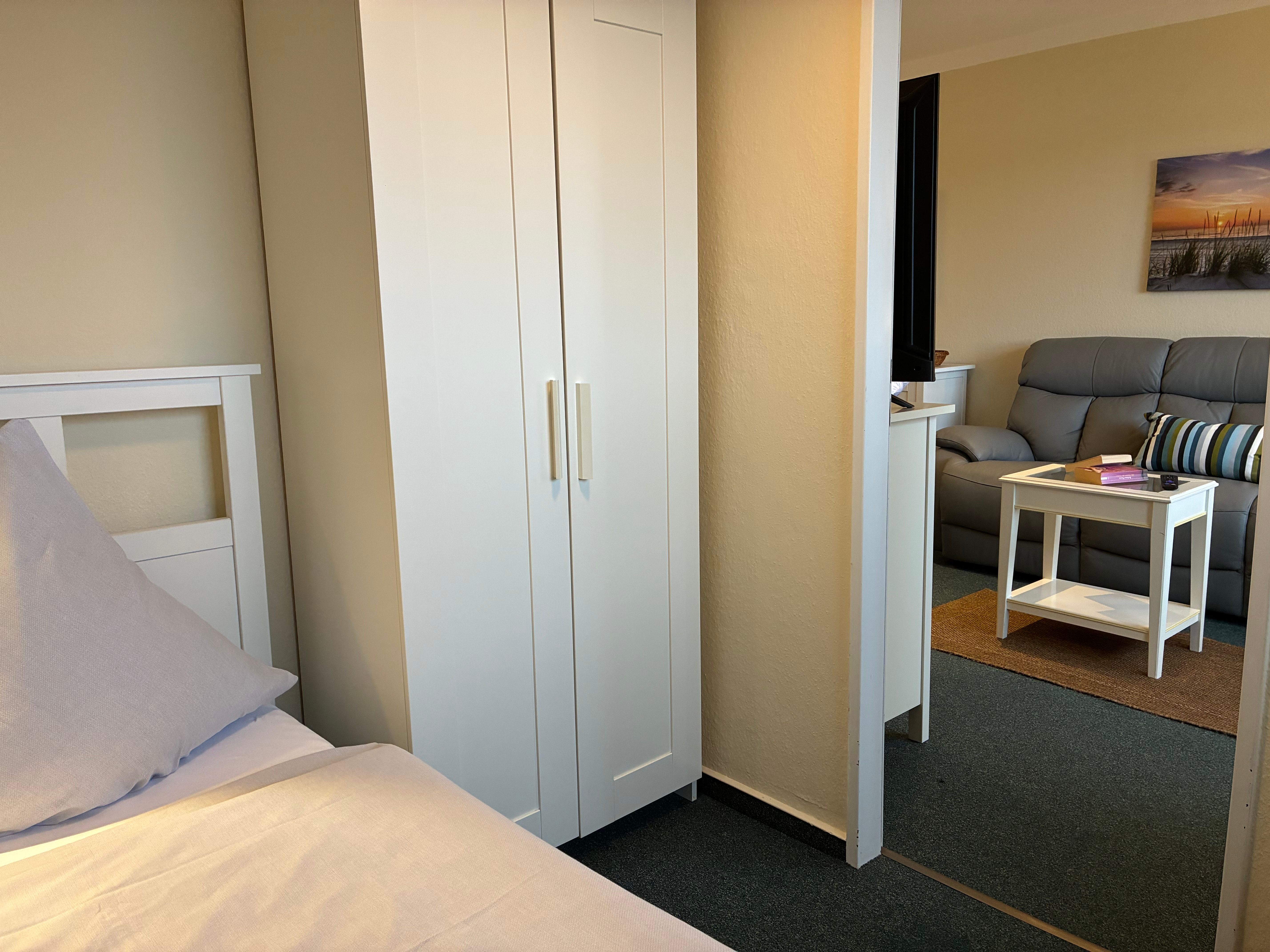 Vom Wohnbereich aus erreichen Sie außerdem das zweite Schlafzimmer mit einem Einzelbett, das sich gut als Rückzugsort eignet. Die Wohnung ist insgesamt hell und gemütlich eingerichtet und schafft eine angenehme Balance zwischen Offenheit und Geborgenheit.