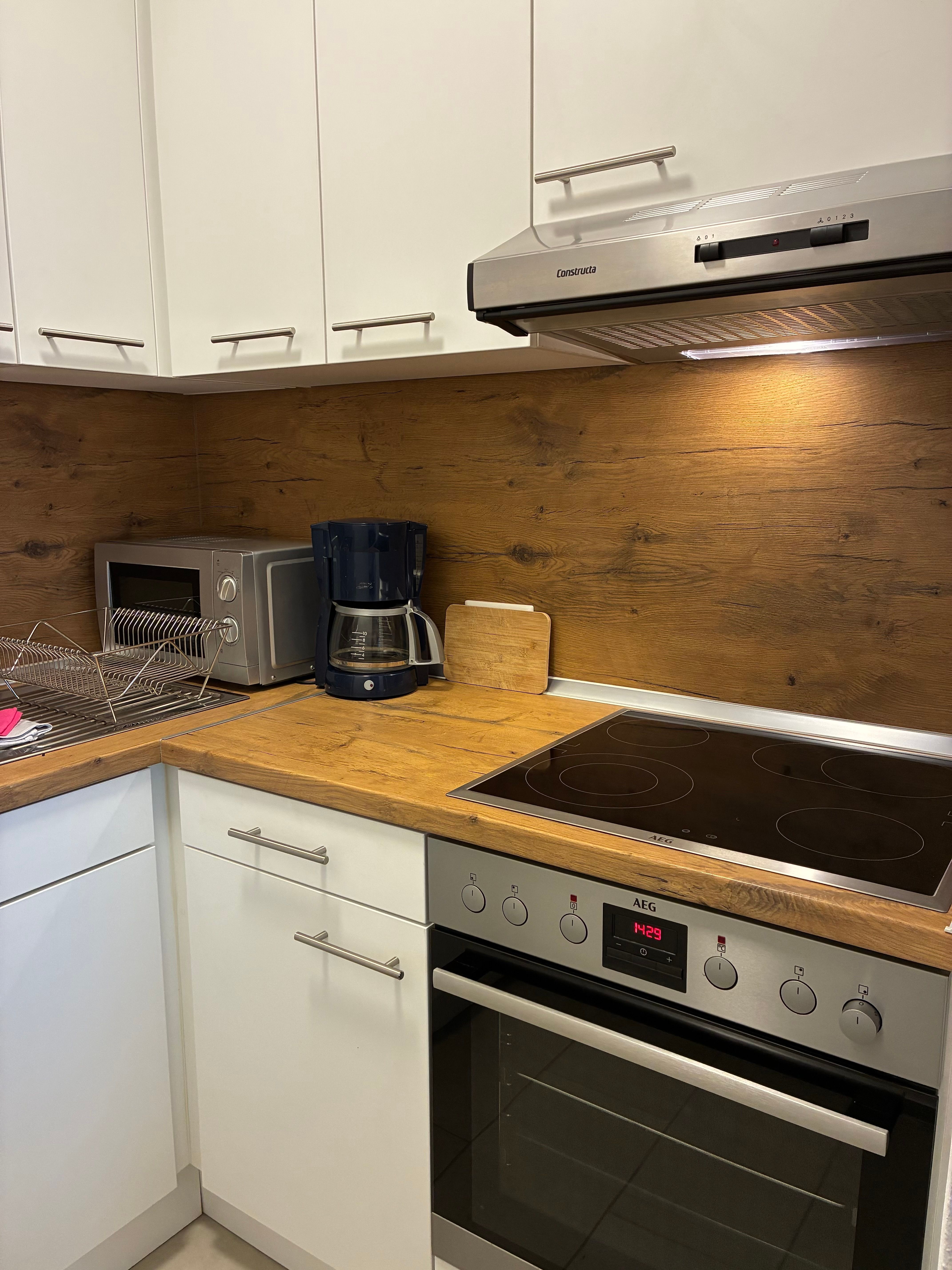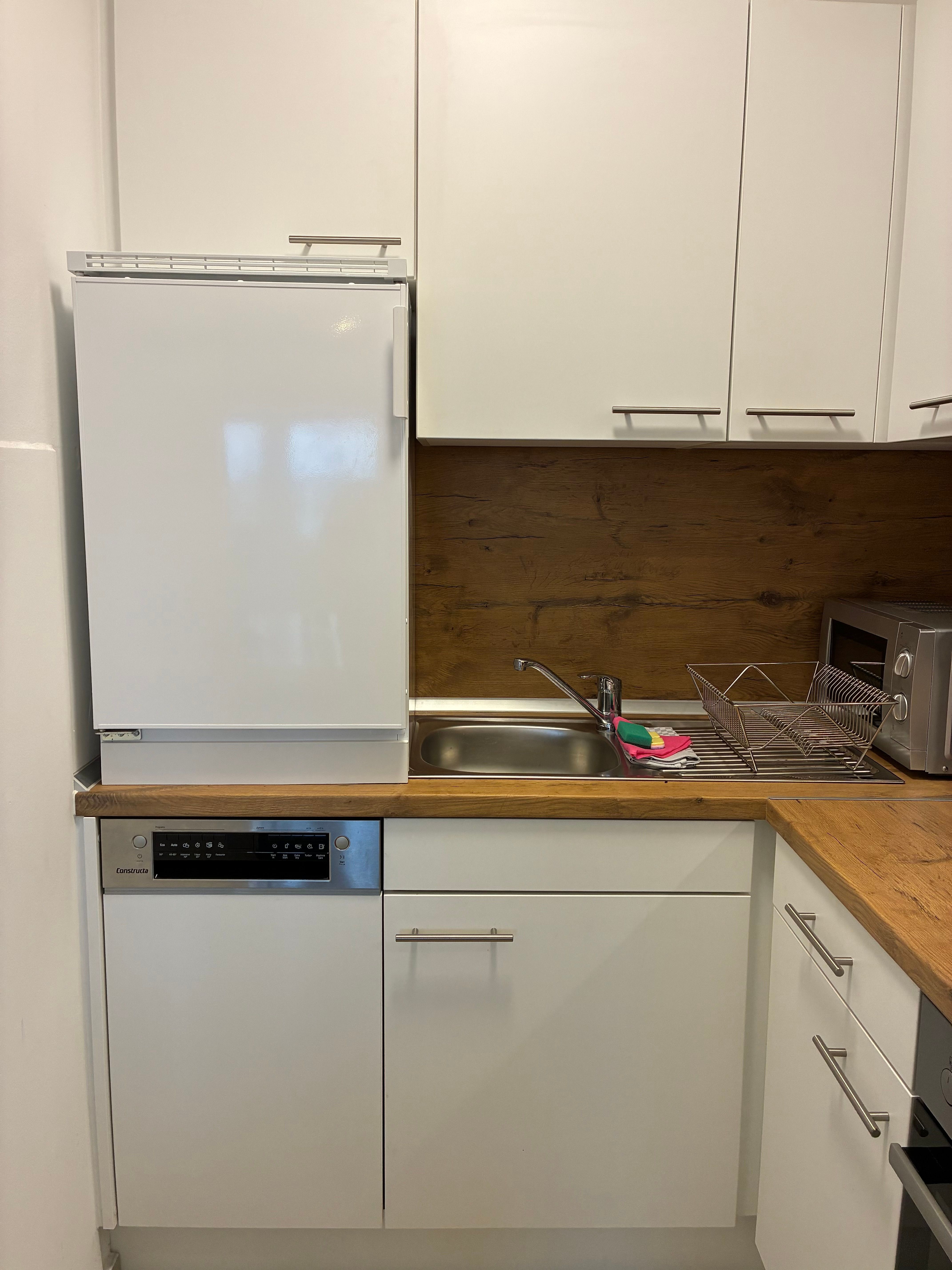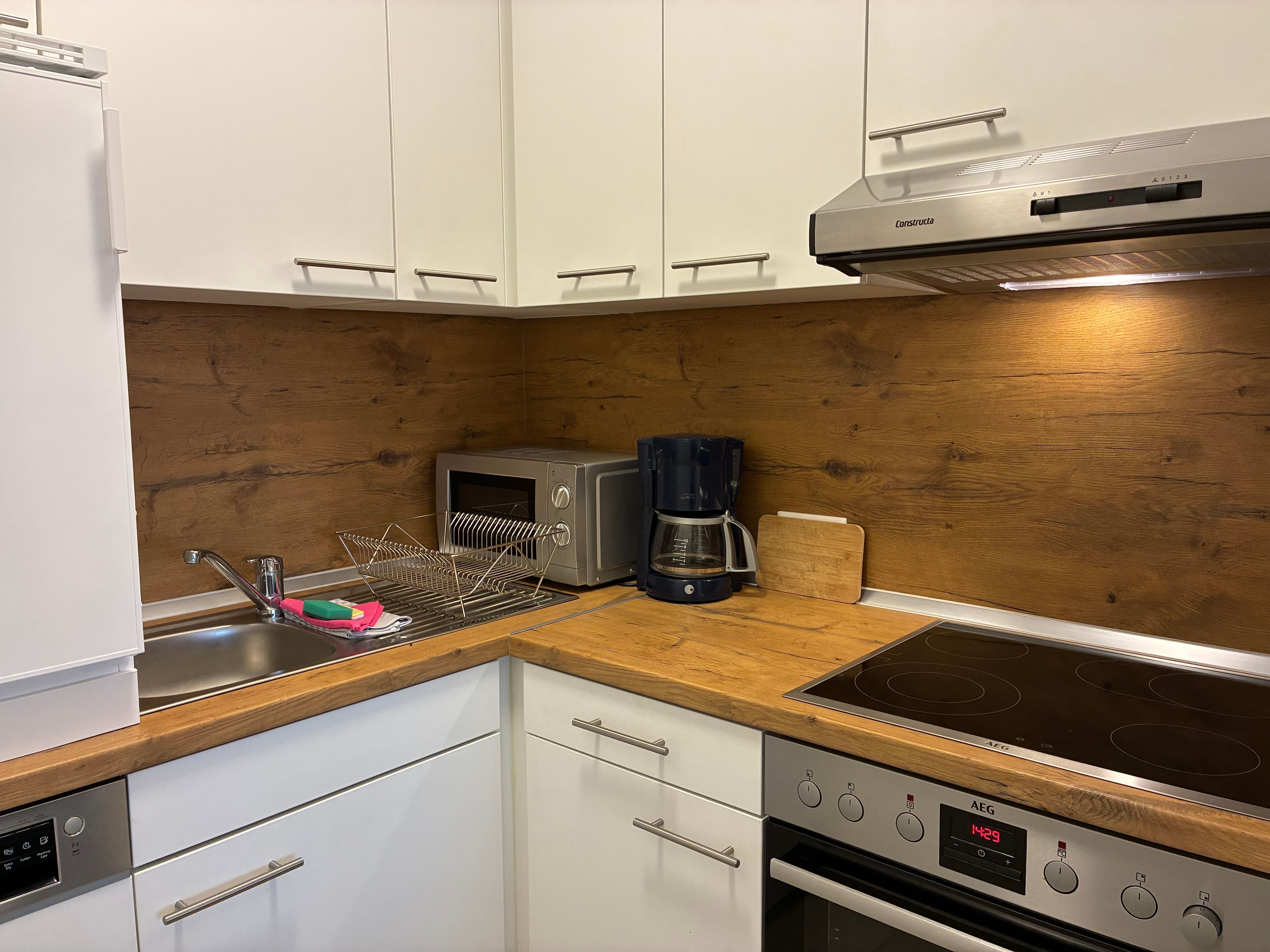 Die Küche ist als helle Einbauküche gestaltet und vollständig eingerichtet. Sie verfügt über eine Kaffeemaschine, eine Gefriermöglichkeit sowie einen Geschirrspüler und bietet damit alles, was für die Selbstversorgung im Urlaub benötigt wird. Das helle Duschbad fügt sich harmonisch in das Gesamtbild des Appartements ein.