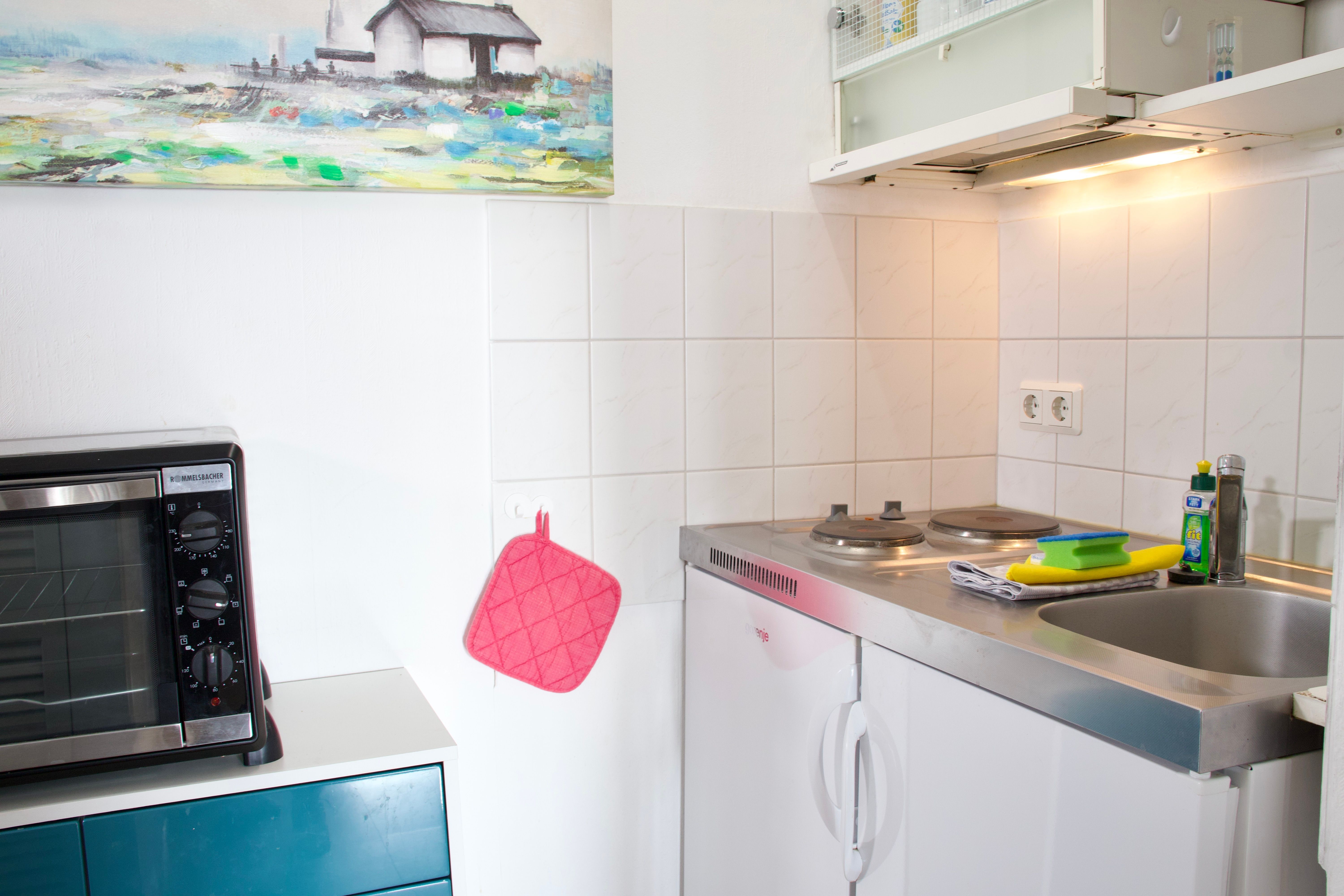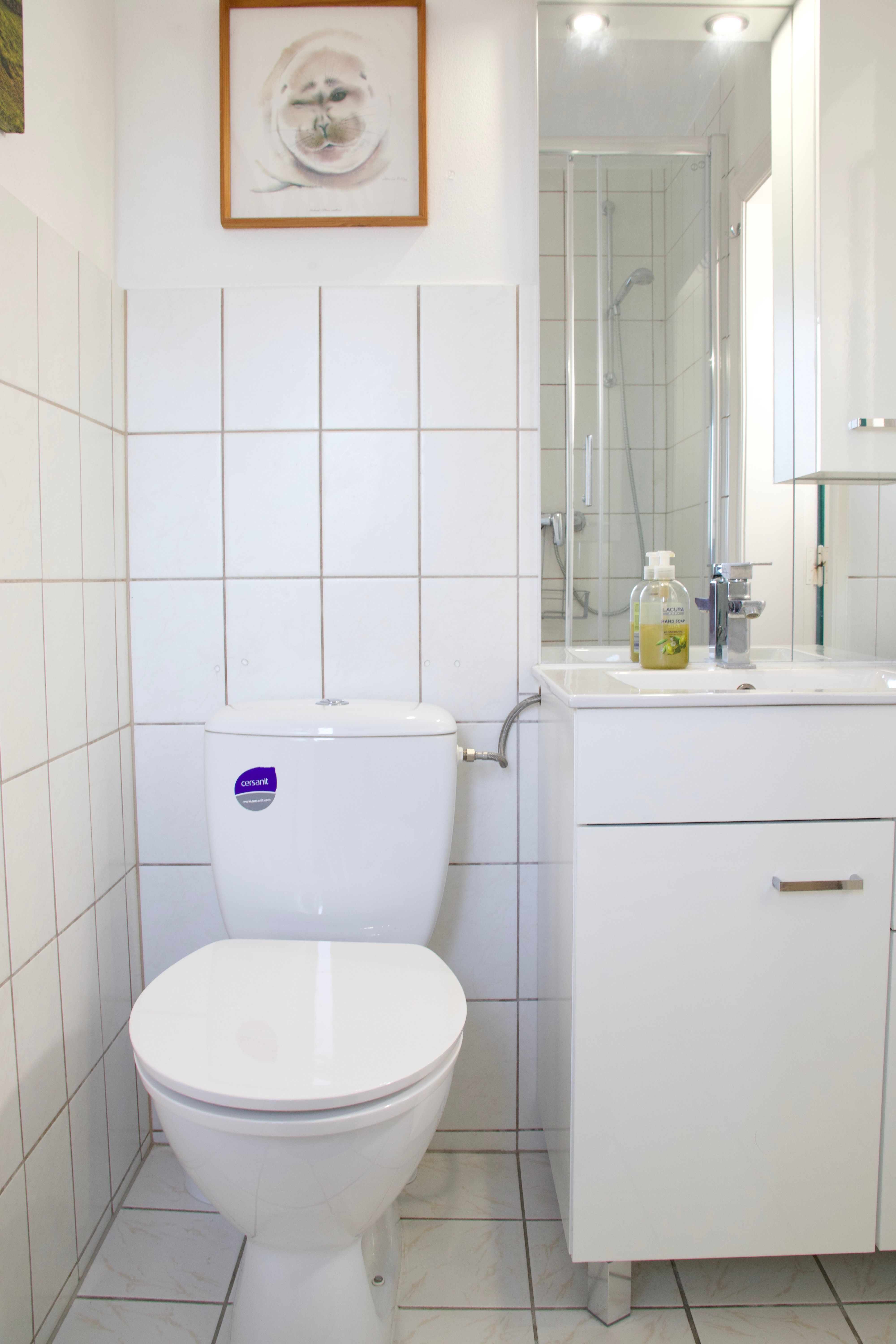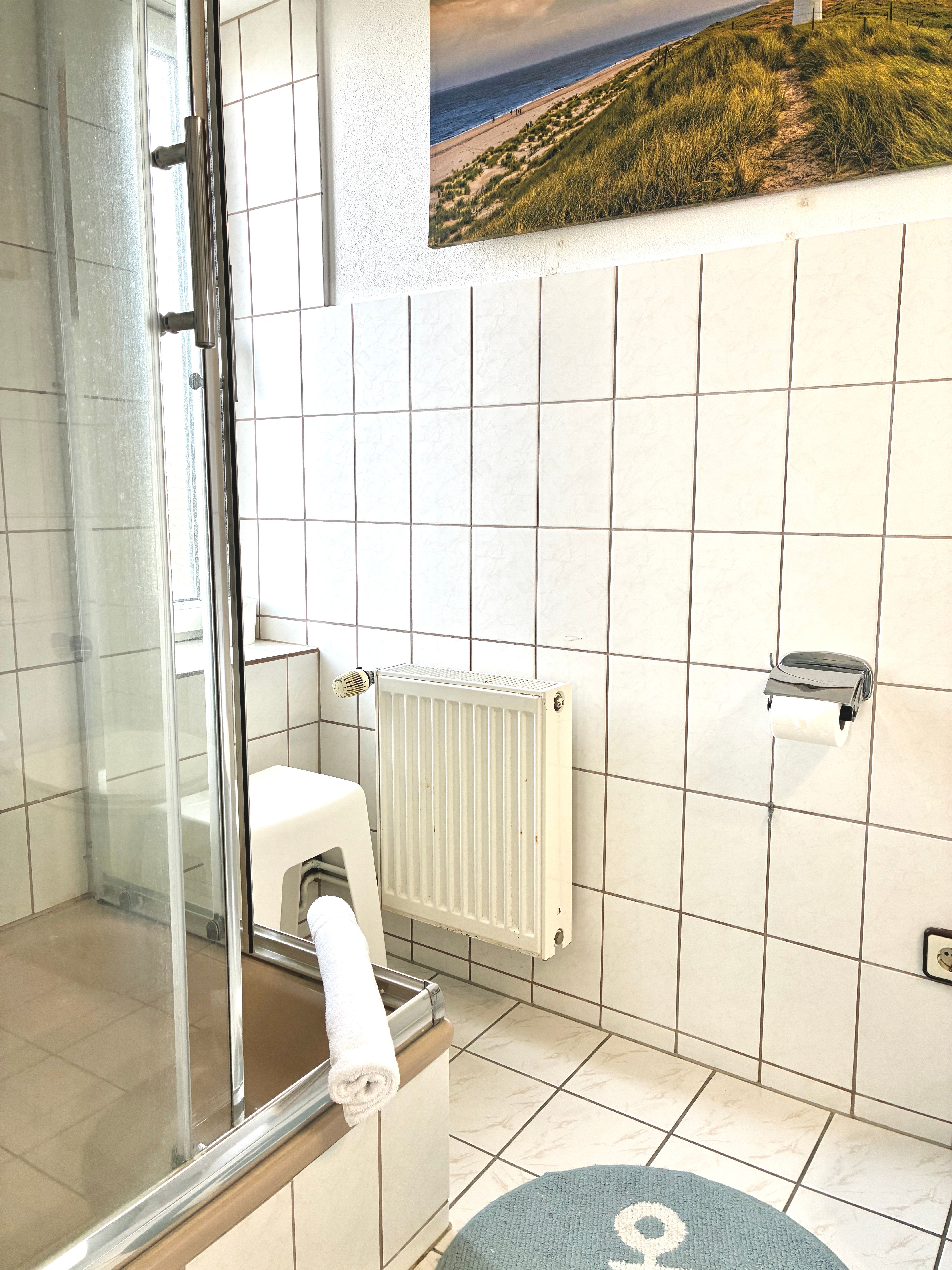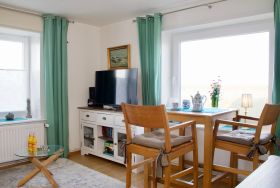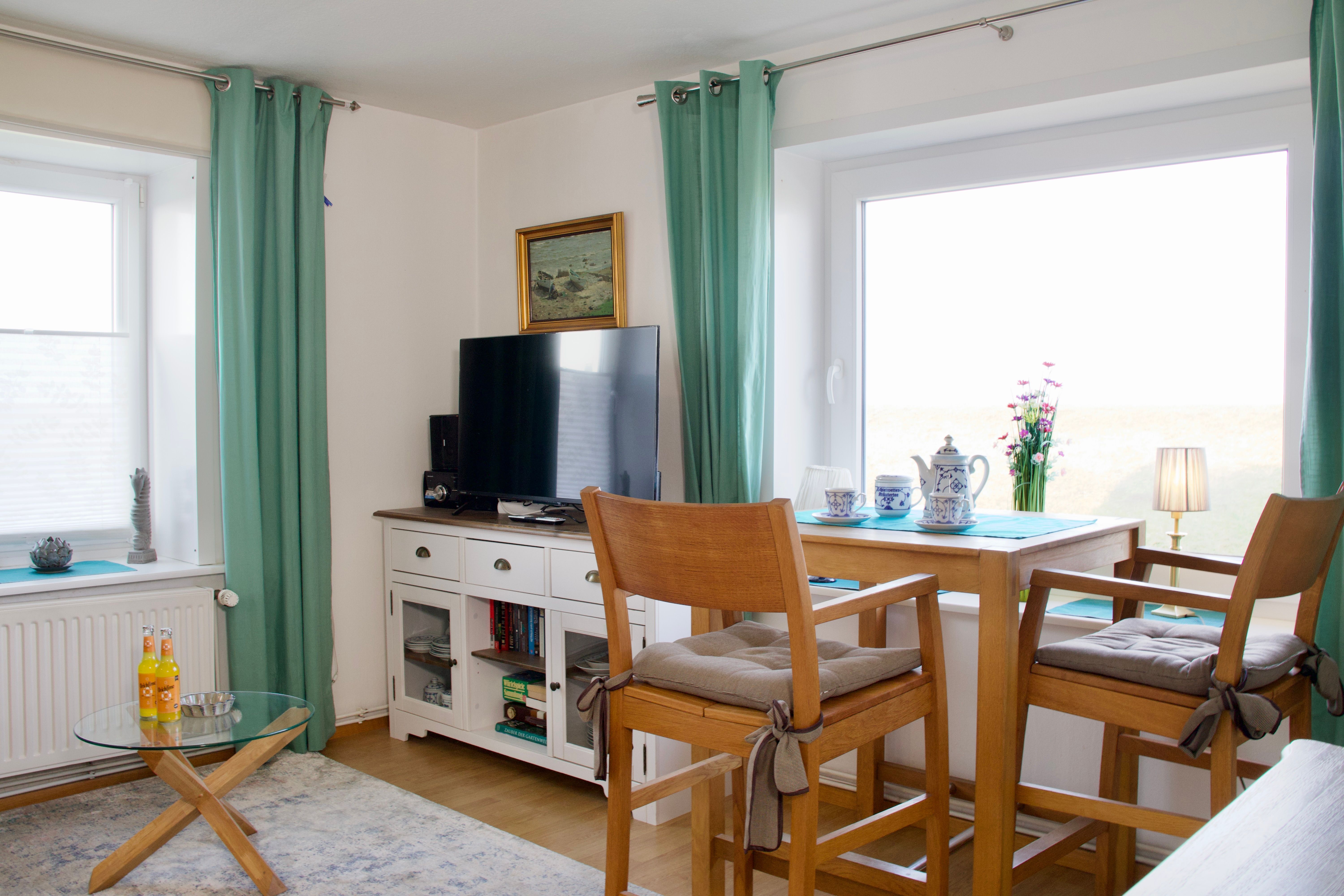 Die Wohnküche bildet den Mittelpunkt der Wohnung. Der Esstisch steht direkt am Fenster und ermöglicht einen freien Blick nach draußen, sodass Mahlzeiten stets von der Küstenlandschaft und dem Meer begleitet werden. Die Küche lässt keine Wünsche für die Selbstversorgung im Urlaub offen und verfügt unter anderem über eine Kaffeemaschine sowie eine Gefriermöglichkeit. Von der Wohnküche aus gelangen Sie direkt in das helle und freundlich gestaltete Duschbad.