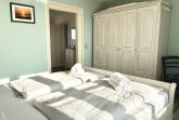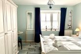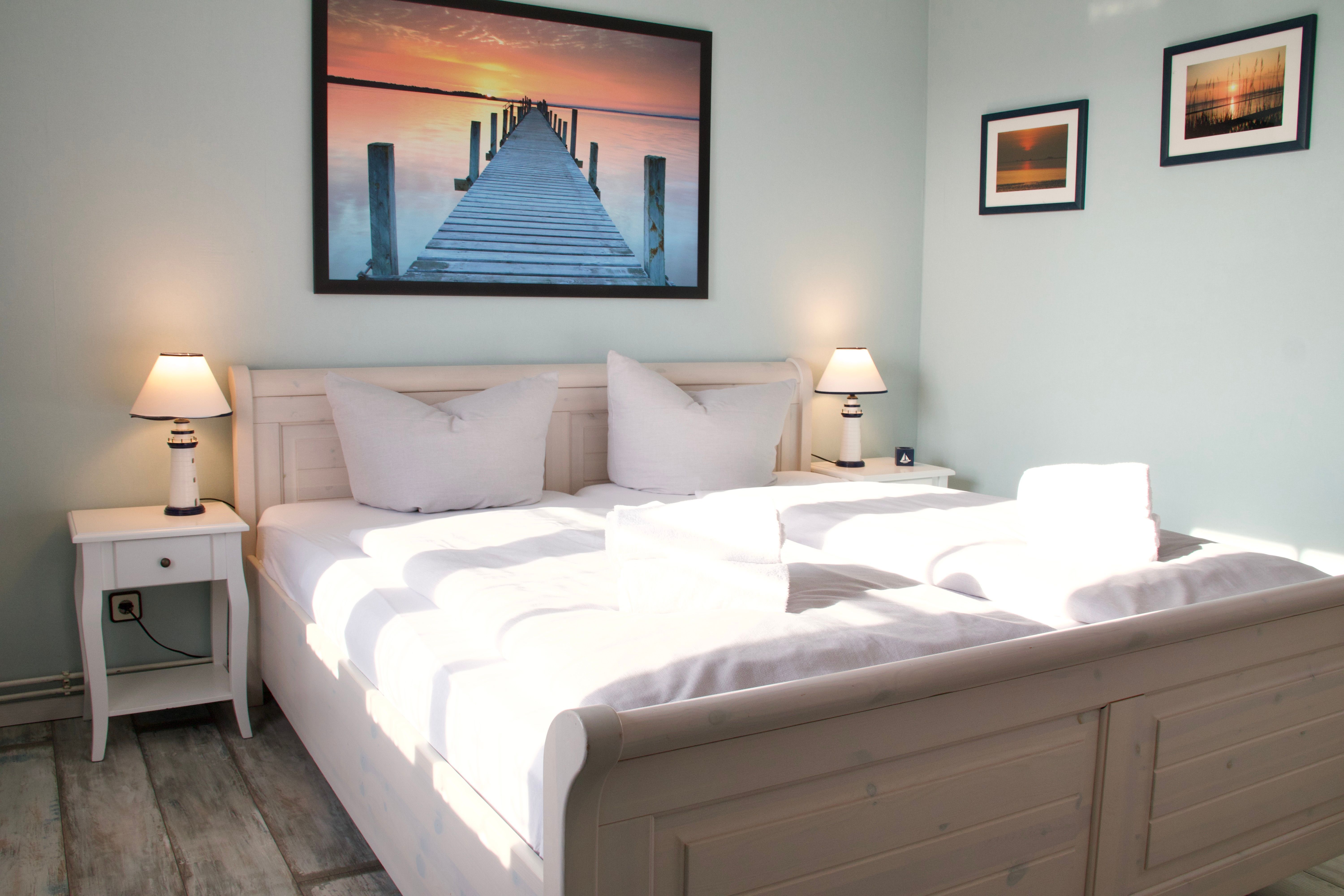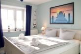 Die rund 38 Quadratmeter große Wohnung ist für zwei Personen eingerichtet und überzeugt durch eine ruhige, klar strukturierte Gestaltung. Natürliche Holzelemente in den Möbeln verleihen den Räumen eine warme, angenehme Atmosphäre. Das Schlafzimmer ist mit einem Doppelbett und einem Kleiderschrank ausgestattet und bietet einen übersichtlichen, aufgeräumten Rückzugsort für erholsame Nächte.