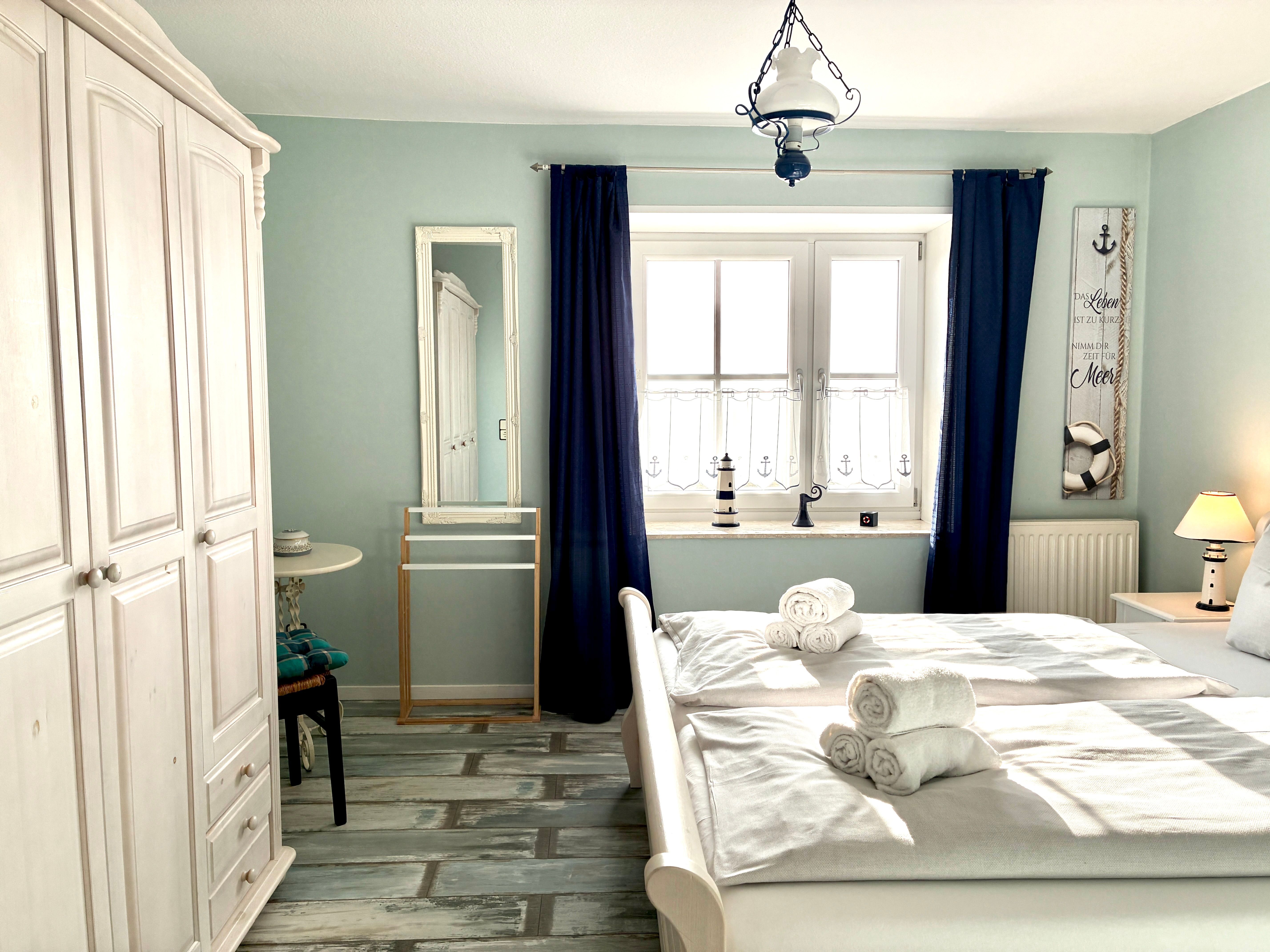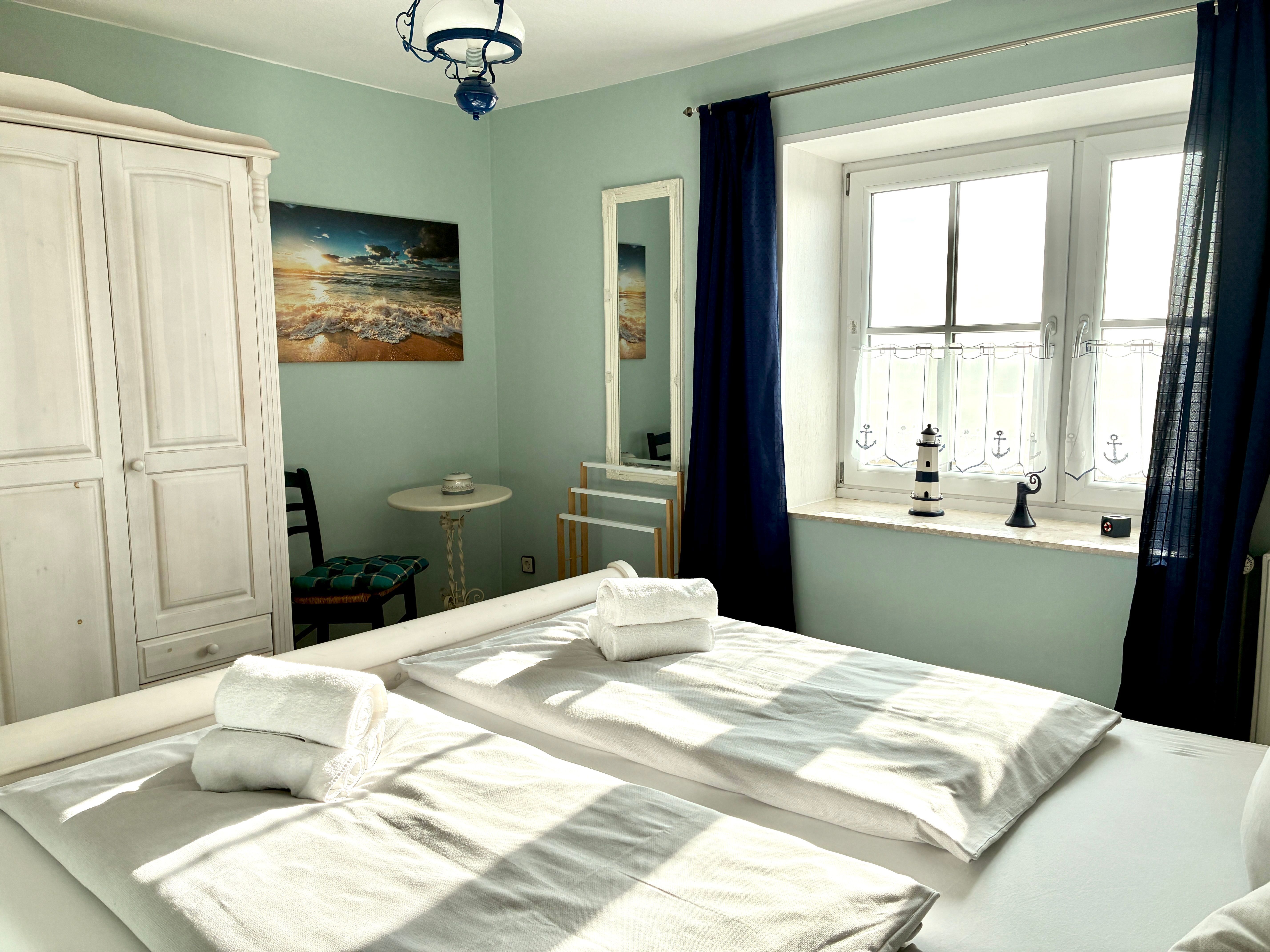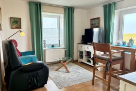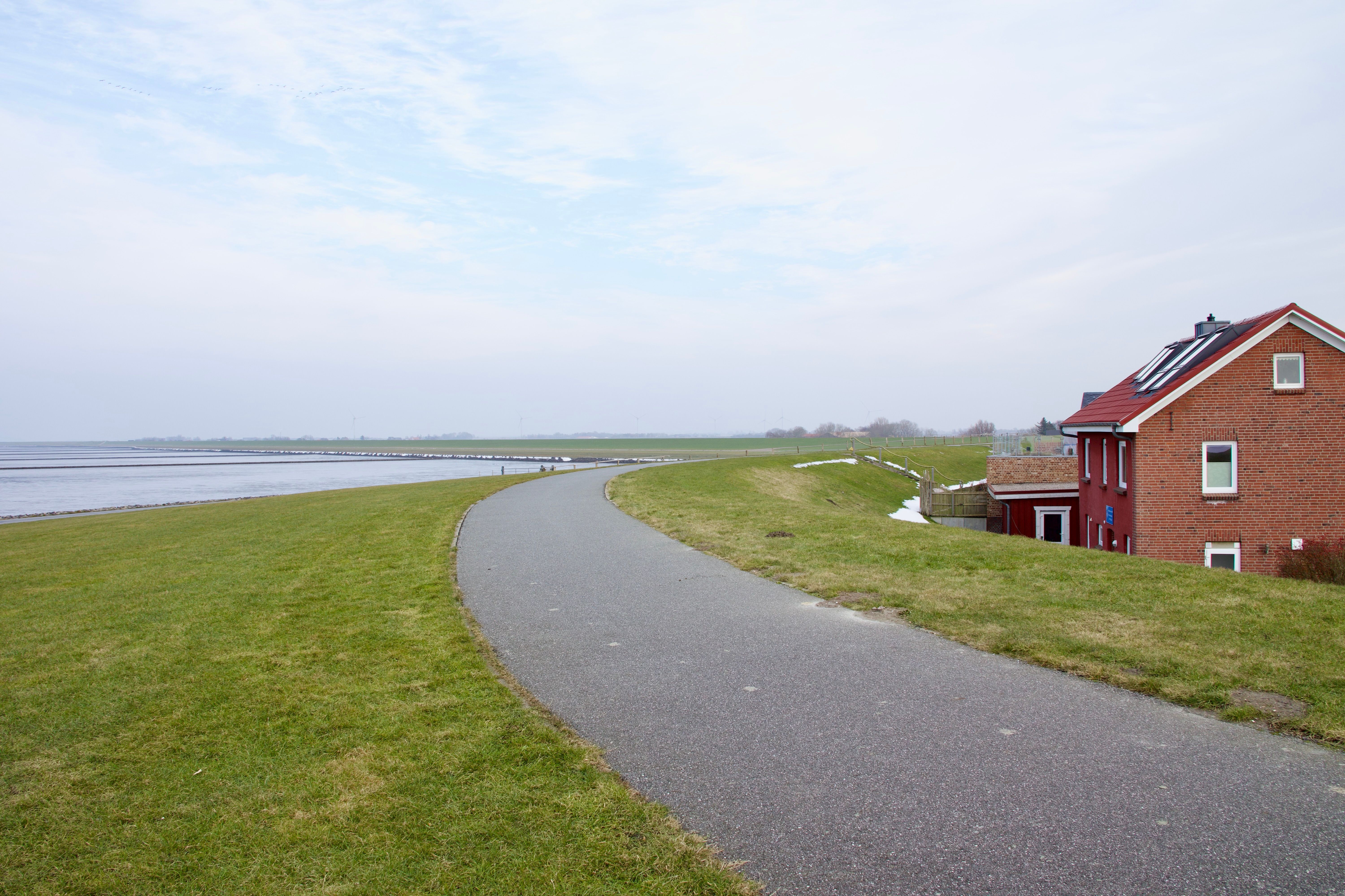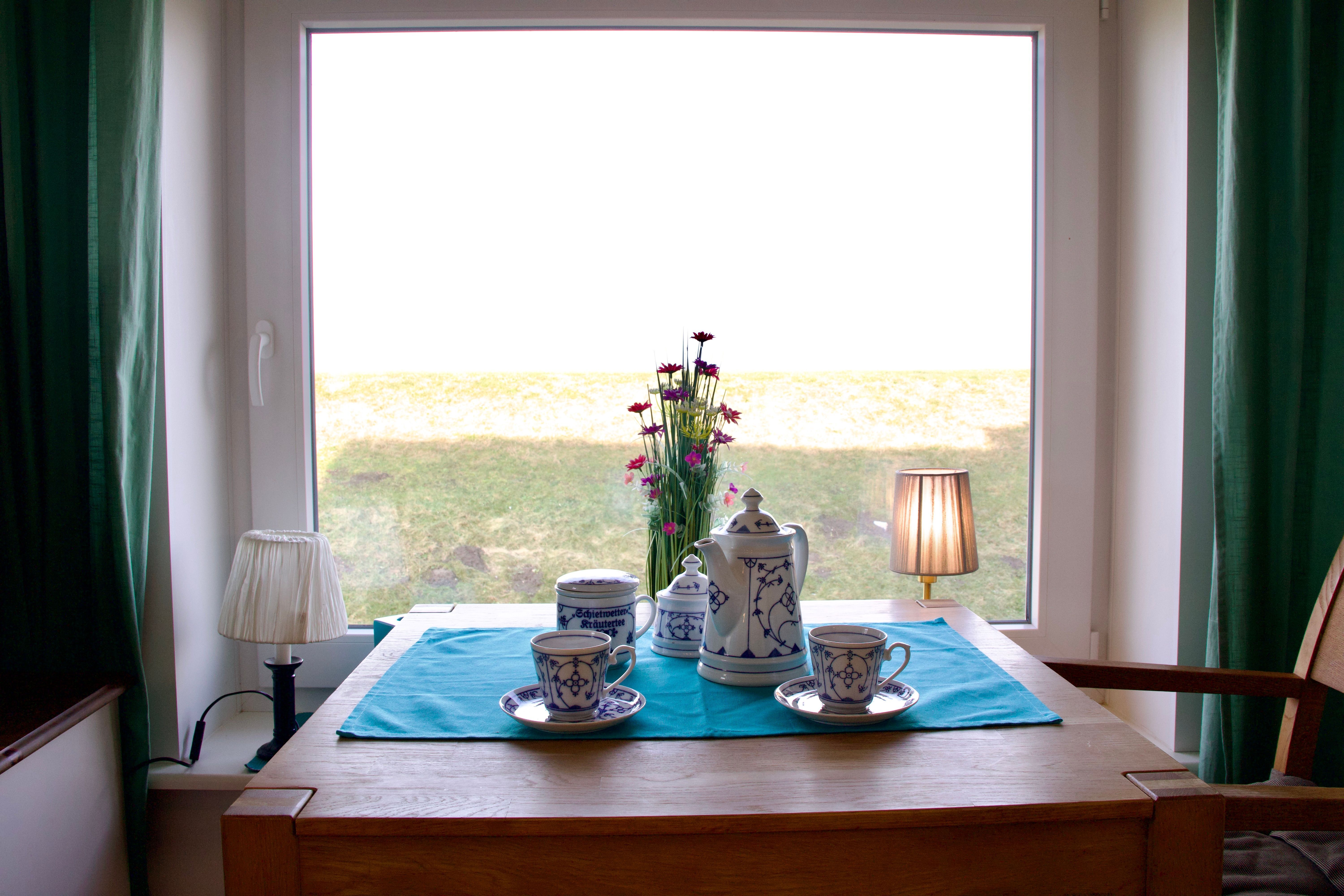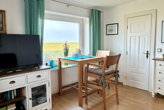 Die Ferienwohnung Westwind befindet sich im ersten Obergeschoss des Kapitänshus und liegt direkt am Außendeich. Durch diese besondere Lage eröffnet sich ein weiter, freier Blick über den Deich auf die Halligen, die Insel Pellworm und die offene Nordsee. Der Meerblick egleitet den Aufenthalt hier nahezu durchgehend und macht die Weite der Nordsee zu einem festen Bestandteil des Wohngefühls.