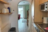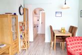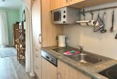 Die Küche ist über einen Bogen mit dem Wohnbereich verbunden und fügt sich harmonisch in das Raumkonzept ein. Sie ist funktional ausgestattet und verfügt über eine Spülmaschine, eine Gefriermöglichkeit sowie eine Kaffeemaschine. Ein Fenster sorgt auch hier für zusätzliches Tageslicht und unterstreicht den wohnlichen Charakter.