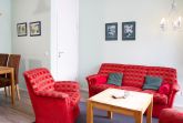 Im Erdgeschoss befindet sich der offen gestaltete Wohn- und Essbereich. Große Terrassentüren und Fenster sorgen für viel Tageslicht und verleihen dem Raum eine freundliche, offene Wirkung. Der Wohnbereich lädt mit seiner behaglichen Gestaltung zu entspannten Stunden ein und öffnet sich direkt zur Südterrasse, die den Wohnraum nach draußen erweitert. Ein Strandkorb steht hier ebenfalls zur Verfügung.