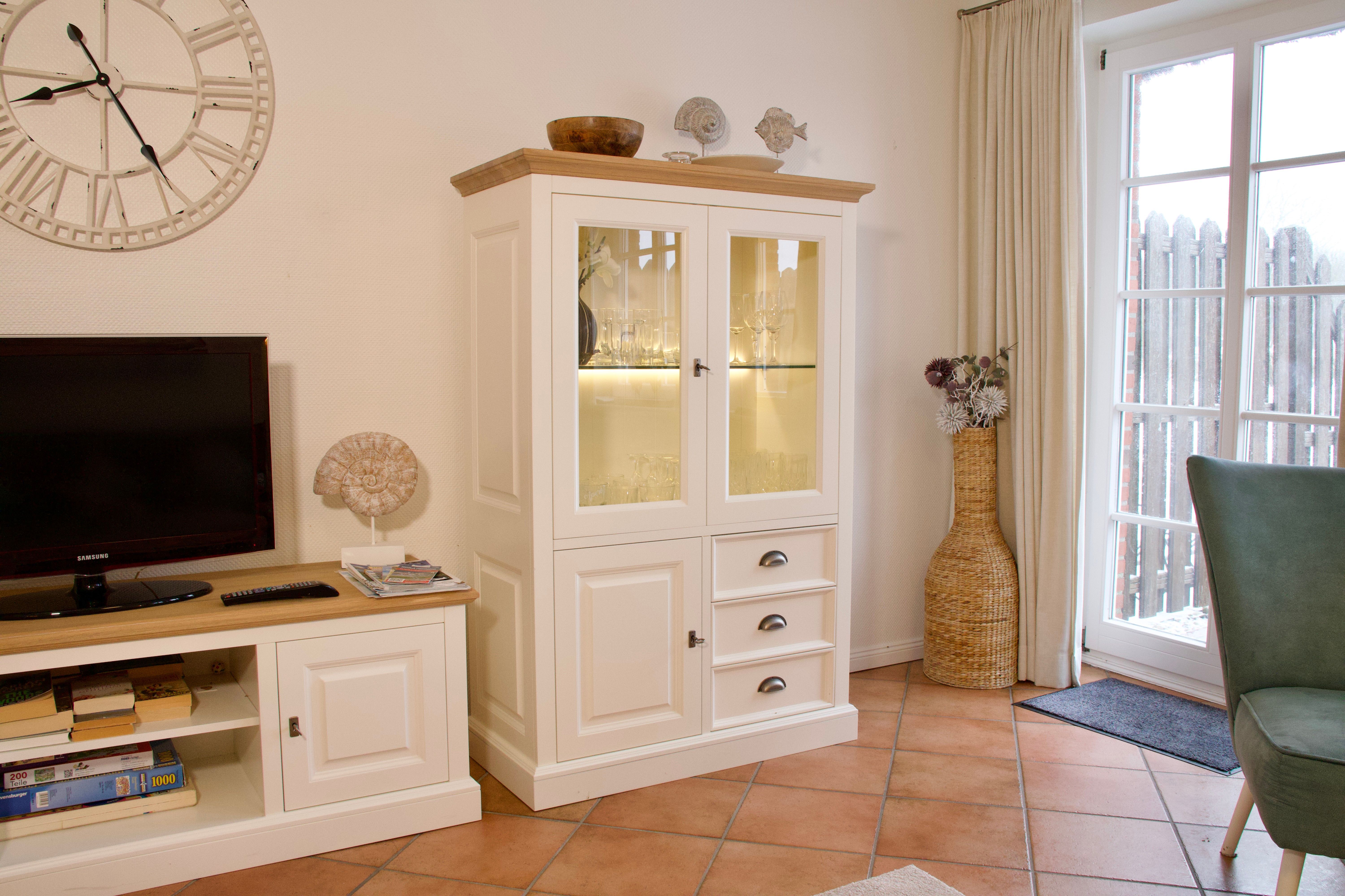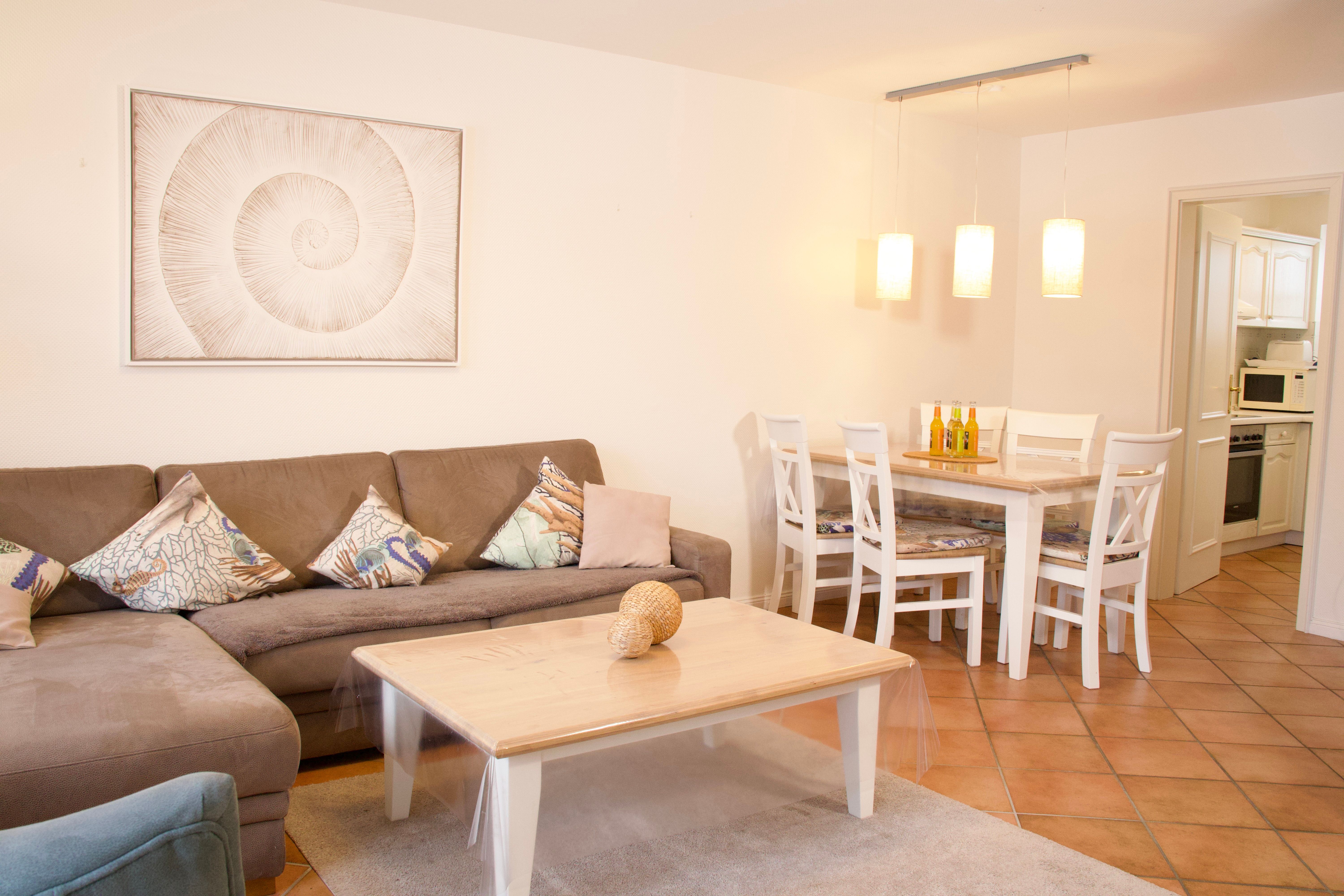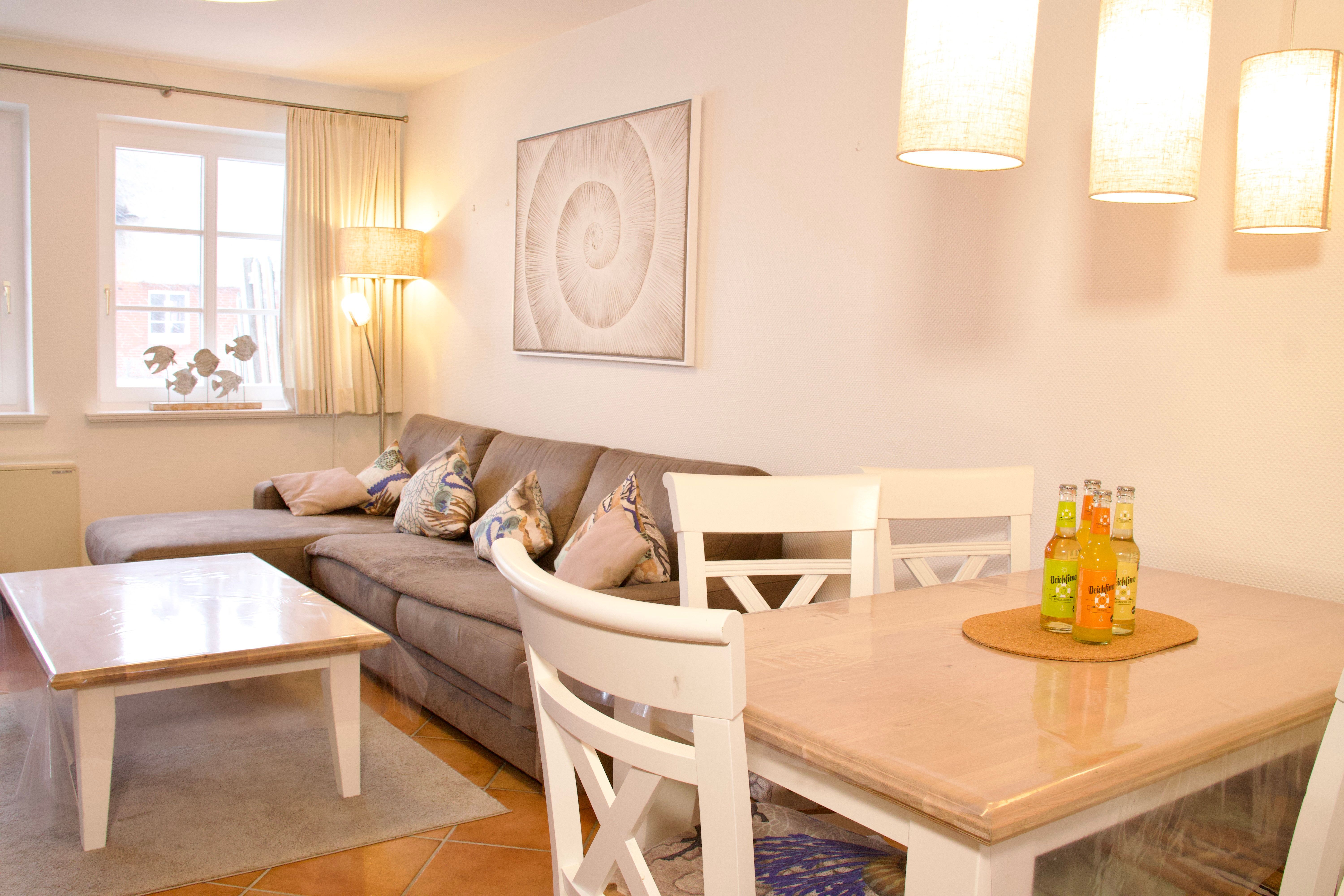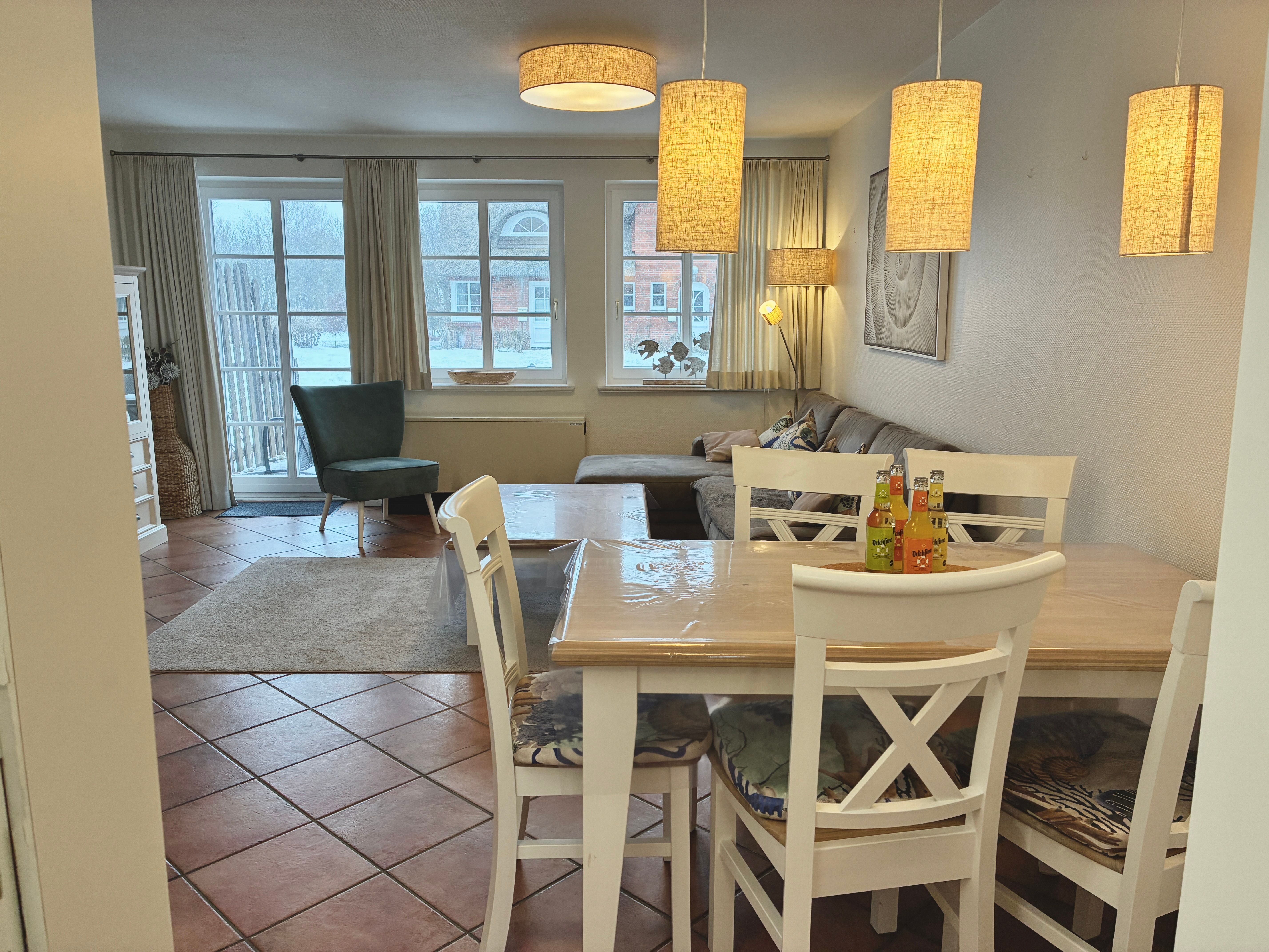 Im Erdgeschoss liegt das geräumige Wohnzimmer mit separatem Wohn- und Essbereich. Große Fenster sowie die Terrassentür sorgen für viel Tageslicht und schaffen eine freundliche, helle Atmosphäre. Vom Wohnzimmer aus gelangen Sie direkt auf die möblierte, nach Süden ausgerichtete Terrasse mit eigenem Strandkorb, die zu entspannten Stunden im Freien einlädt.