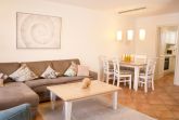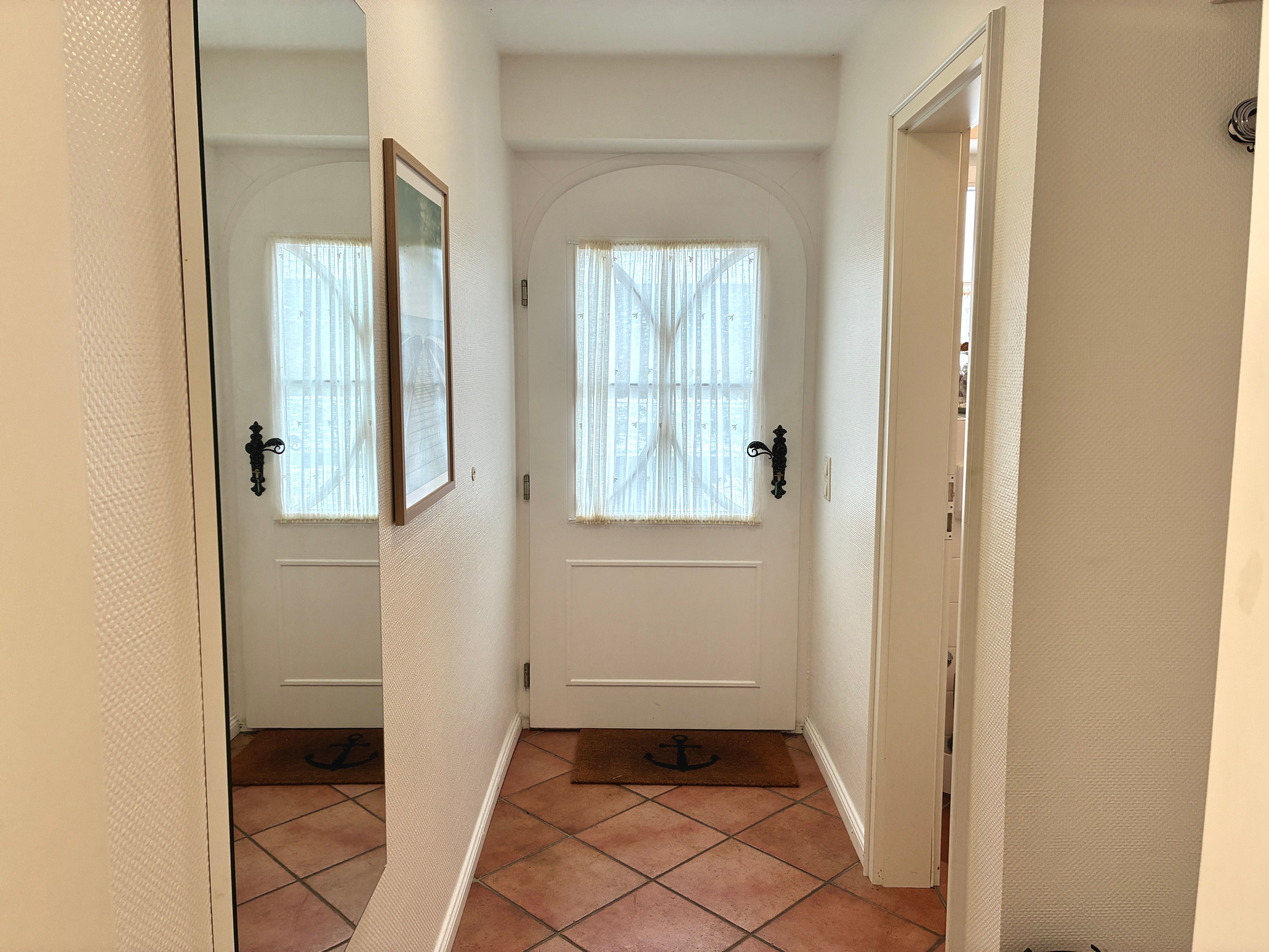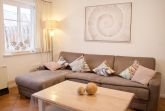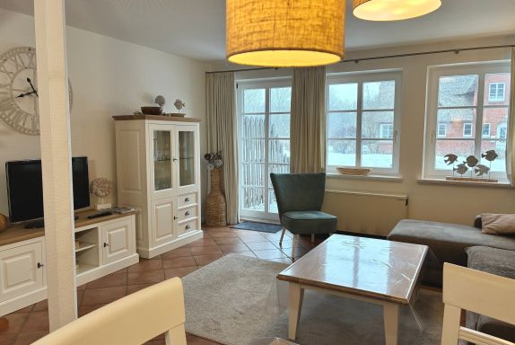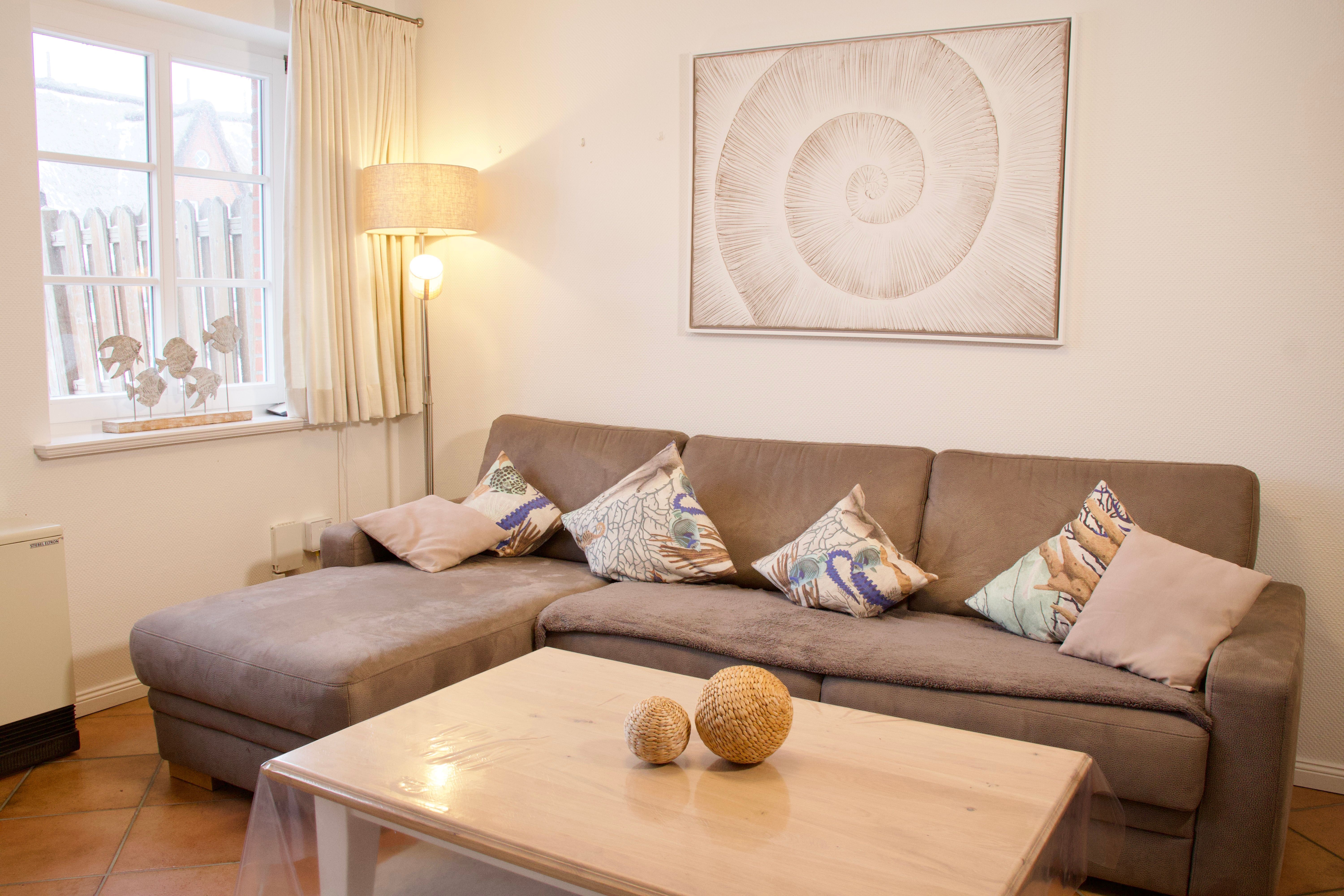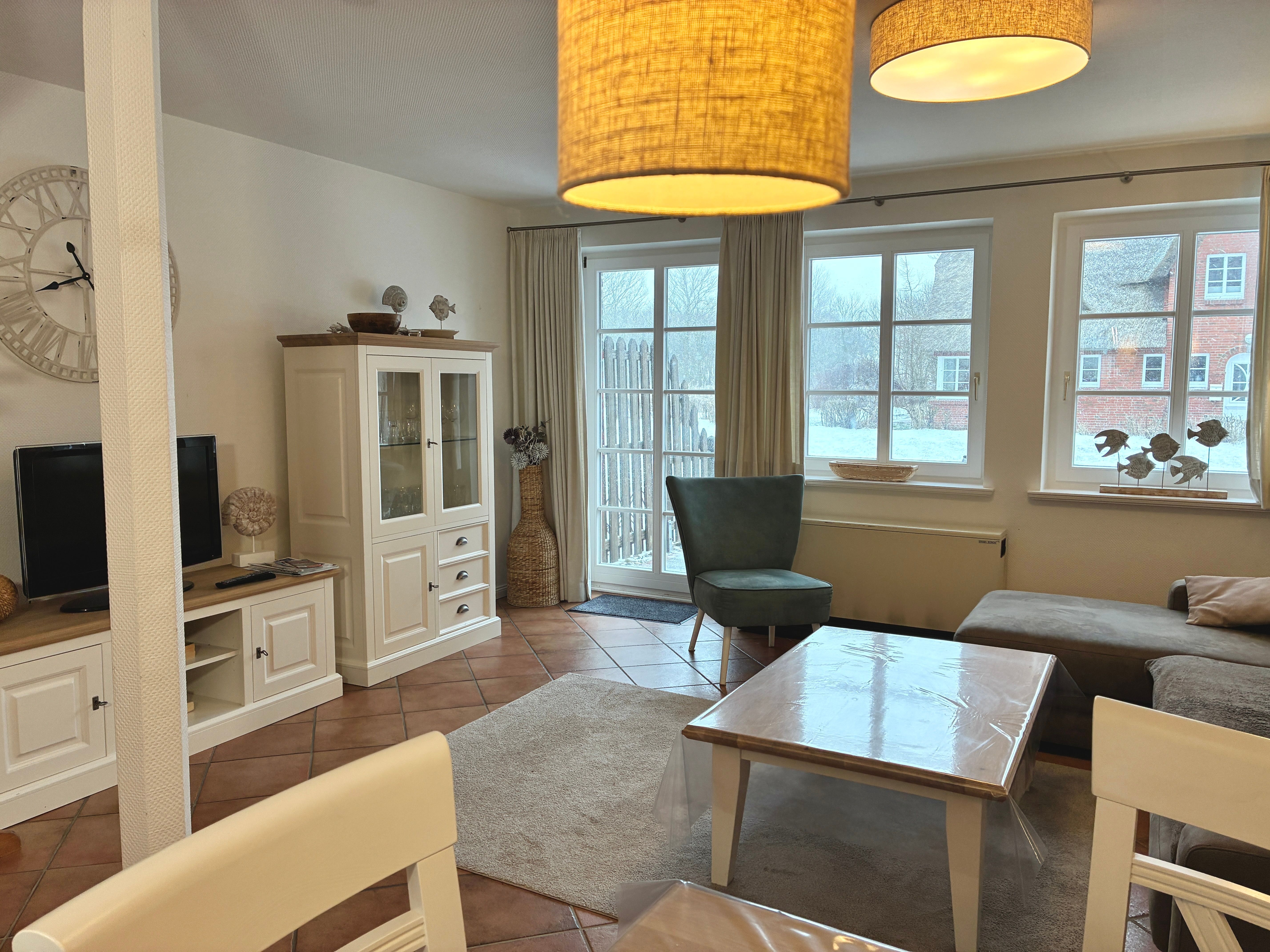 Im Erdgeschoss liegt das geräumige Wohnzimmer mit separatem Wohn- und Essbereich. Große Fenster sowie die Terrassentür sorgen für viel Tageslicht und schaffen eine freundliche, helle Atmosphäre. Vom Wohnzimmer aus gelangen Sie direkt auf die möblierte, nach Süden ausgerichtete Terrasse mit eigenem Strandkorb, die zu entspannten Stunden im Freien einlädt.