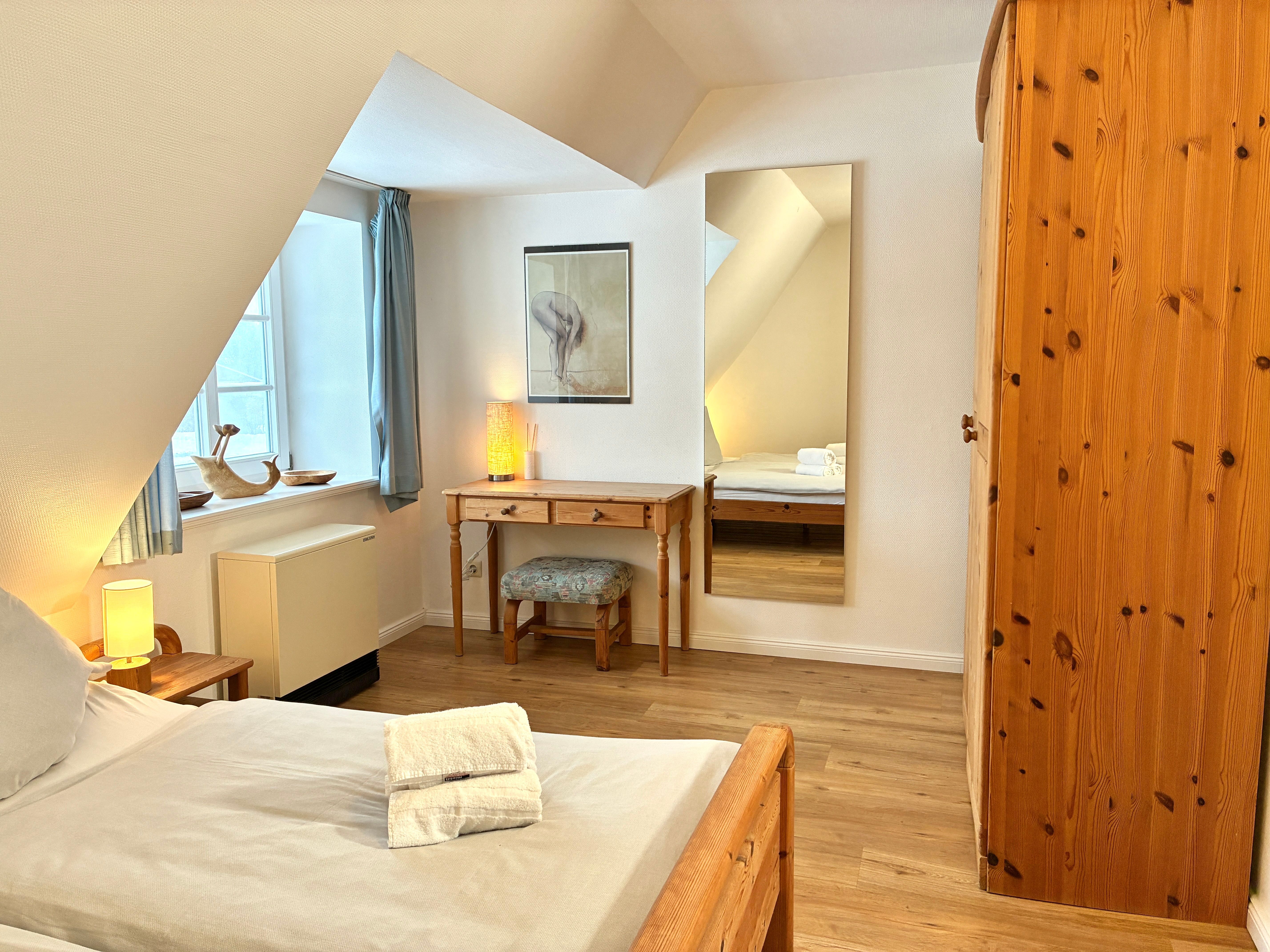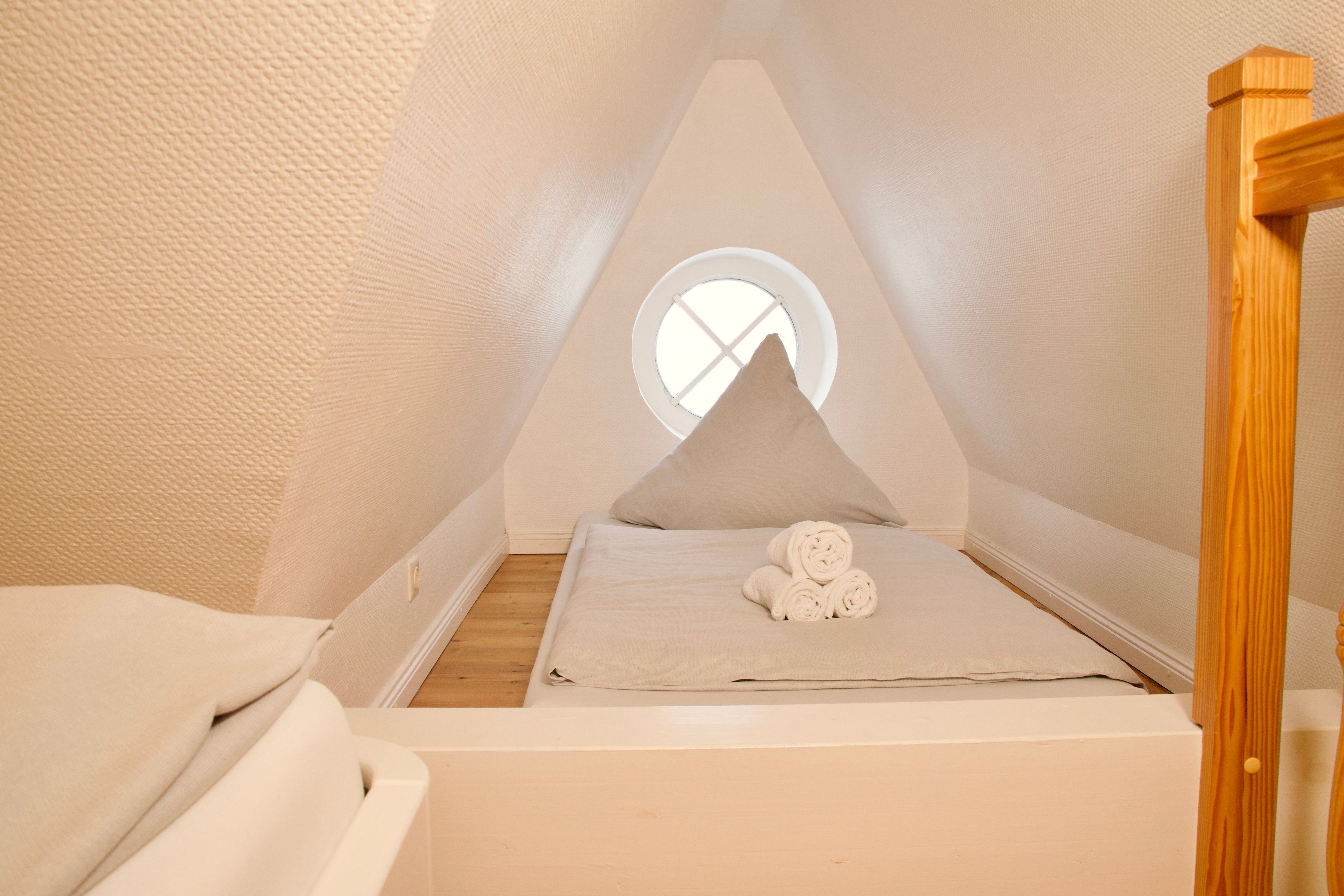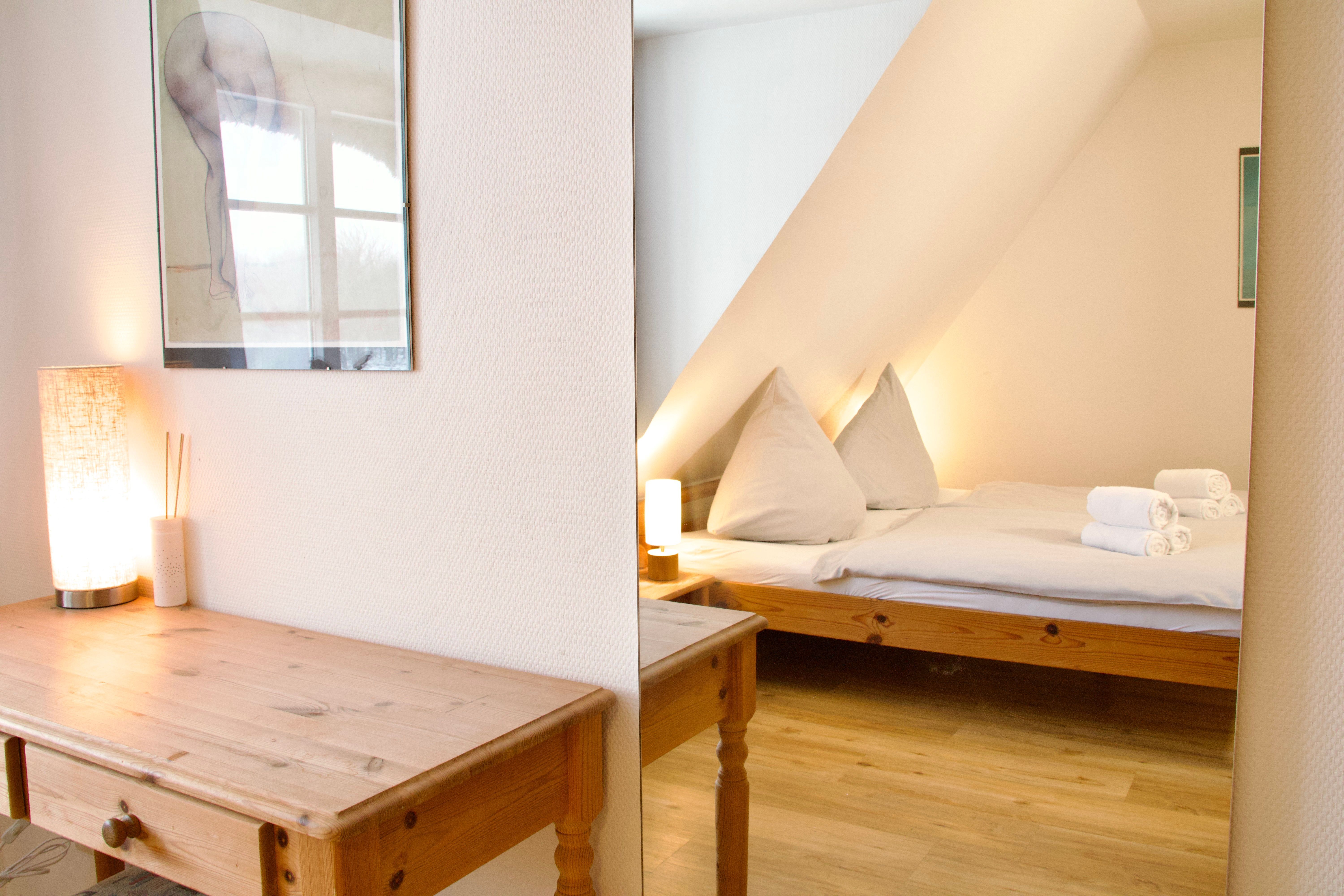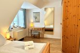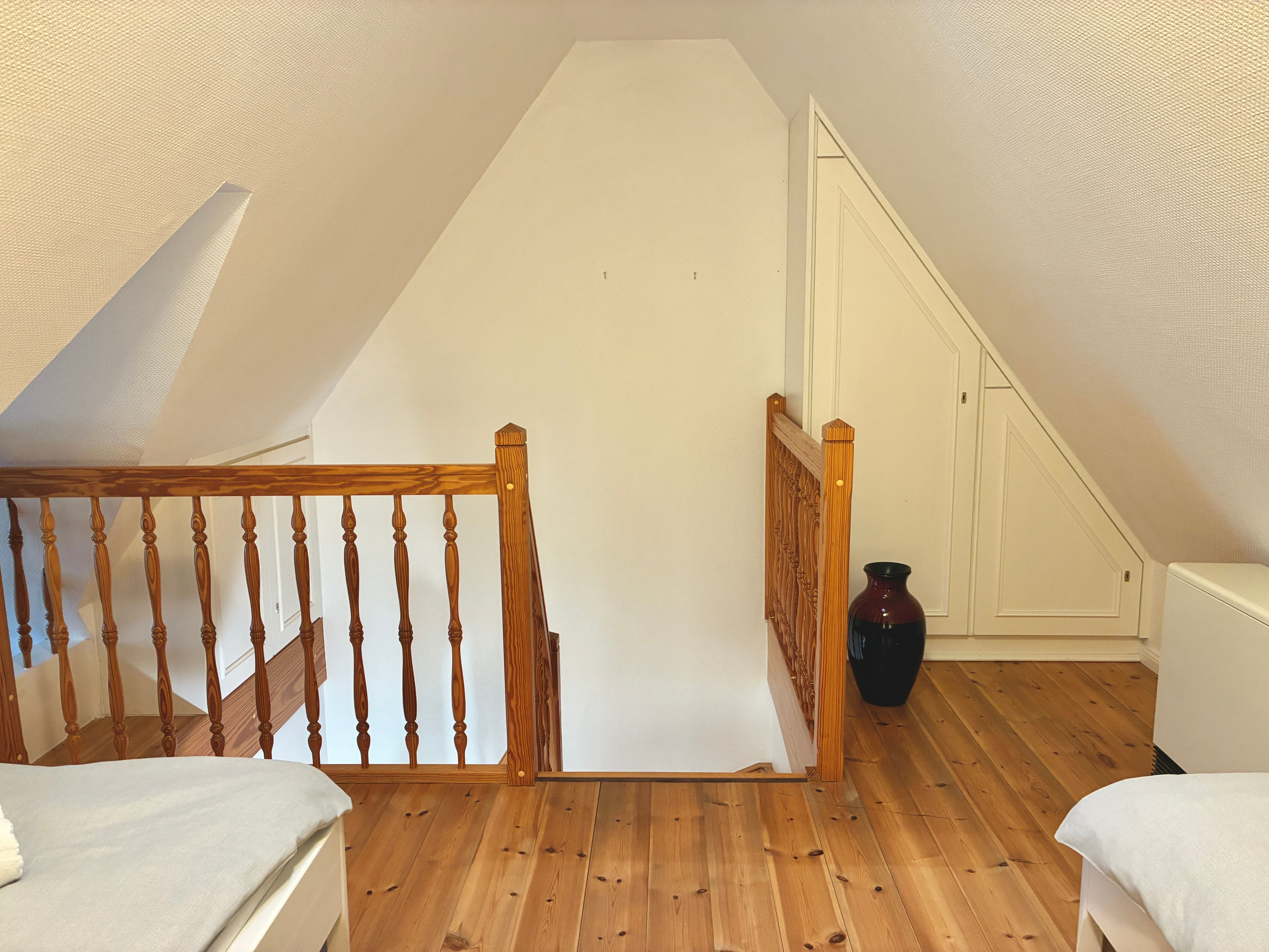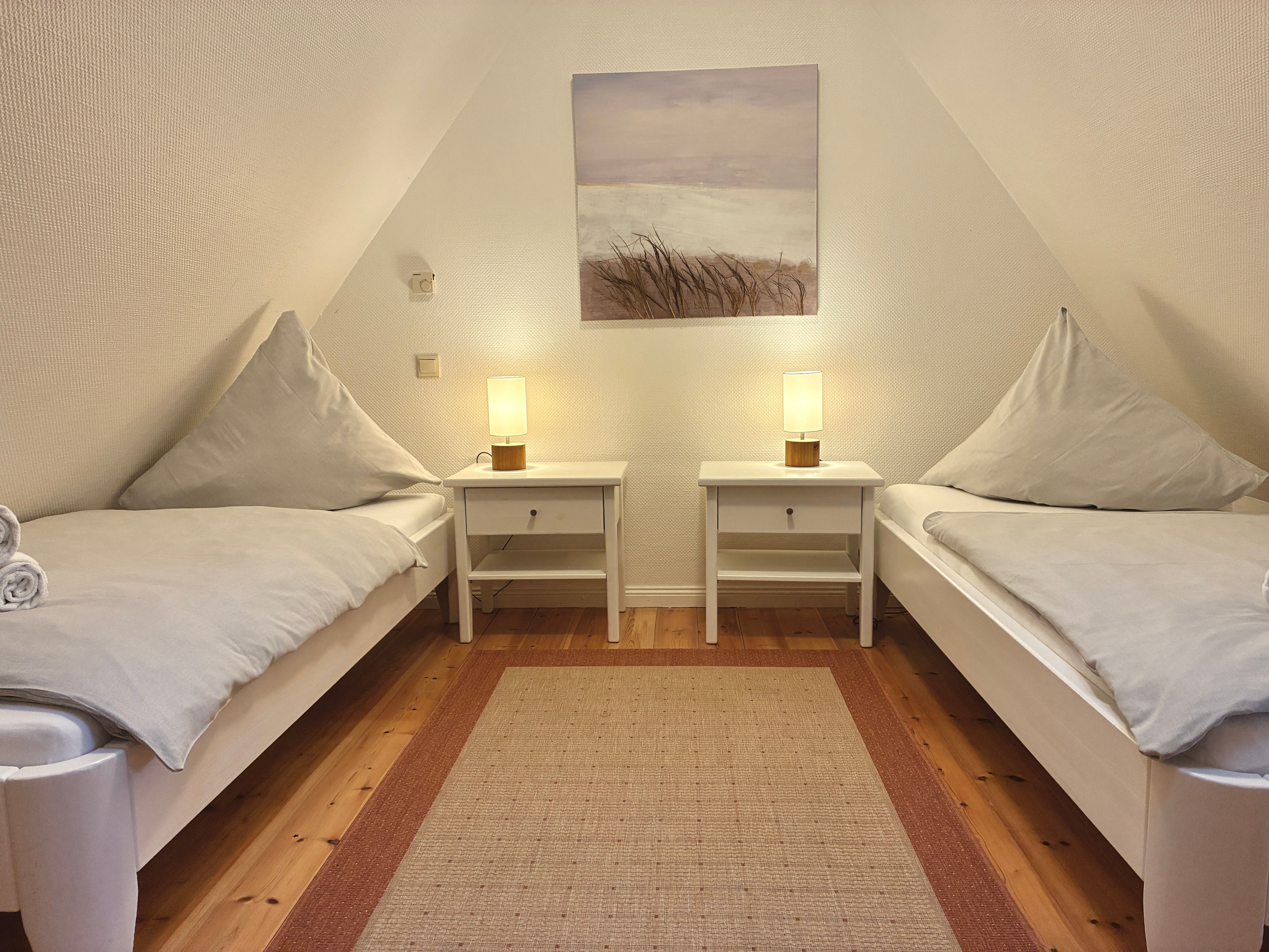Im ersten Obergeschoss befinden sich zwei Schlafzimmer, eines mit Doppelbett und eines mit zwei Einzelbetten, sowie ein Duschbad. Ein drittes Schlafzimmer mit zwei Einzelbetten liegt im ausgebauten Giebelzimmer, das offen gestaltet ist und zusätzlichen Raum bietet.