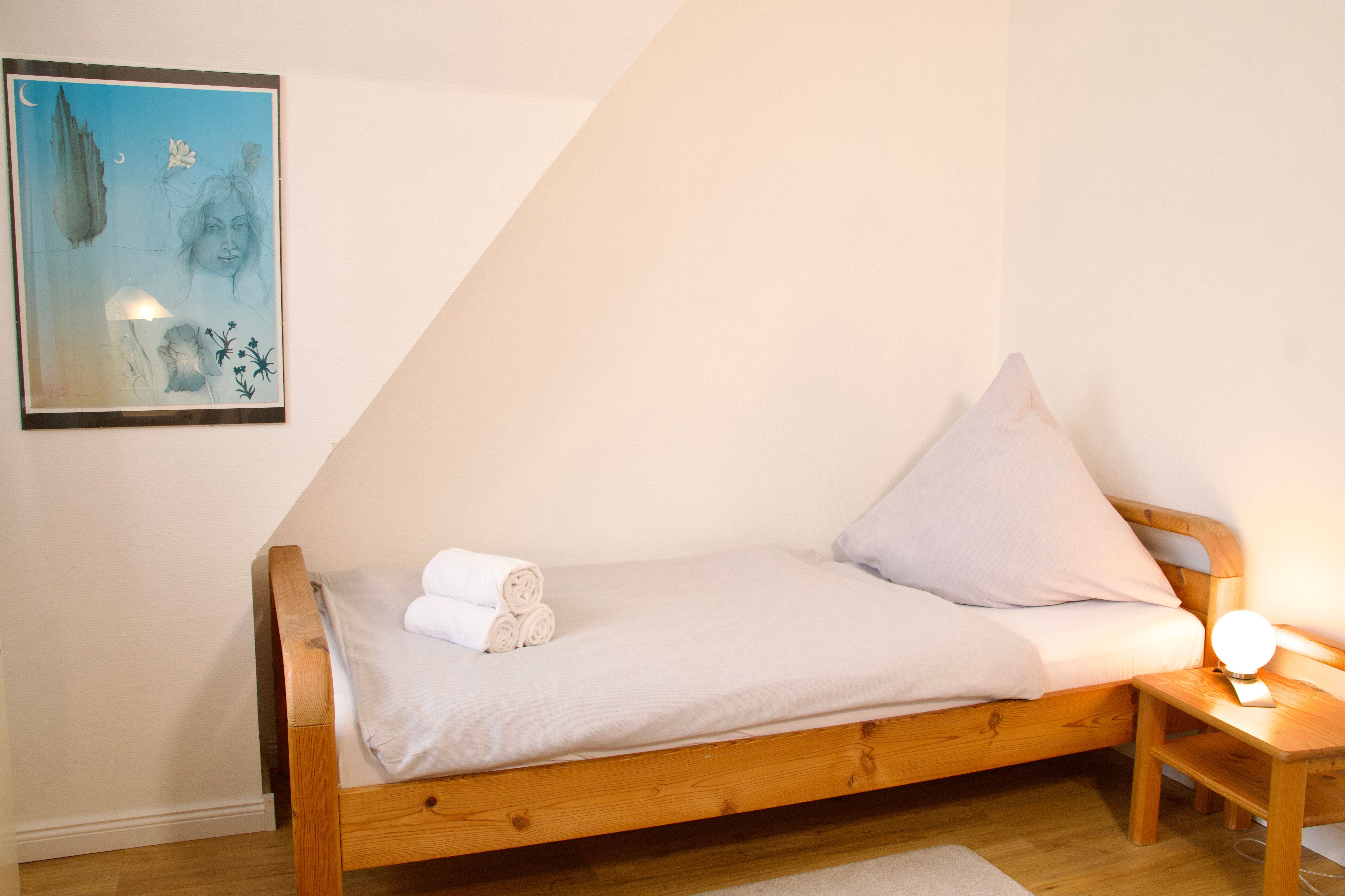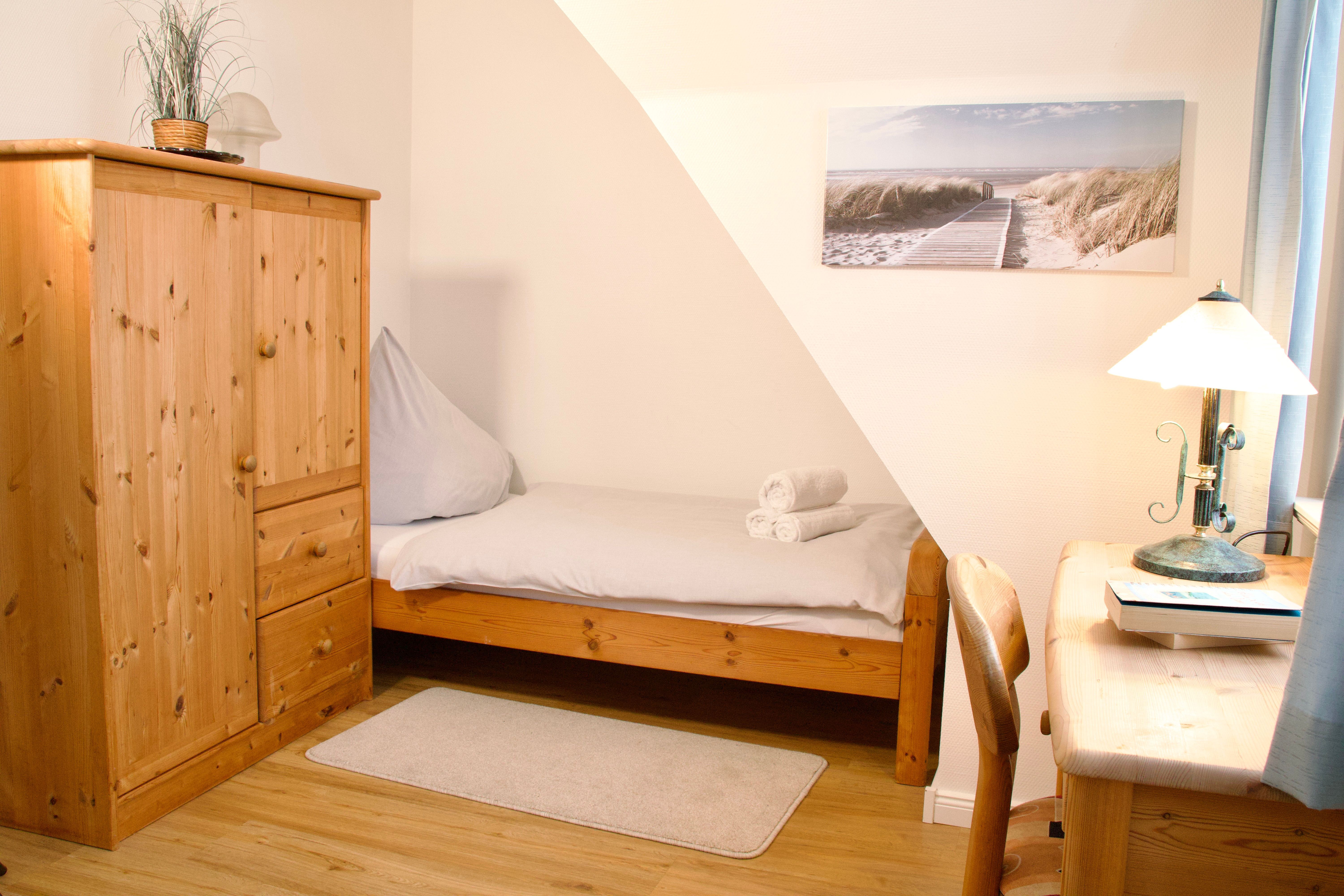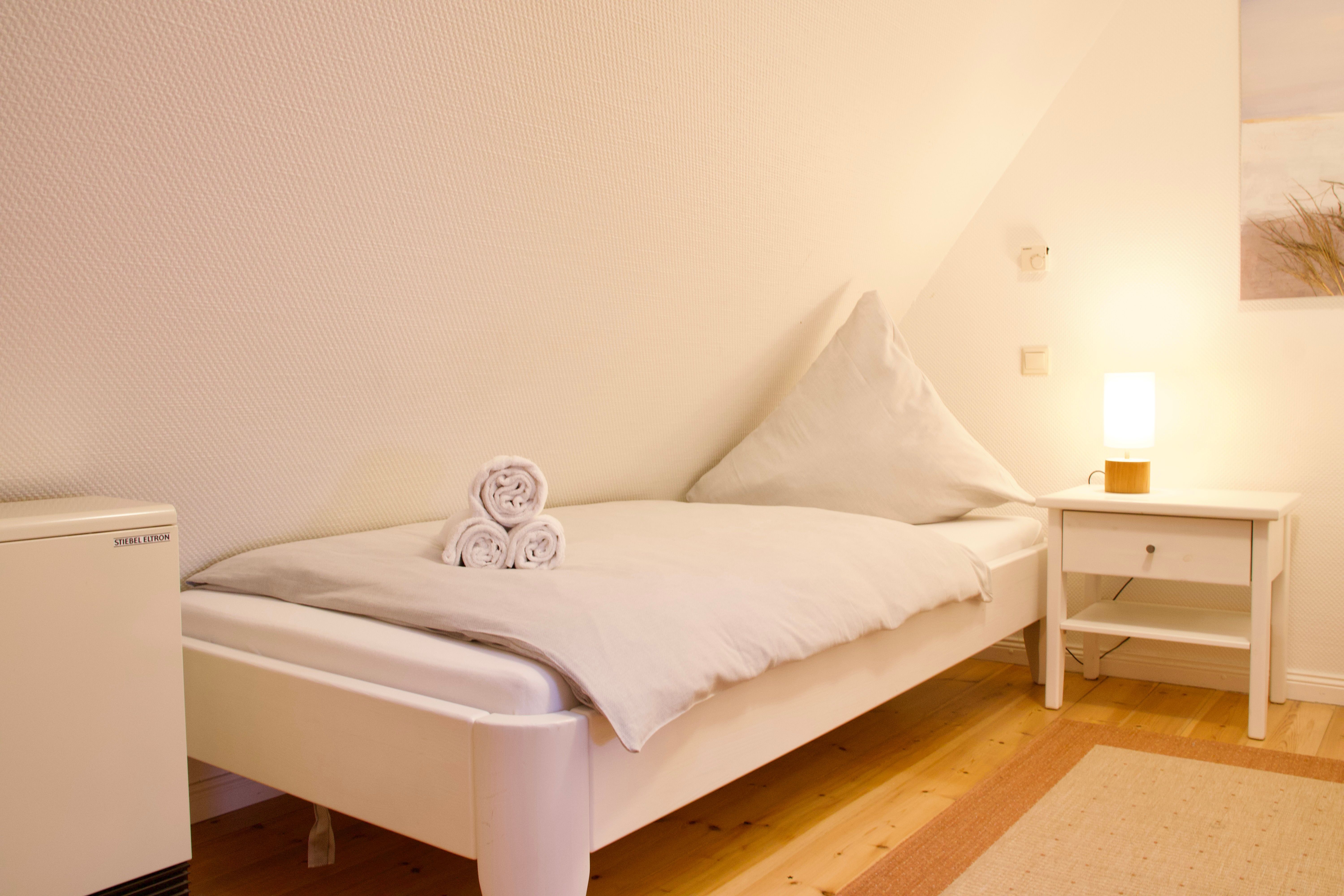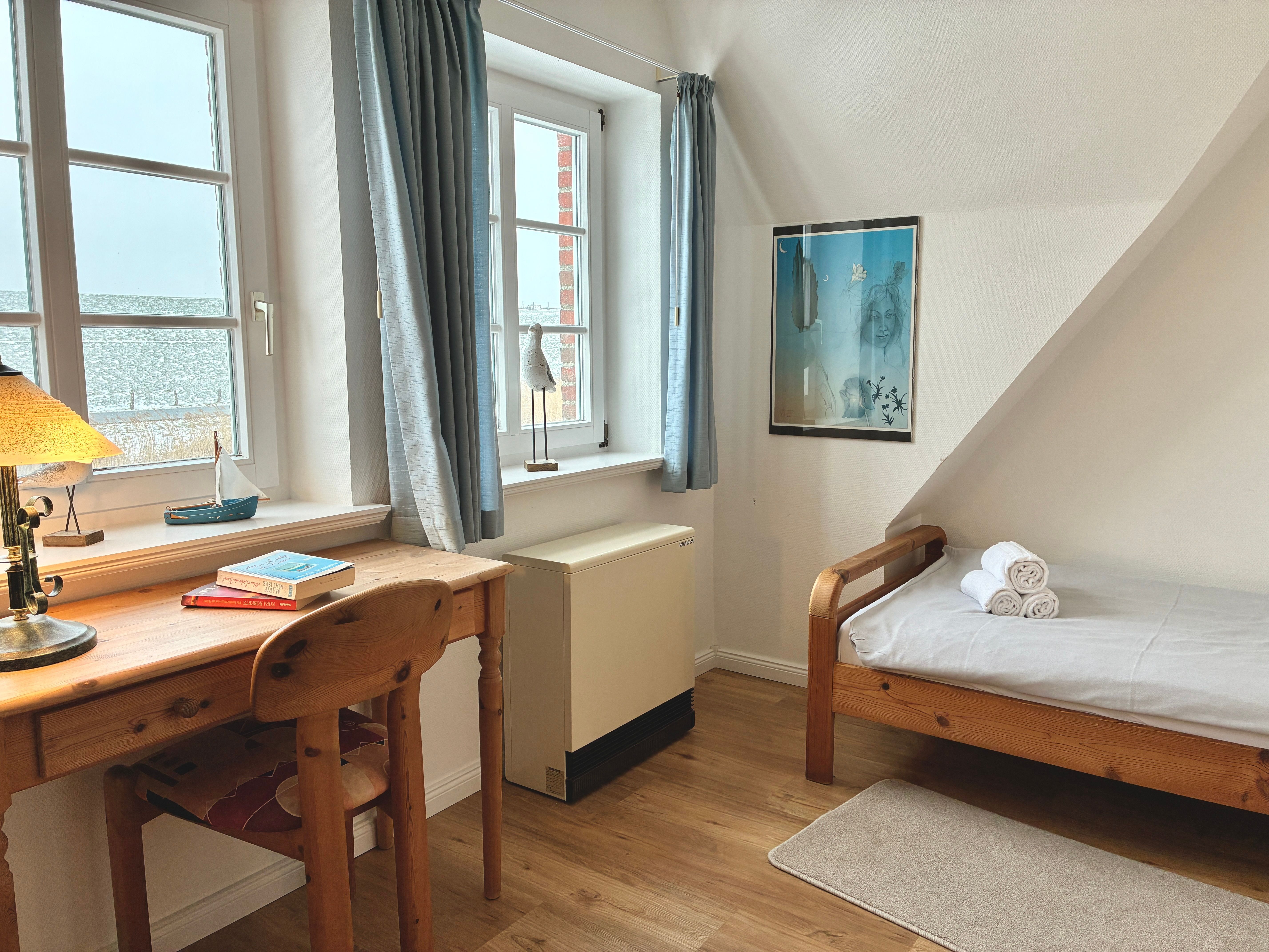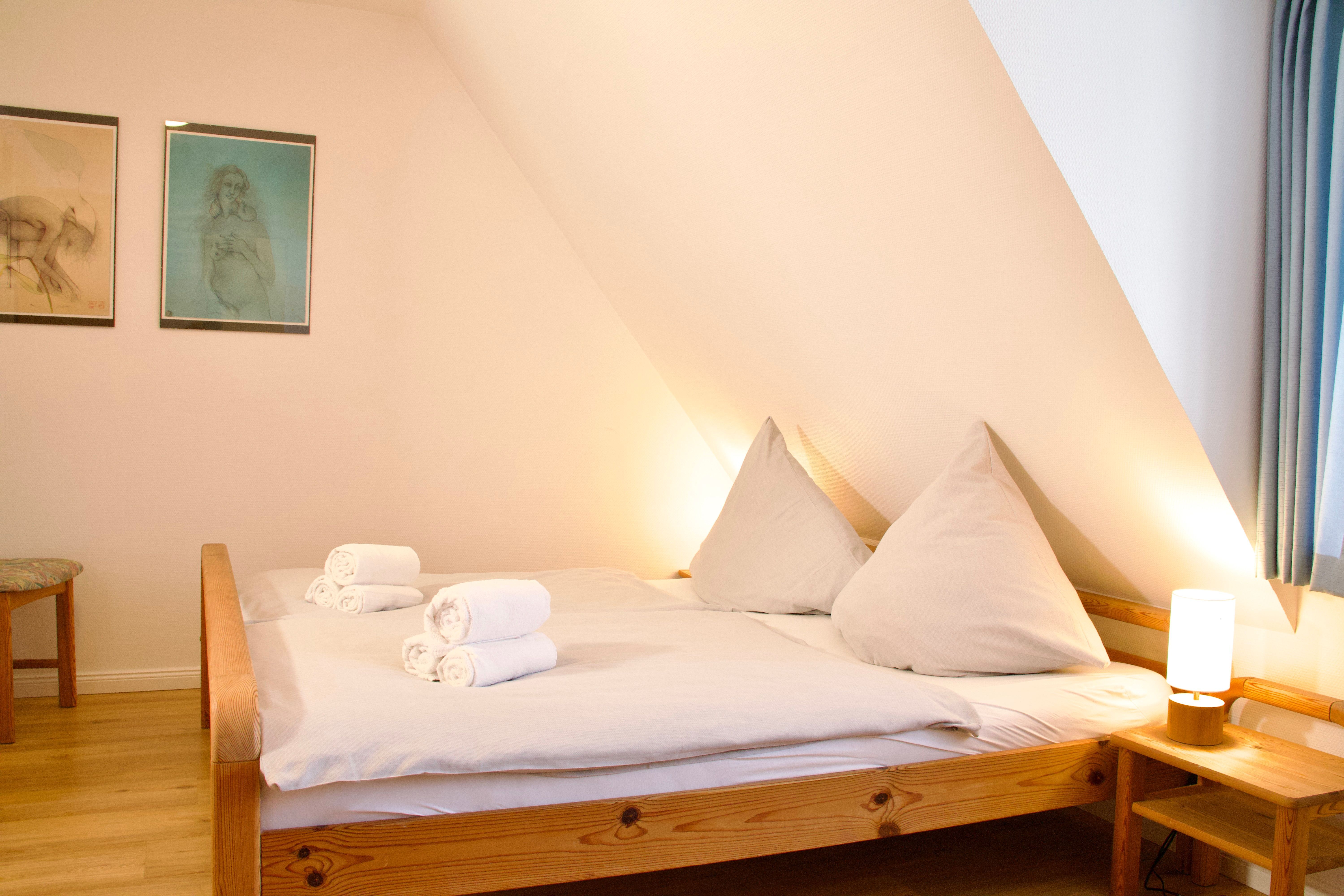Im ersten Obergeschoss befinden sich zwei Schlafzimmer, eines mit Doppelbett und eines mit zwei Einzelbetten, sowie ein Duschbad. Ein drittes Schlafzimmer mit zwei Einzelbetten liegt im ausgebauten Giebelzimmer, das offen gestaltet ist und zusätzlichen Raum bietet.