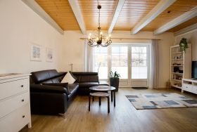 Im Erdgeschoss befindet sich der offen gestaltete Wohn- und Essbereich. Große Fenster sorgen für viel Tageslicht und schaffen eine angenehme, offene Atmosphäre. Die sichtbare Holzbalkendecke verleiht dem Raum zusätzlichen Charakter und unterstreicht den nordischen Stil. Der Wohnbereich ist gemütlich eingerichtet und mit einem Smart-TV ausgestattet. Von hier aus gelangen Sie direkt auf die möblierte Außenterrasse, die sich ideal für Mahlzeiten im Freien oder ruhige Stunden an der frischen Luft eignet. Ein Strandkorb ergänzt den Außenbereich.