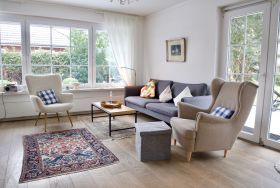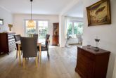 Im Erdgeschoss erwartet Sie ein großzügig geschnittener, offen gestalteter Wohn- und Essbereich, der durch große Fensterflächen und Terrassentüren viel Tageslicht erhält und den Blick in den Garten öffnet. Die stilvolle Einrichtung verbindet moderne Elemente mit ausgewählten antiken Akzenten und verleiht dem Raum eine besondere Atmosphäre. Ein Kachelofen sorgt an kühleren Tagen für behagliche Wärme. Eine komfortable Couch, ein großes Bücherregal sowie ein Designer-Flachbild-TV laden zu ruhigen Stunden im Haus ein.