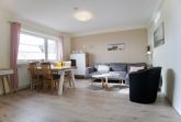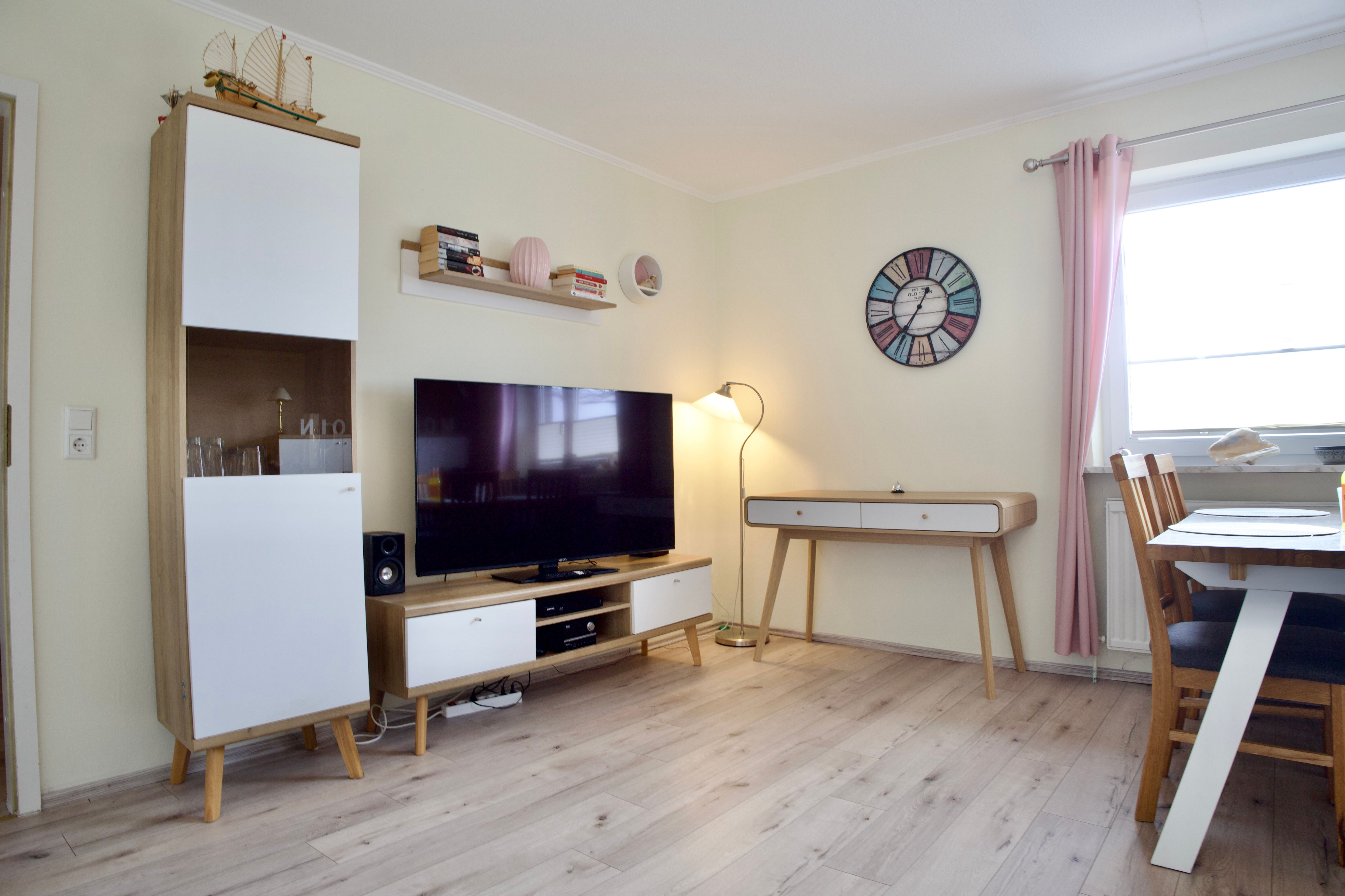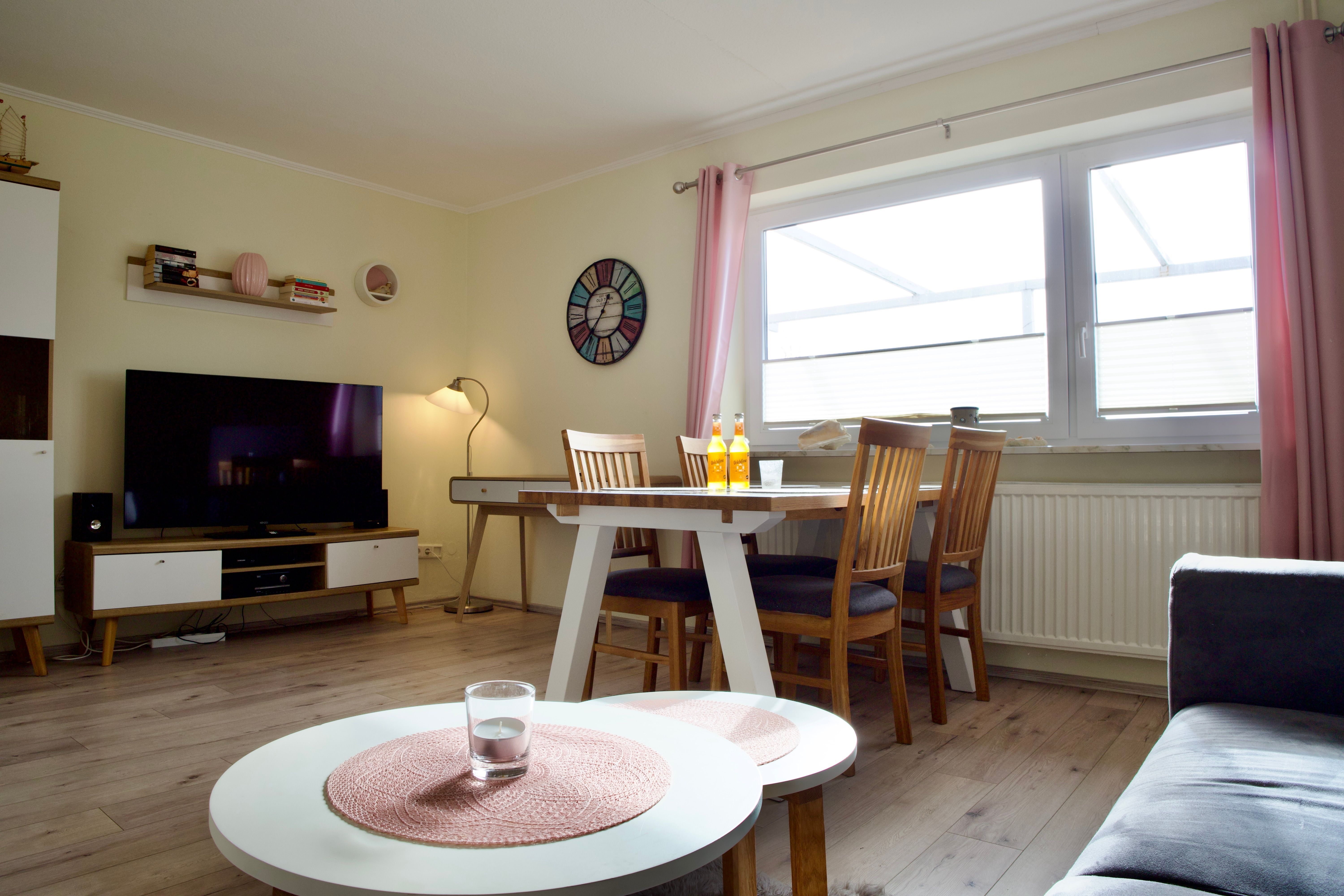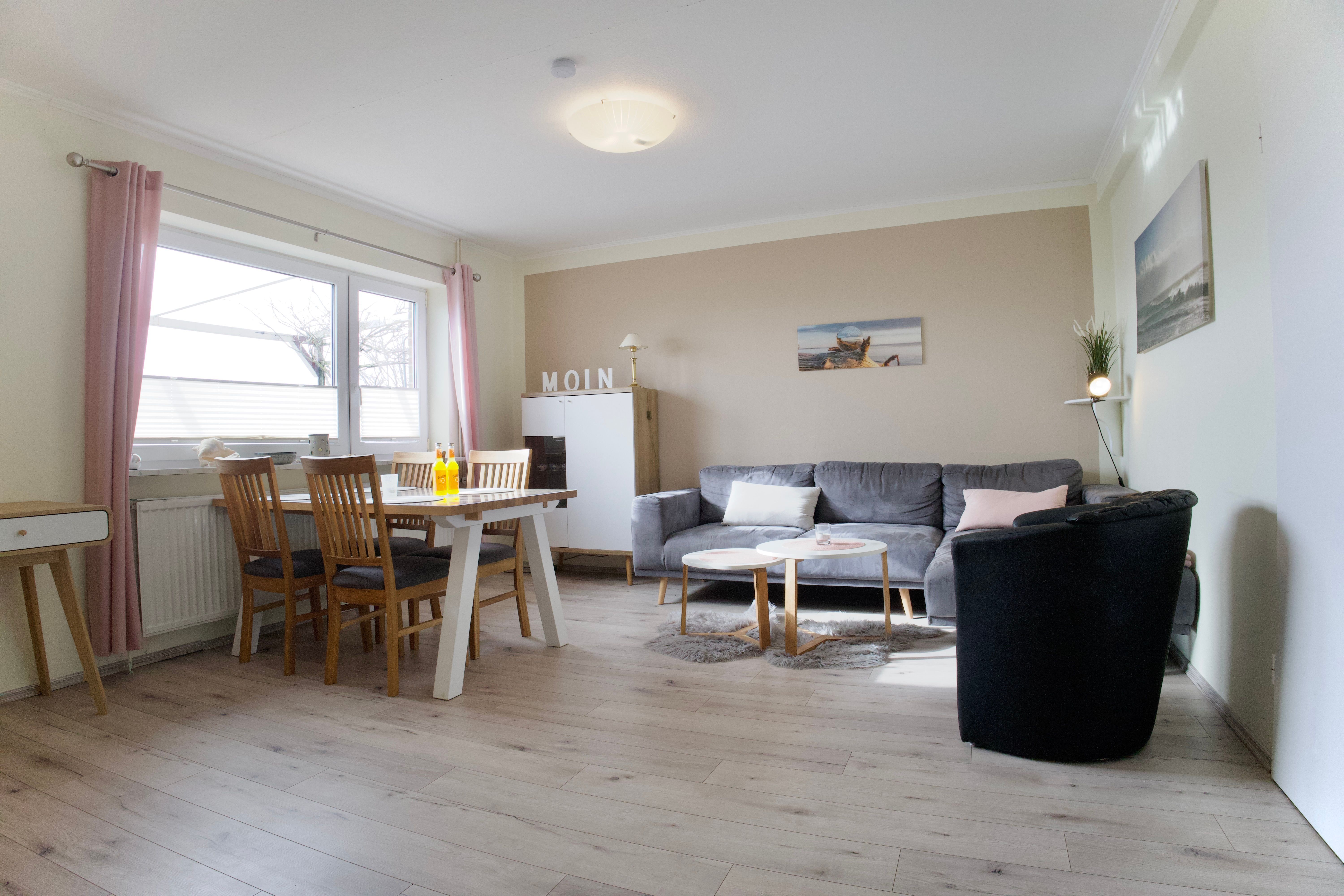 Herzstück der Wohnung ist das großzügige Wohnzimmer mit Essecke und Schreibtisch. Große Fenster lassen viel Tageslicht herein und eröffnen einen weiten Blick über die grünen Felder und Wiesen Nordstrands. Holzakzente unterstreichen die freundliche, ruhige Atmosphäre und machen den Wohnbereich zu einem angenehmen Ort für gemeinsame Zeit.