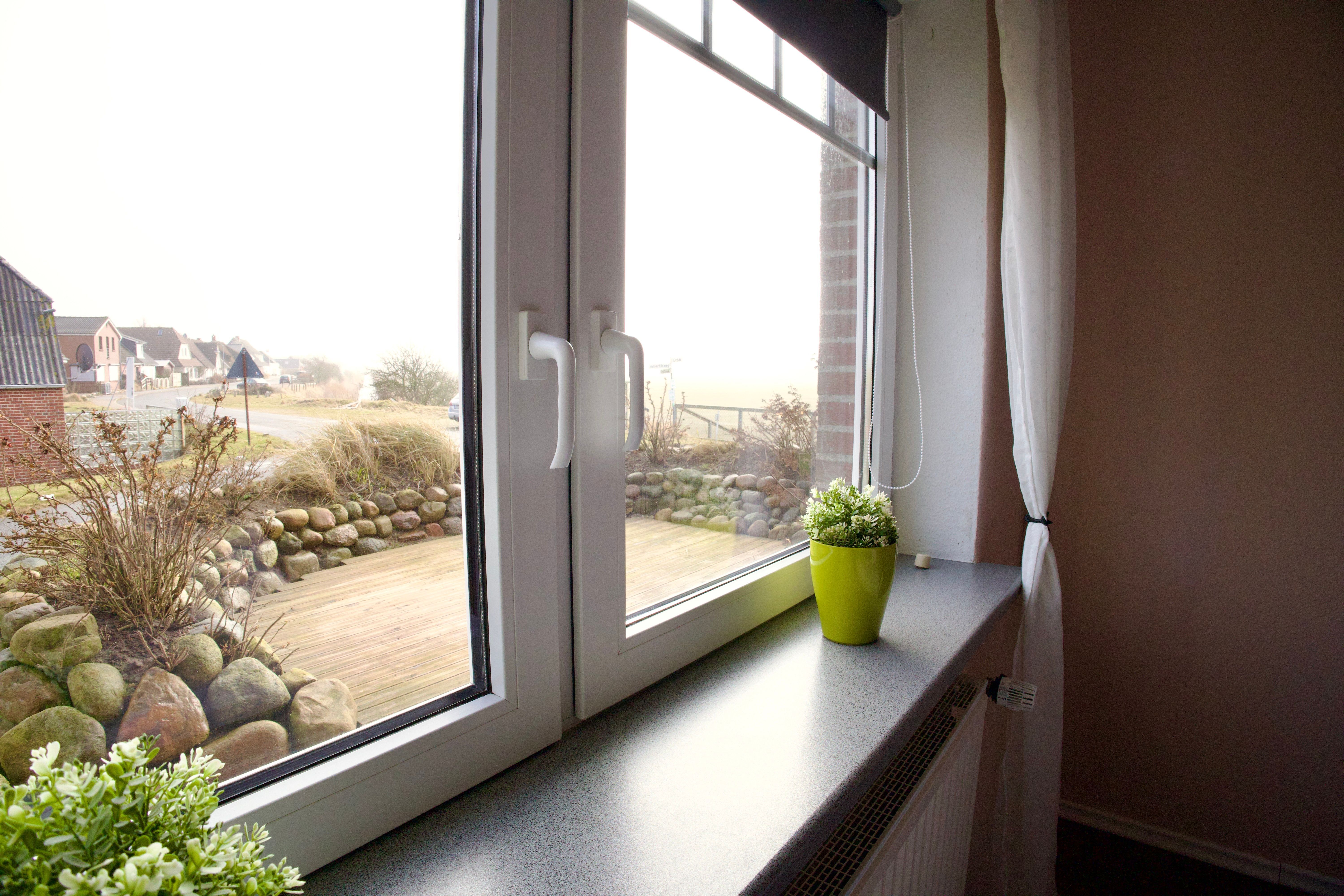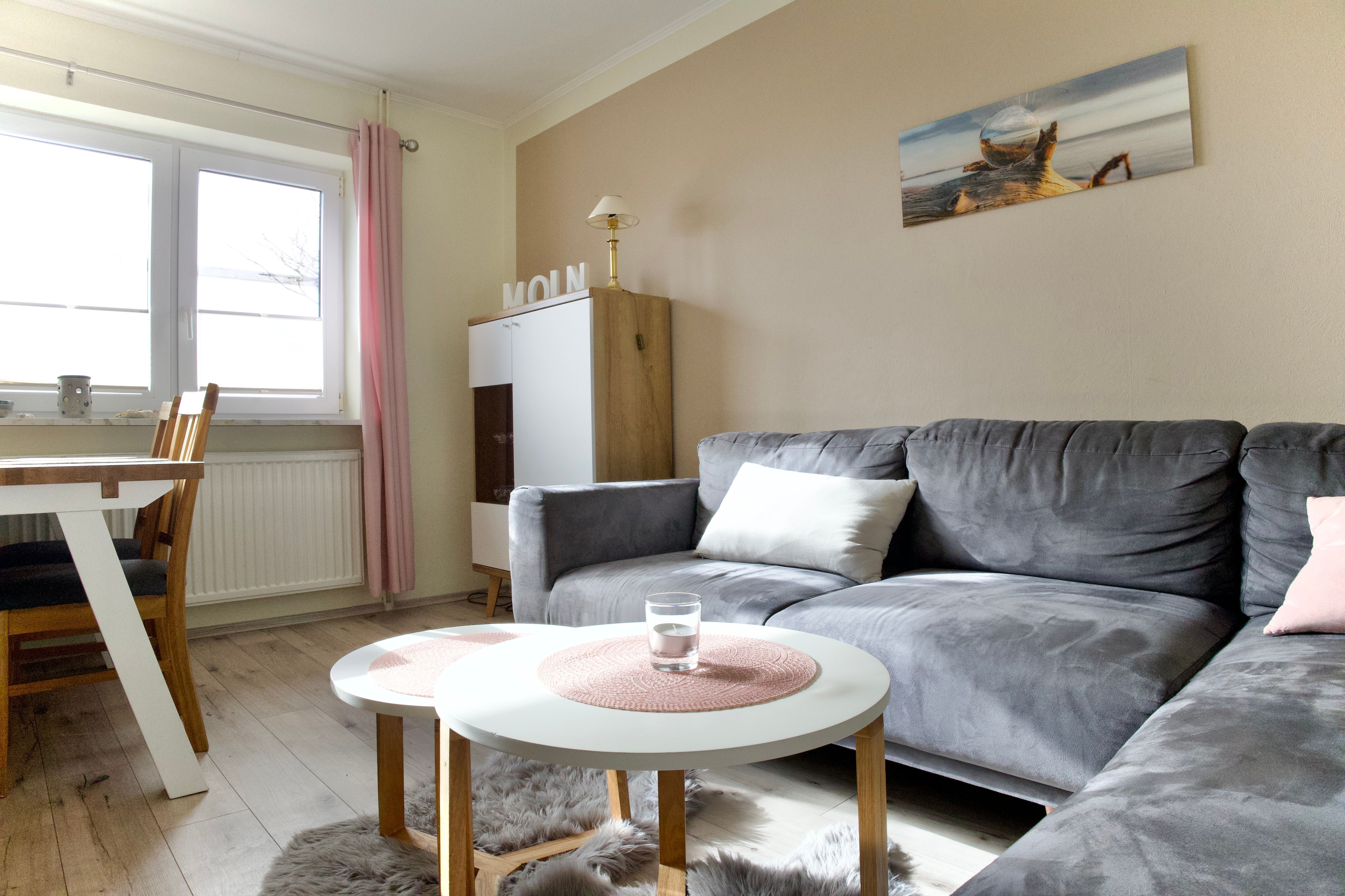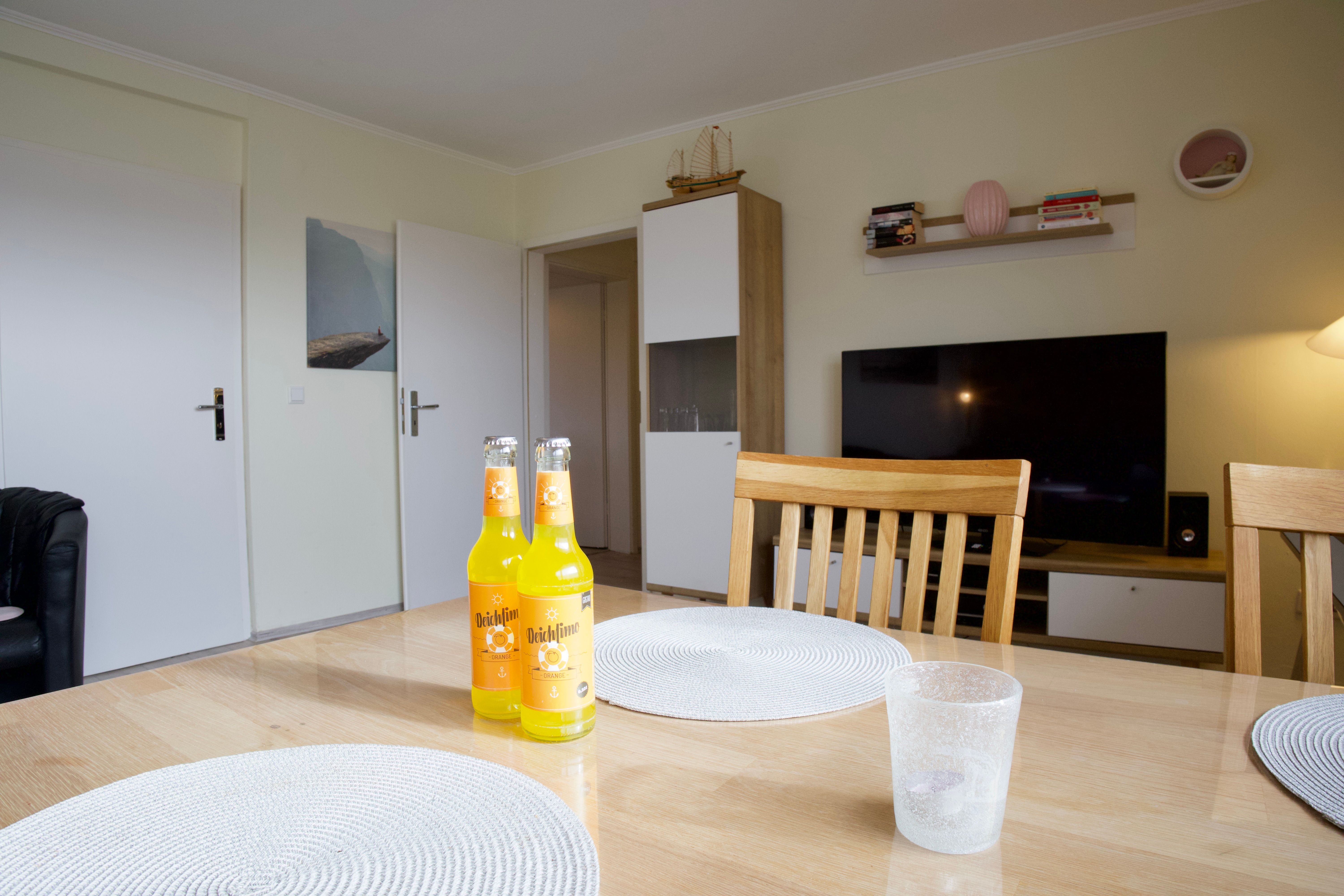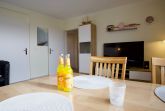 Herzstück der Wohnung ist das großzügige Wohnzimmer mit Essecke und Schreibtisch. Große Fenster lassen viel Tageslicht herein und eröffnen einen weiten Blick über die grünen Felder und Wiesen Nordstrands. Holzakzente unterstreichen die freundliche, ruhige Atmosphäre und machen den Wohnbereich zu einem angenehmen Ort für gemeinsame Zeit.