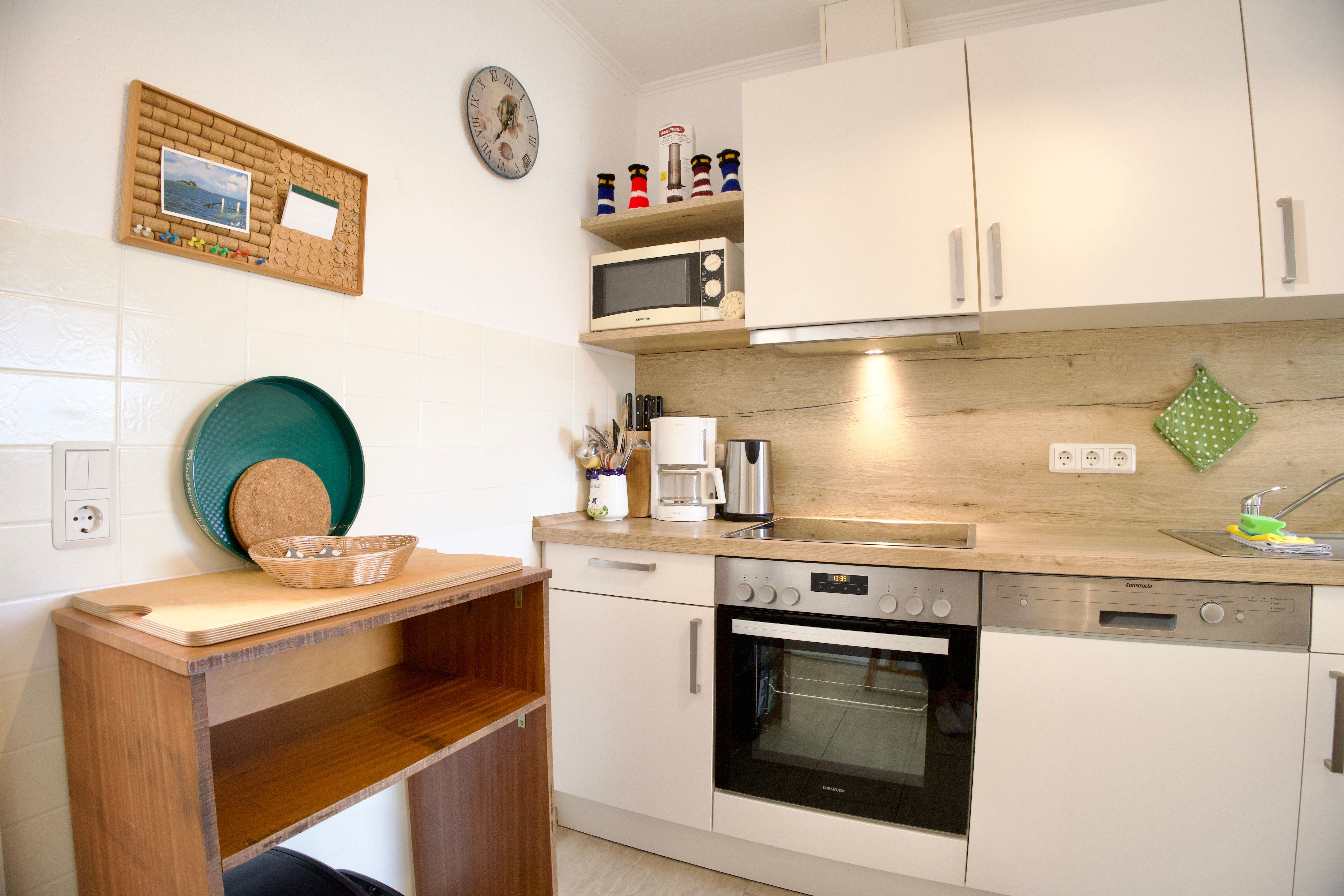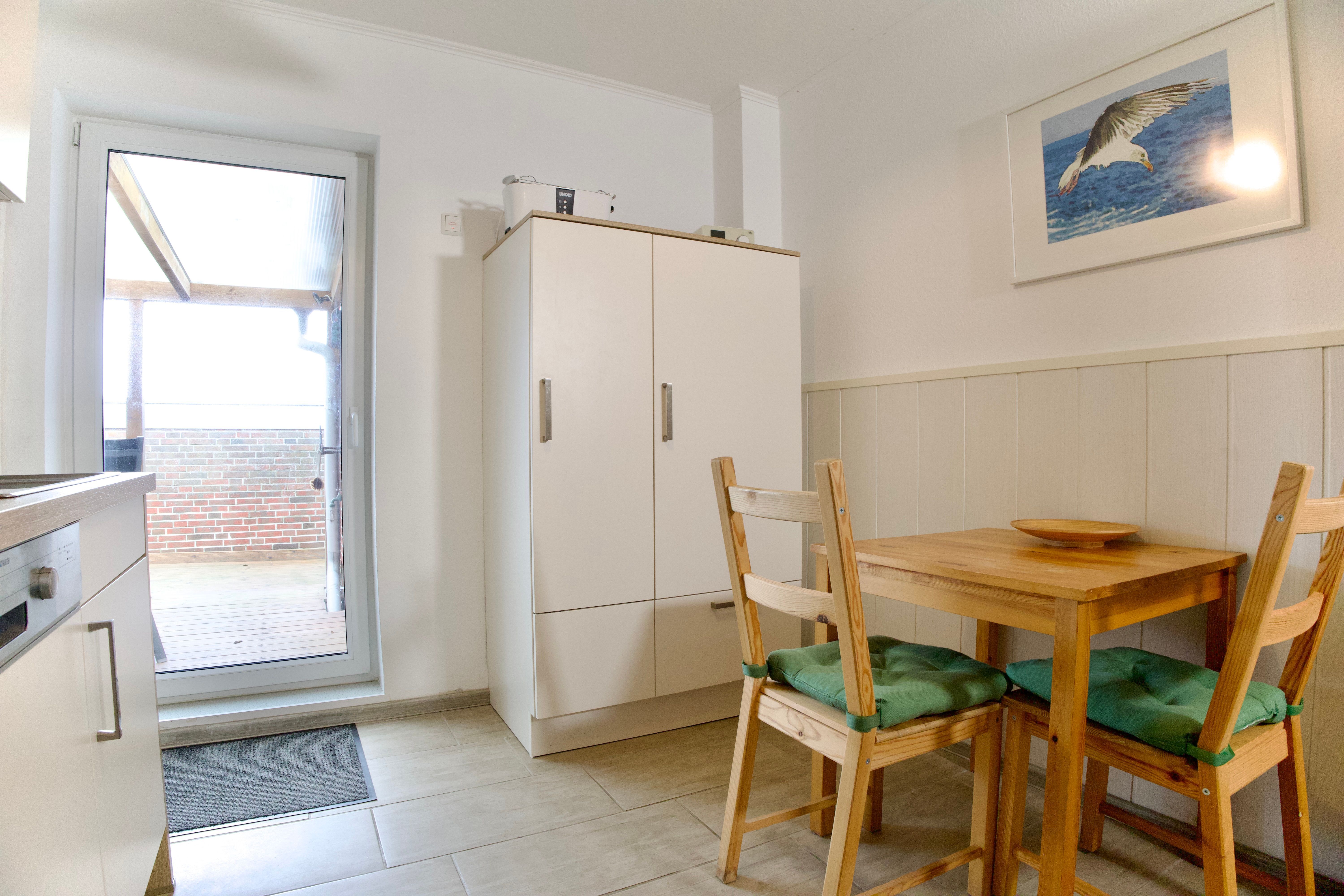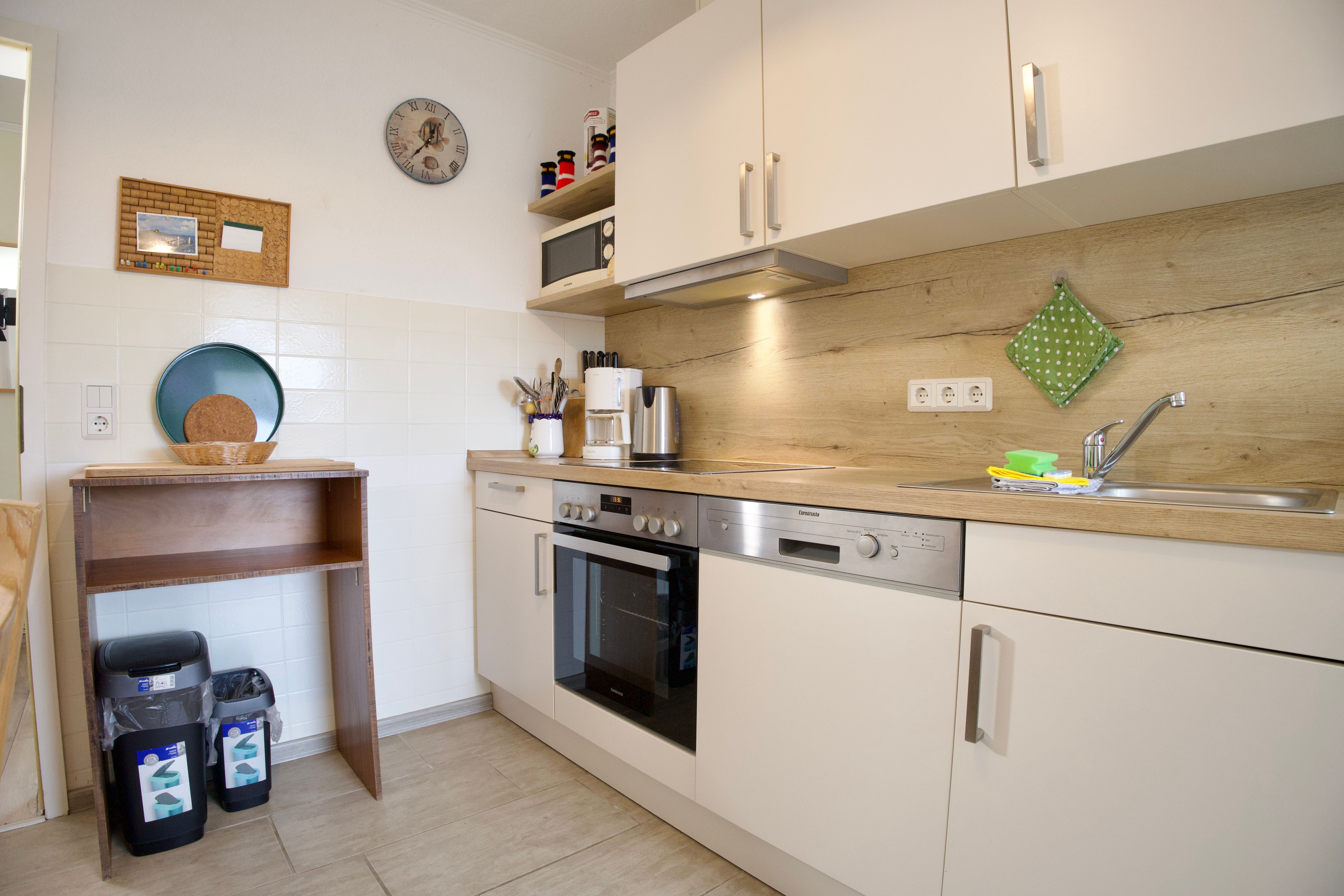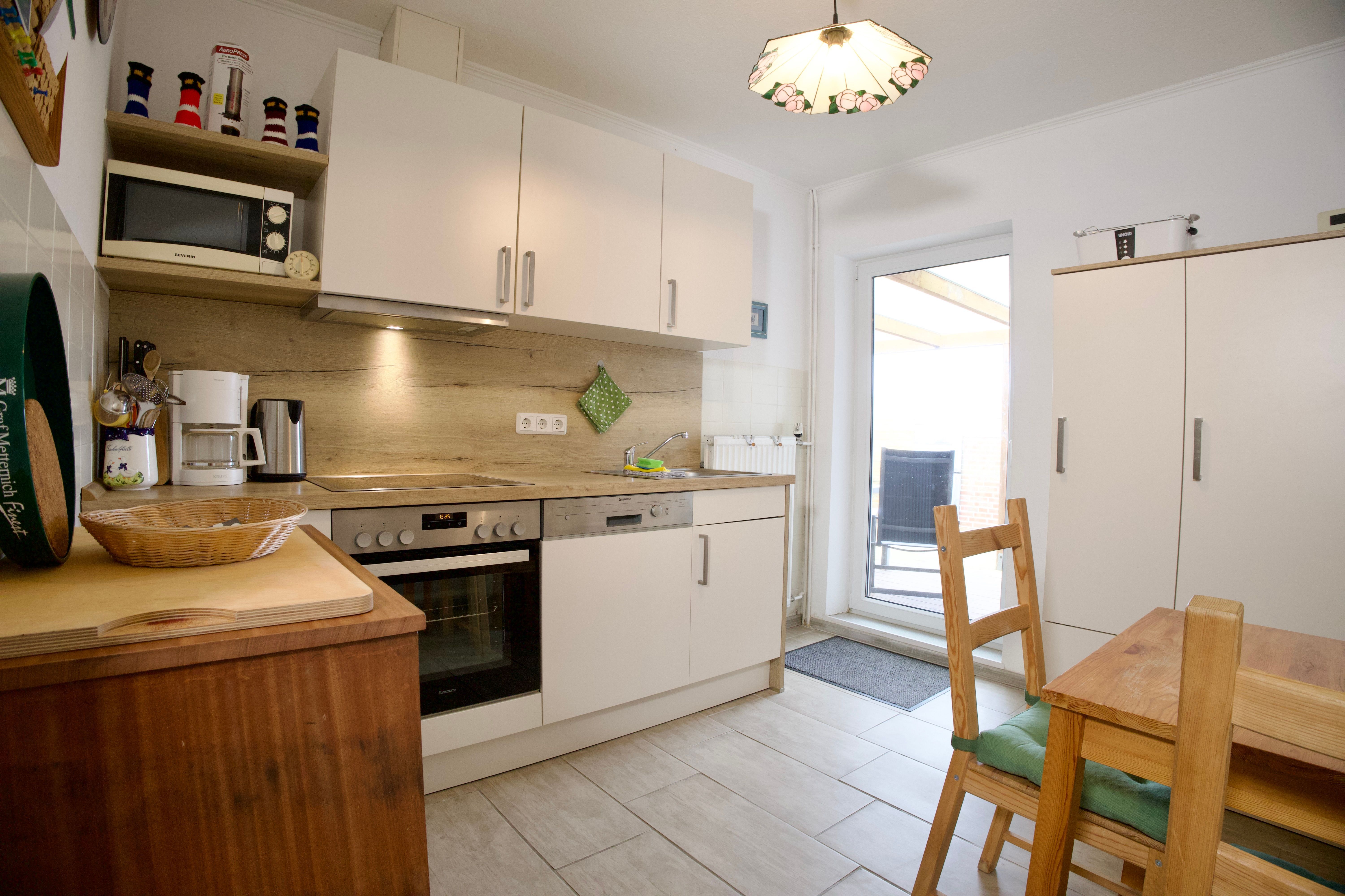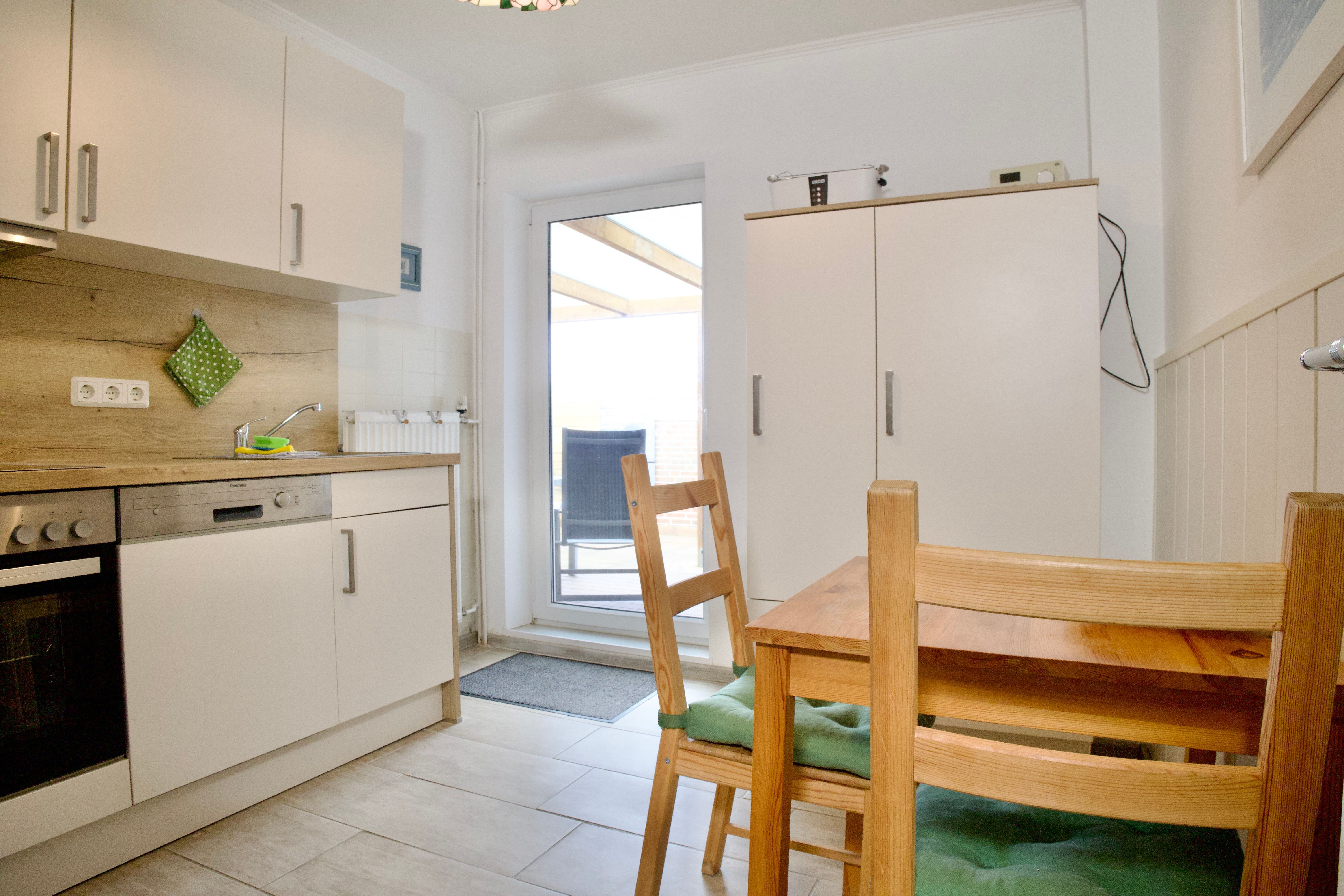 Die Küche schließt direkt an den Wohnbereich an, lässt keine Wünsche offen und ist unter anderem mit Backofen, Geschirrspüler, Kaffeemaschine sowie einer Gefriermöglichkeit ausgestattet. Tageslicht sorgt auch hier für eine helle, angenehme Raumatmosphäre. Von der Küche aus gelangen Sie direkt auf die teilüberdachte Terrasse.