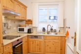 Angrenzend liegt der Kochbereich mit einer hochwertig gestalteten Einbauküche. Sie ist vollständig ausgestattet und verfügt unter anderem über eine Spülmaschine, eine Kaffeemaschine sowie eine Gefriermöglichkeit. Ein separates Gäste-WC ist vom Flur aus erreichbar und ergänzt den Komfort im Erdgeschoss sinnvoll.