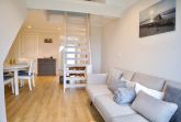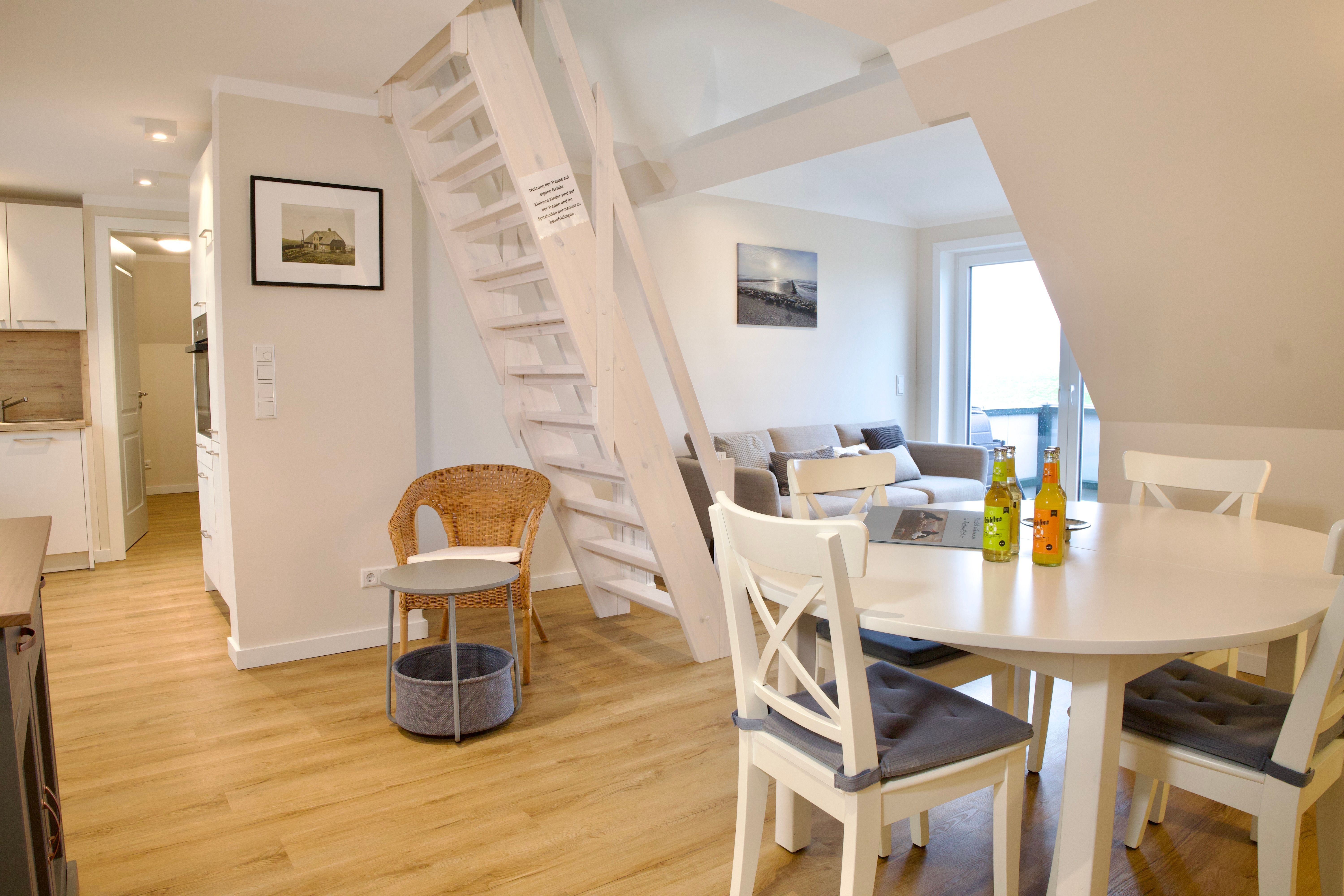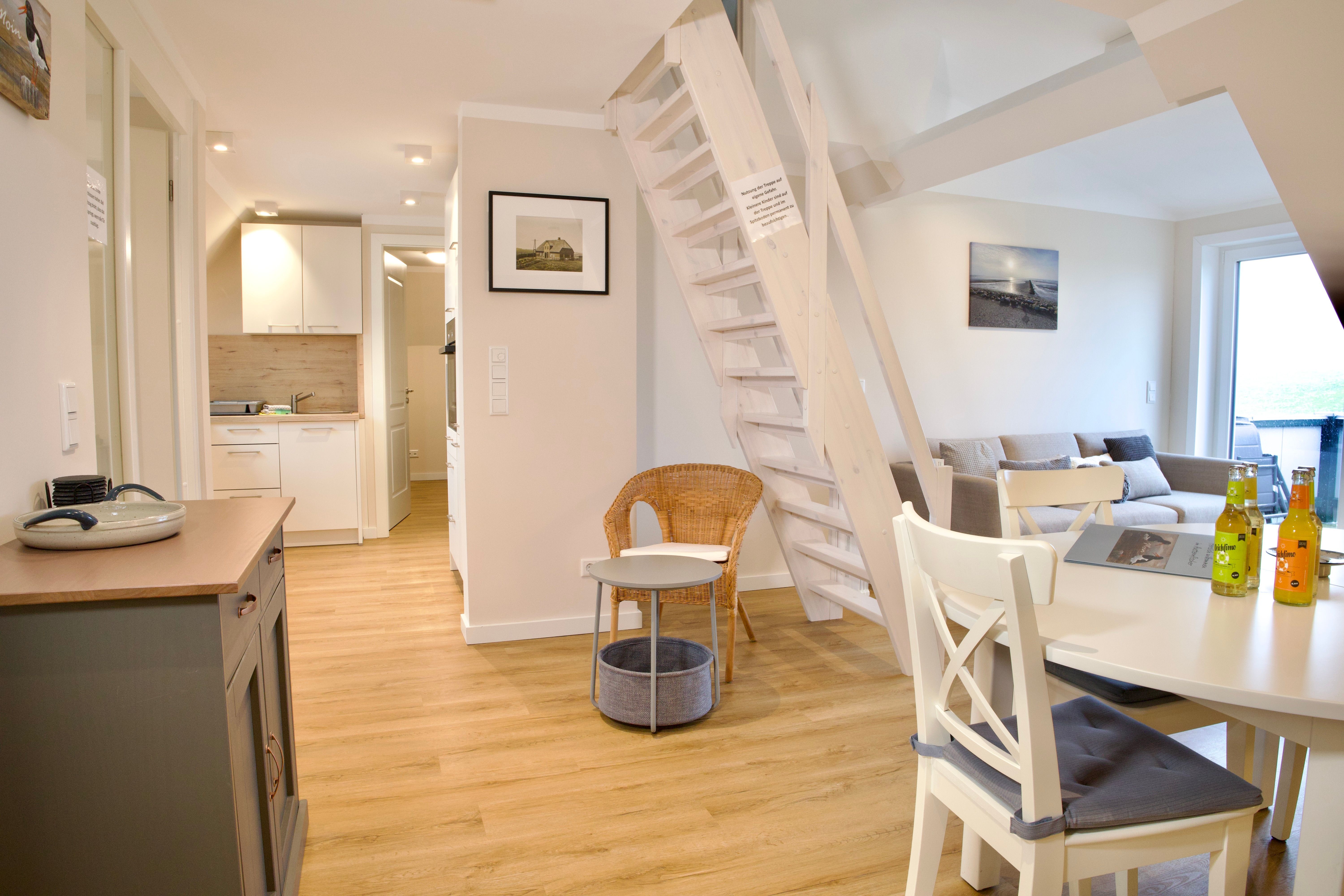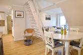 Über eine Außentreppe erreichen Sie die Wohnung Austernfischer. Sie bietet Platz für bis zu vier Erwachsene und drei Kinder und überzeugt durch ihre moderne, klare Gestaltung sowie einen offenen Grundriss. Große Fenster sorgen für viel Tageslicht und unterstreichen die luftige Raumwirkung.