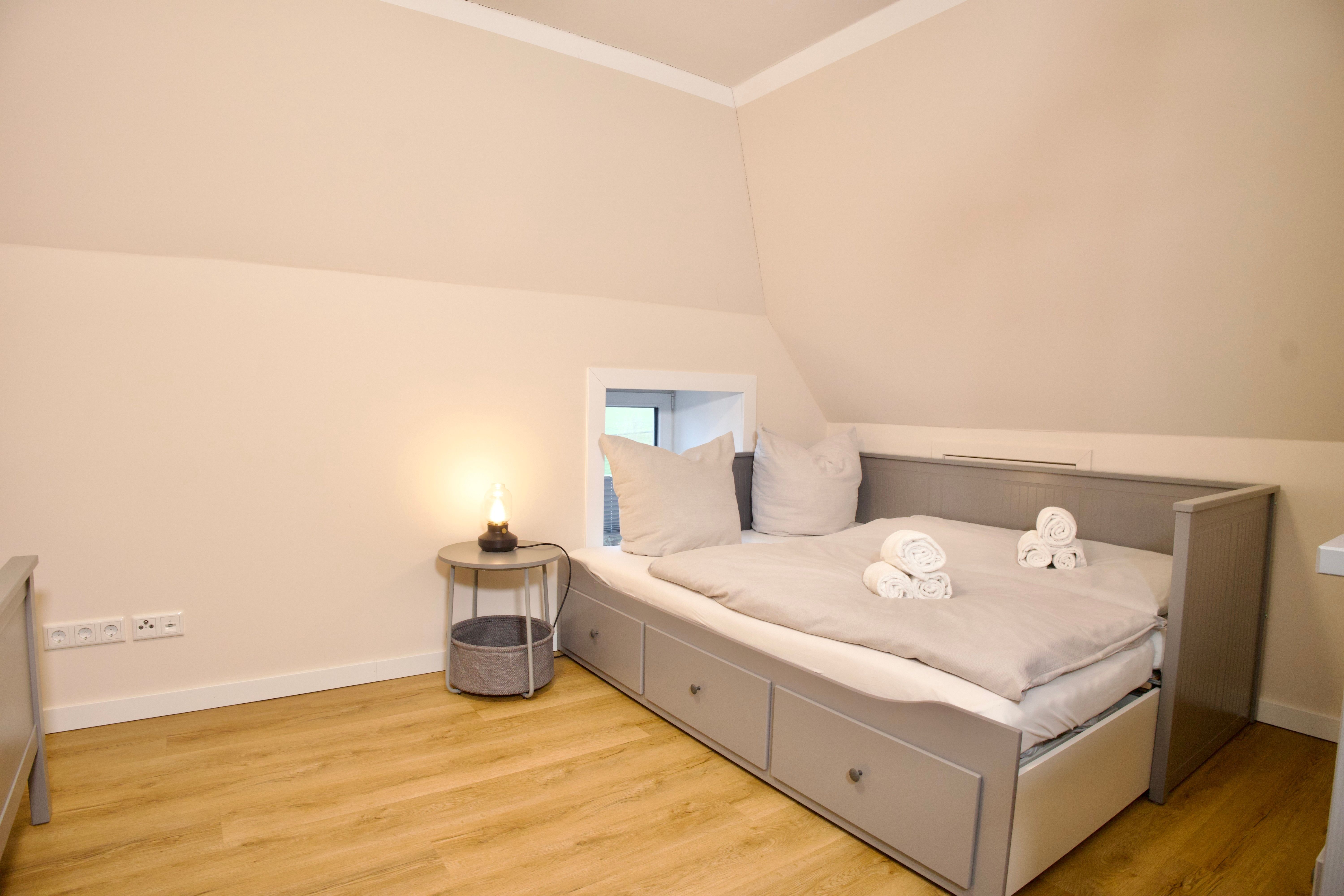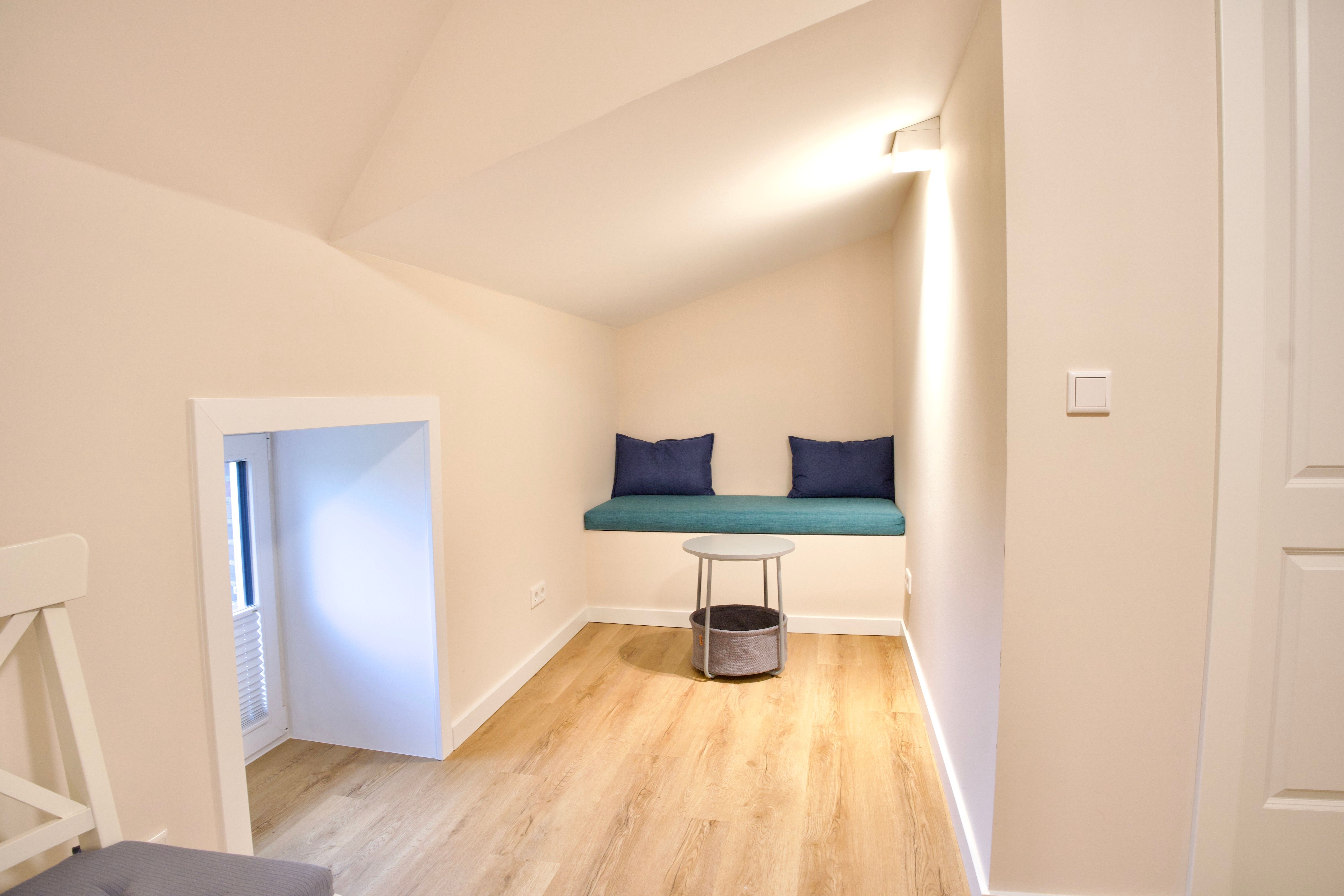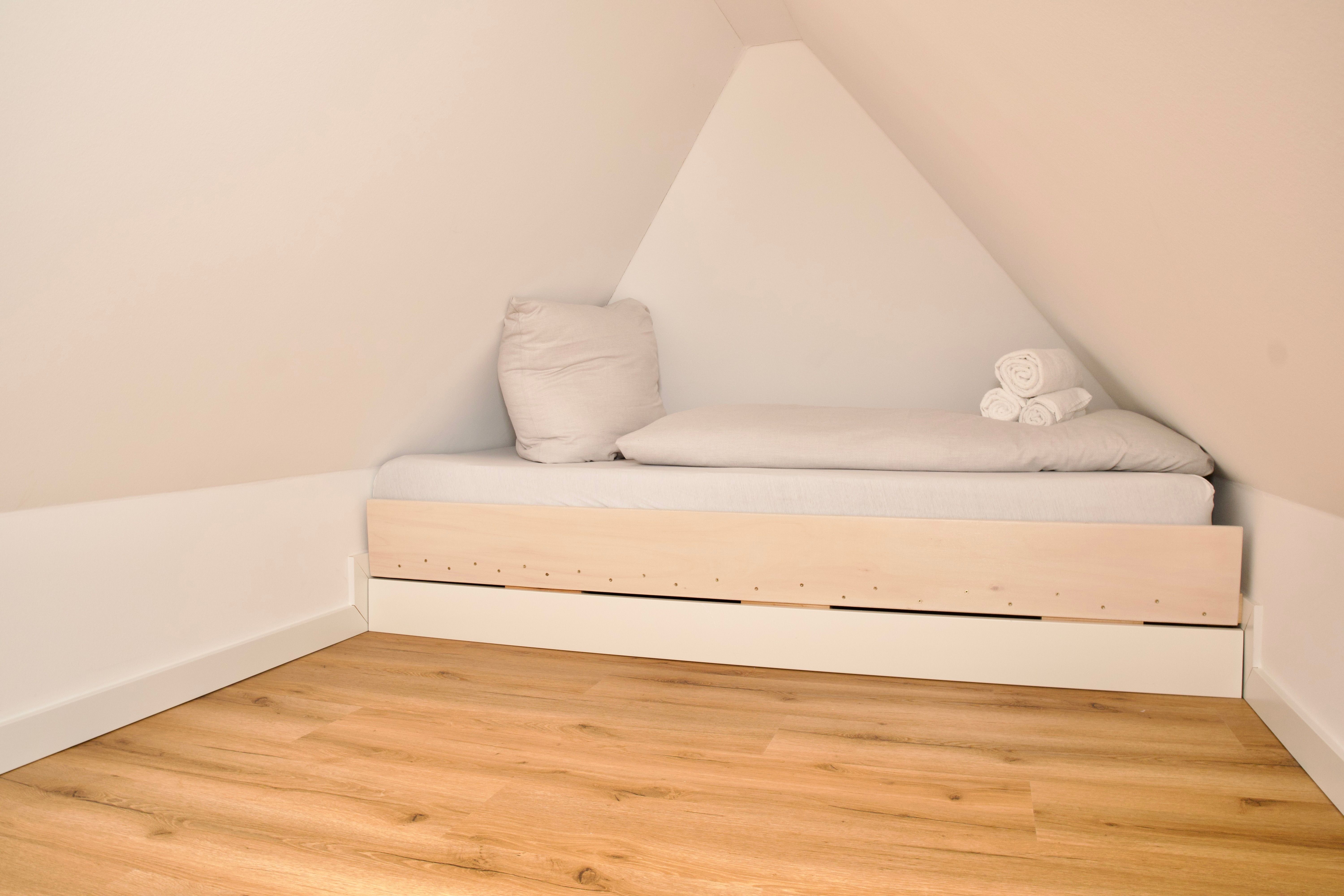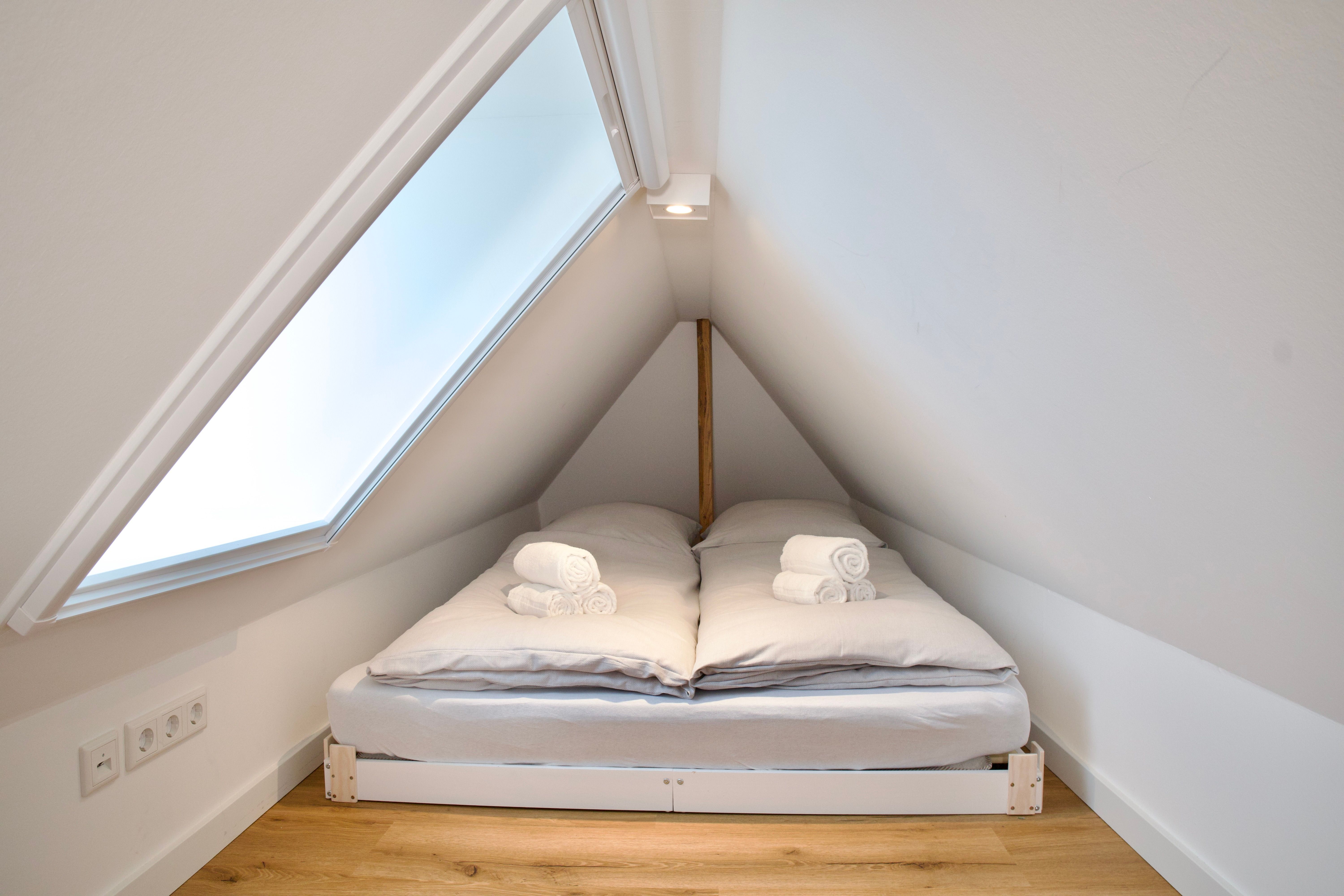 Die Wohnung verfügt über zwei Schlafzimmer mit Doppelbetten in den Größen 180 × 200 Zentimeter und 160 × 200 Zentimeter. Eines der Schlafzimmer ist mit einem En-Suite-Bad ausgestattet, das über eine nahezu bodengleiche Dusche verfügt. Eine gemütliche Leseecke ergänzt diesen Raum und bietet einen ruhigen Rückzugsort. Zusätzlich befindet sich unter dem Dach eine Schlafkoje mit zwei Futonbetten, die sich besonders für Kinder, Jugendliche oder geübte Kletterer eignet. Der Zugang erfolgt über eine schmale, steile Treppe, die offen in das Wohnkonzept integriert ist.