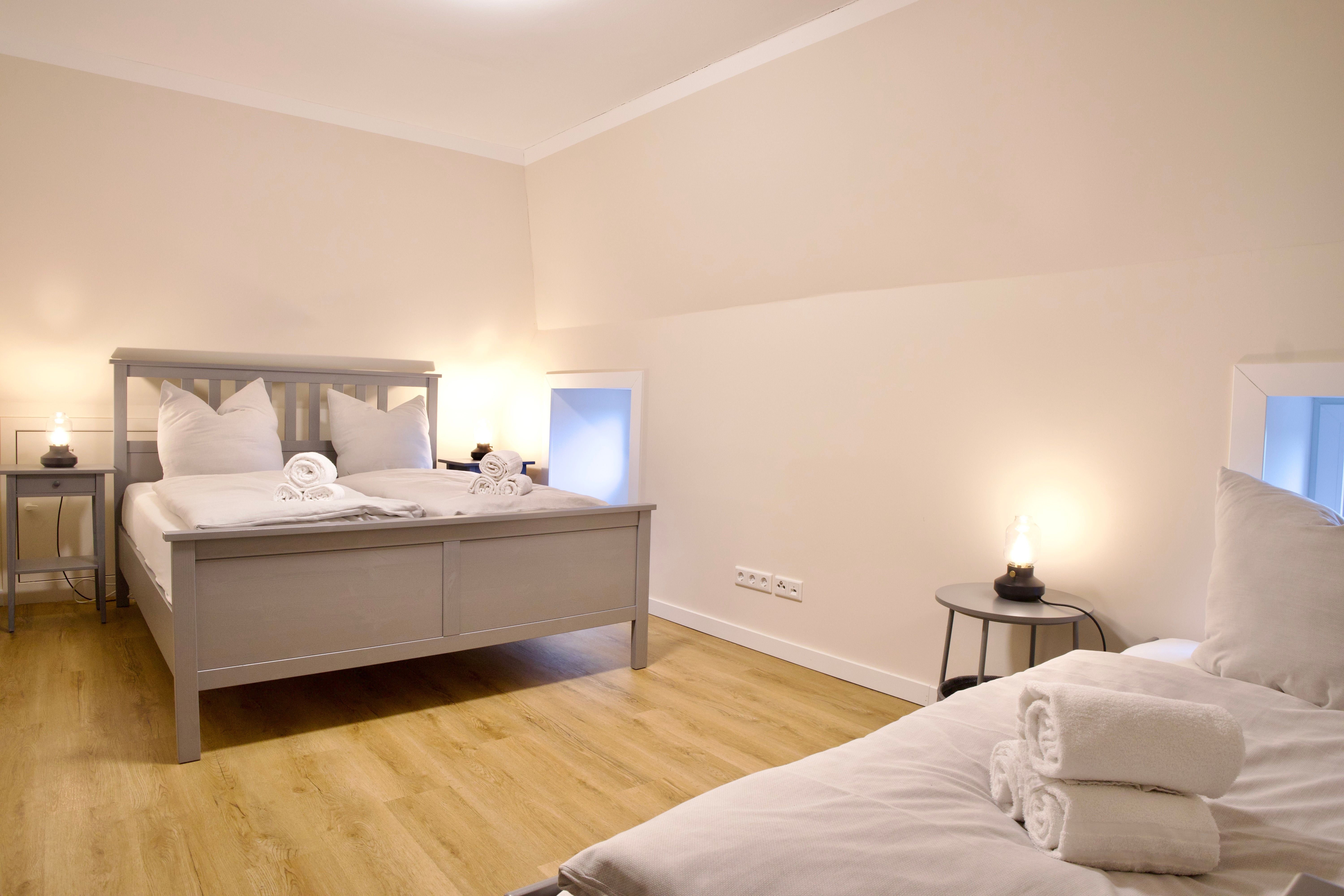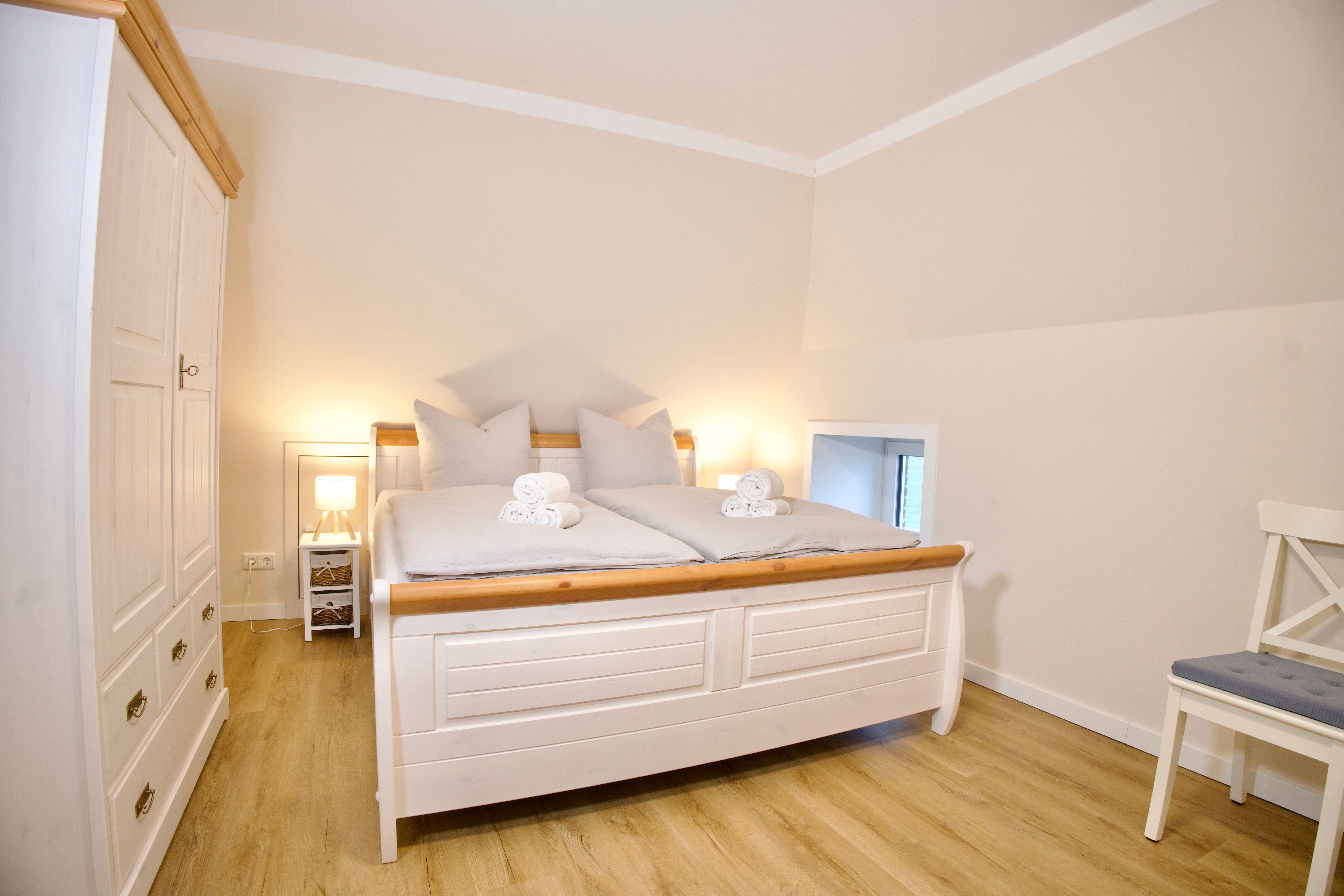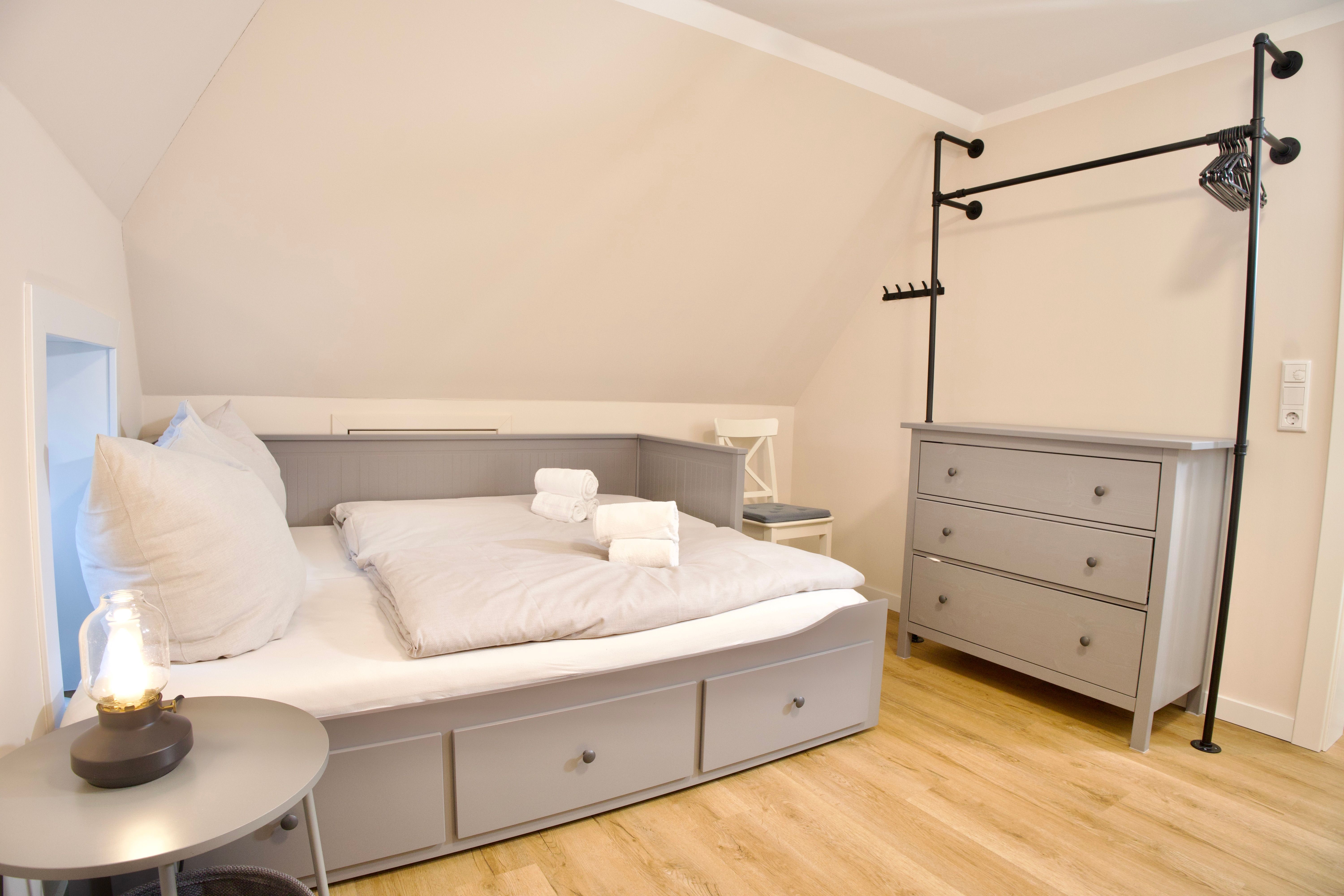 Die Wohnung verfügt über zwei Schlafzimmer mit Doppelbetten in den Größen 180 × 200 Zentimeter und 160 × 200 Zentimeter. Eines der Schlafzimmer ist mit einem En-Suite-Bad ausgestattet, das über eine nahezu bodengleiche Dusche verfügt. Eine gemütliche Leseecke ergänzt diesen Raum und bietet einen ruhigen Rückzugsort. Zusätzlich befindet sich unter dem Dach eine Schlafkoje mit zwei Futonbetten, die sich besonders für Kinder, Jugendliche oder geübte Kletterer eignet. Der Zugang erfolgt über eine schmale, steile Treppe, die offen in das Wohnkonzept integriert ist.