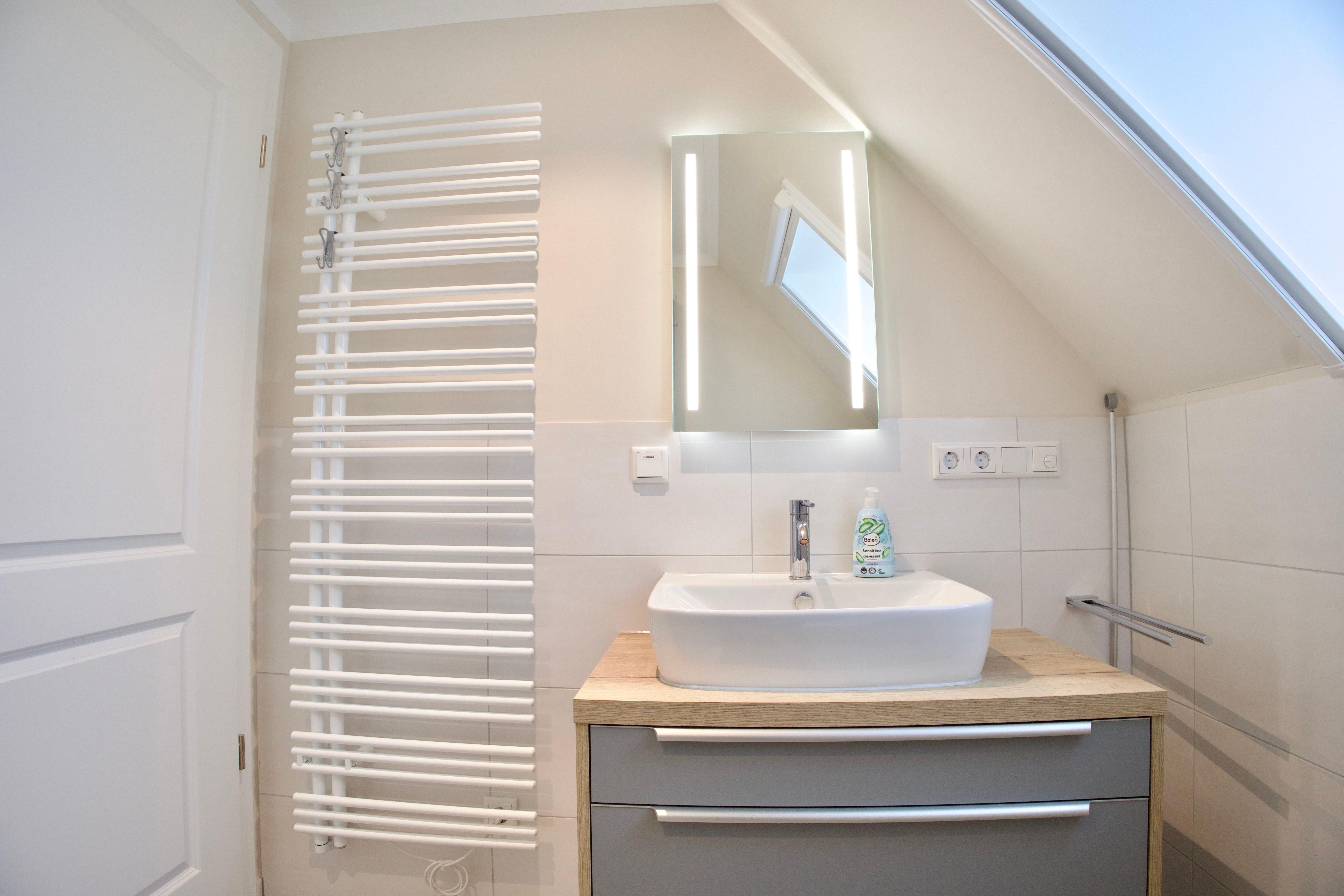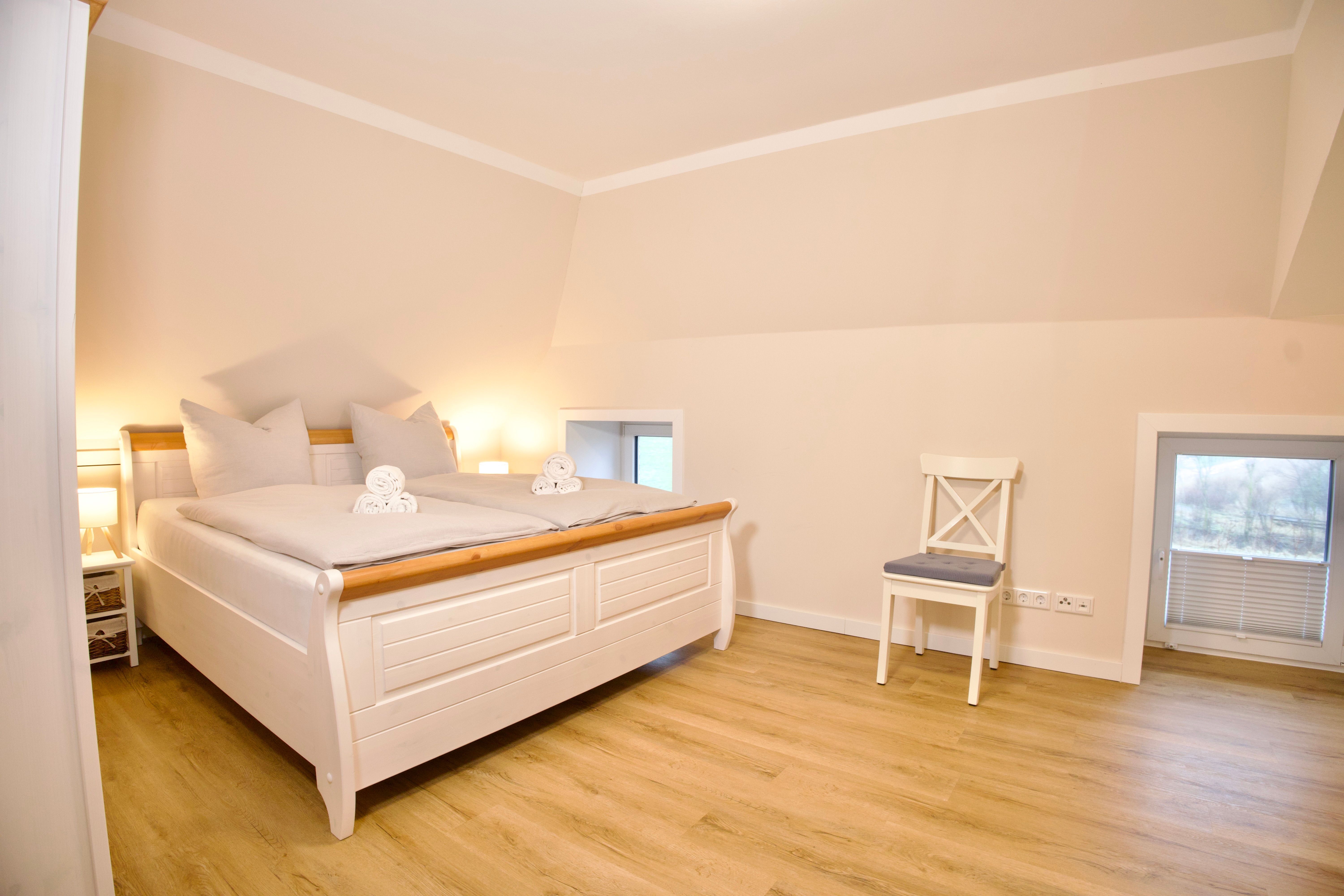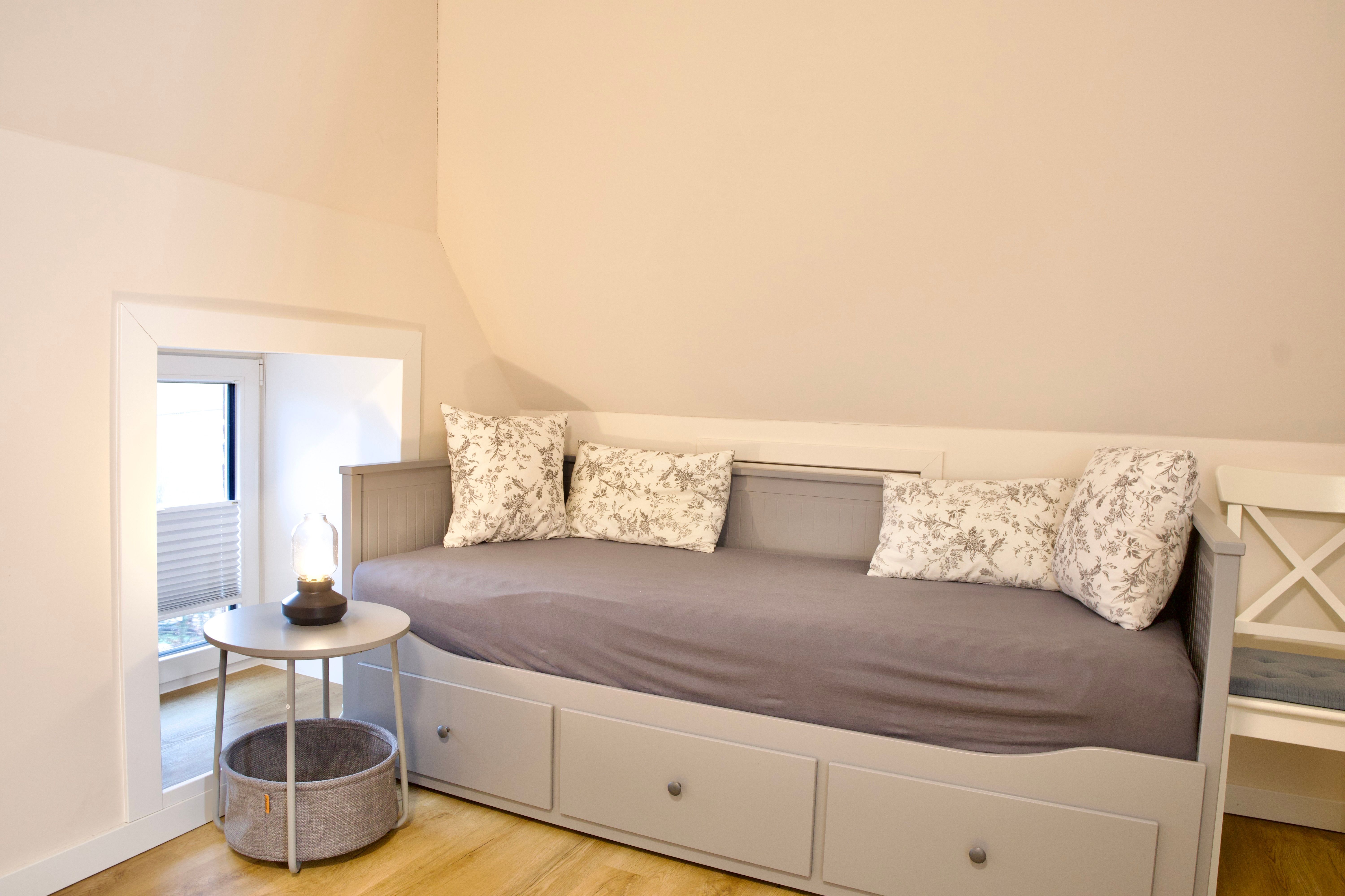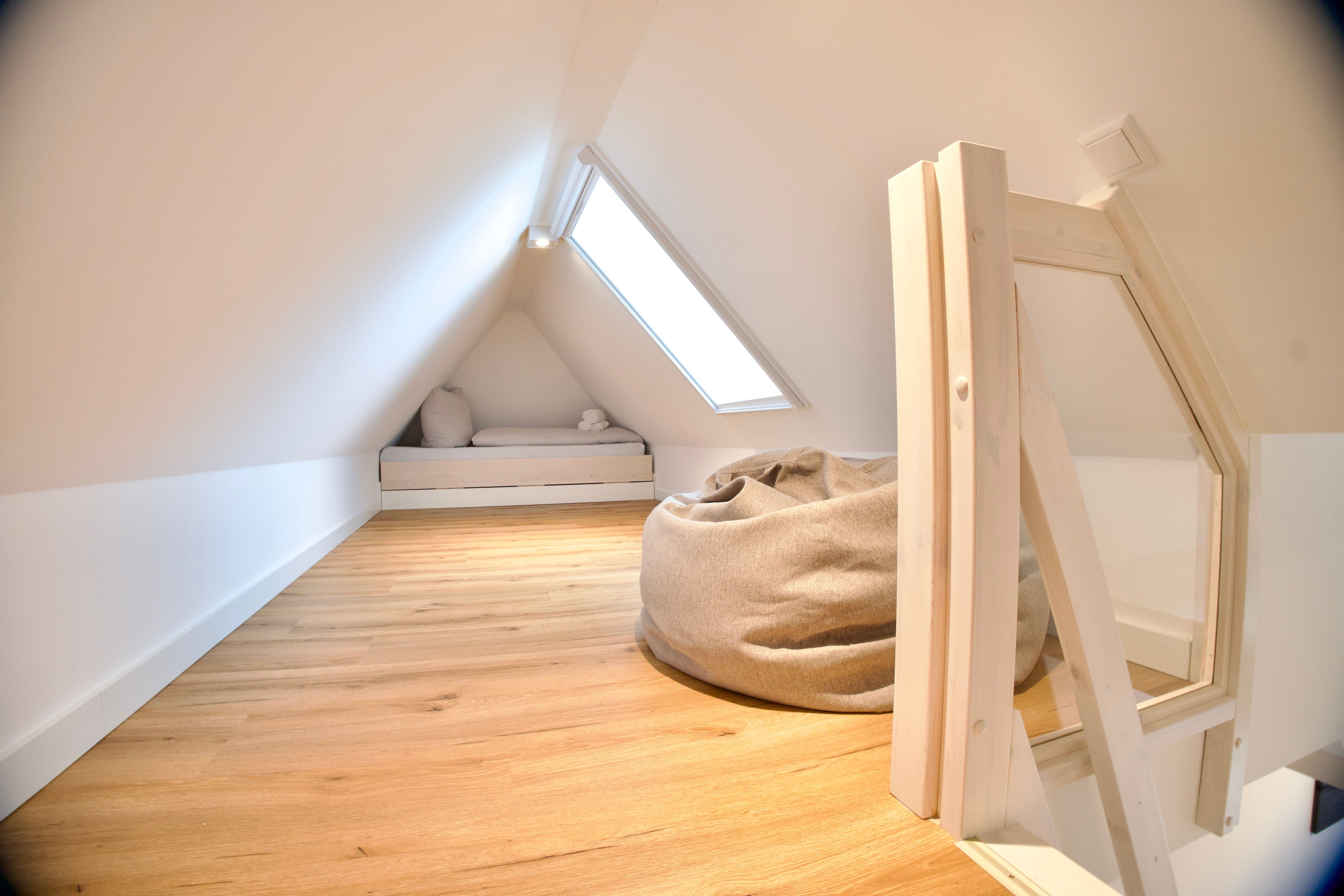 Die Wohnung verfügt über zwei Schlafzimmer mit Doppelbetten in den Größen 180 × 200 Zentimeter und 160 × 200 Zentimeter. Eines der Schlafzimmer ist mit einem En-Suite-Bad ausgestattet, das über eine nahezu bodengleiche Dusche verfügt. Eine gemütliche Leseecke ergänzt diesen Raum und bietet einen ruhigen Rückzugsort. Zusätzlich befindet sich unter dem Dach eine Schlafkoje mit zwei Futonbetten, die sich besonders für Kinder, Jugendliche oder geübte Kletterer eignet. Der Zugang erfolgt über eine schmale, steile Treppe, die offen in das Wohnkonzept integriert ist.