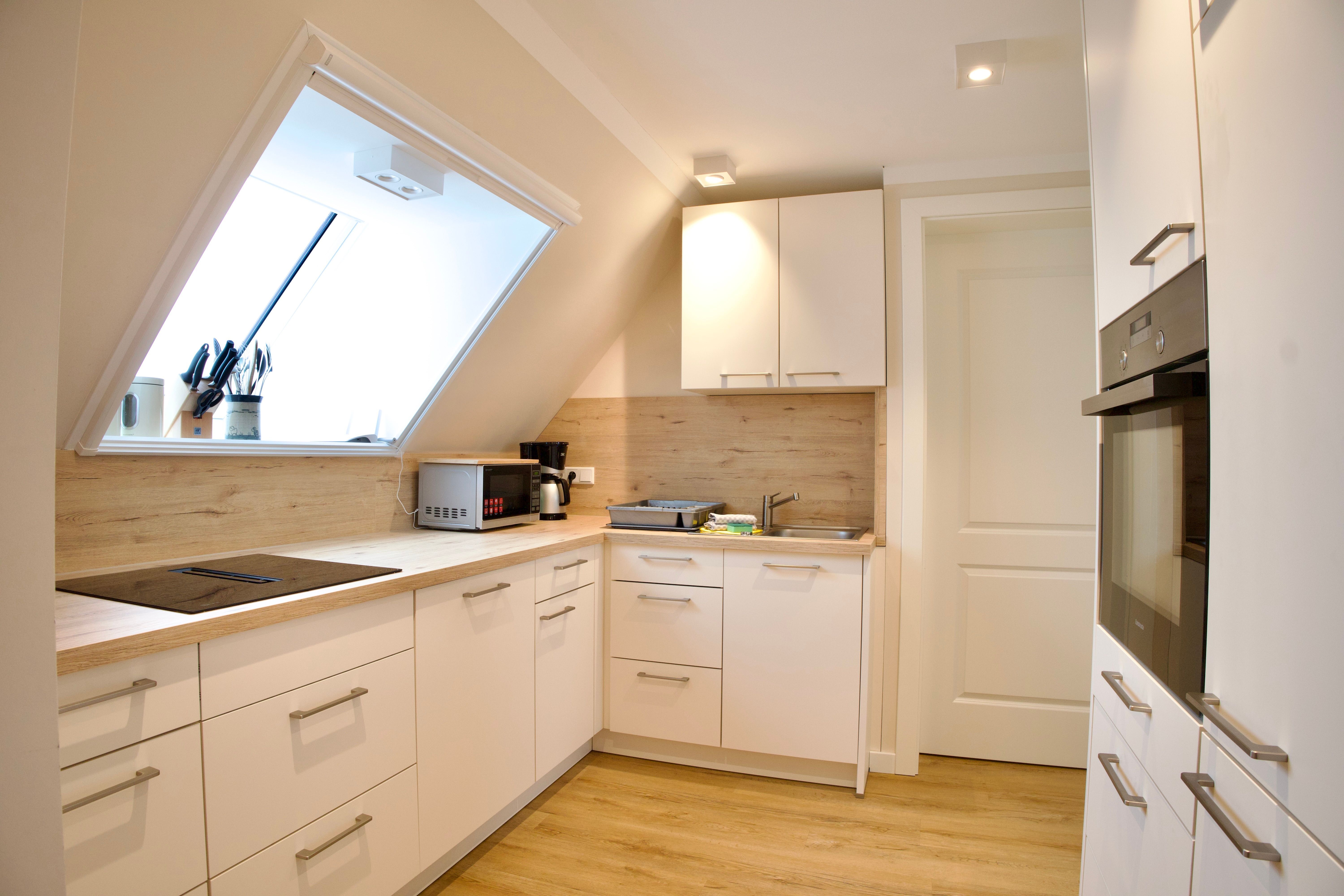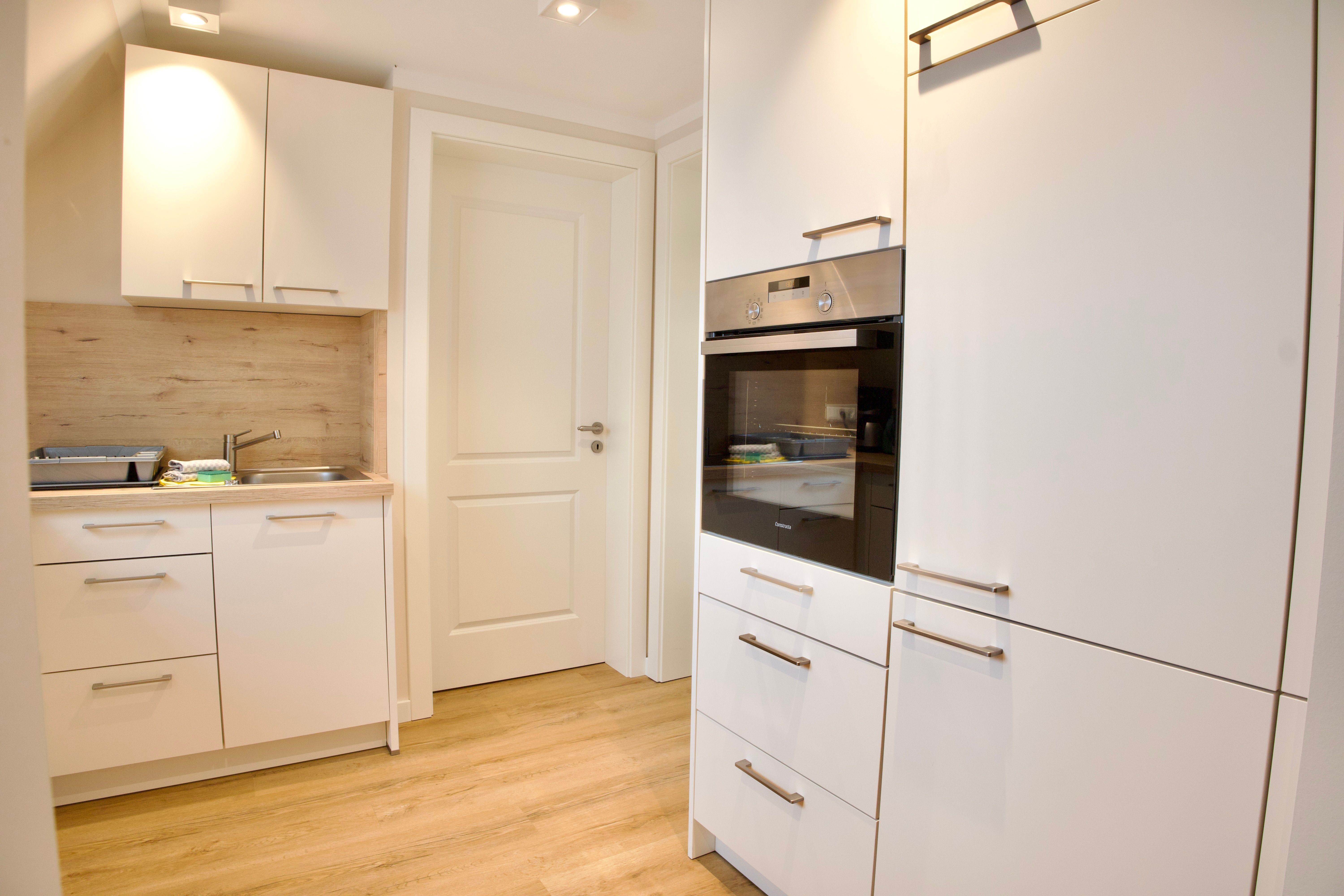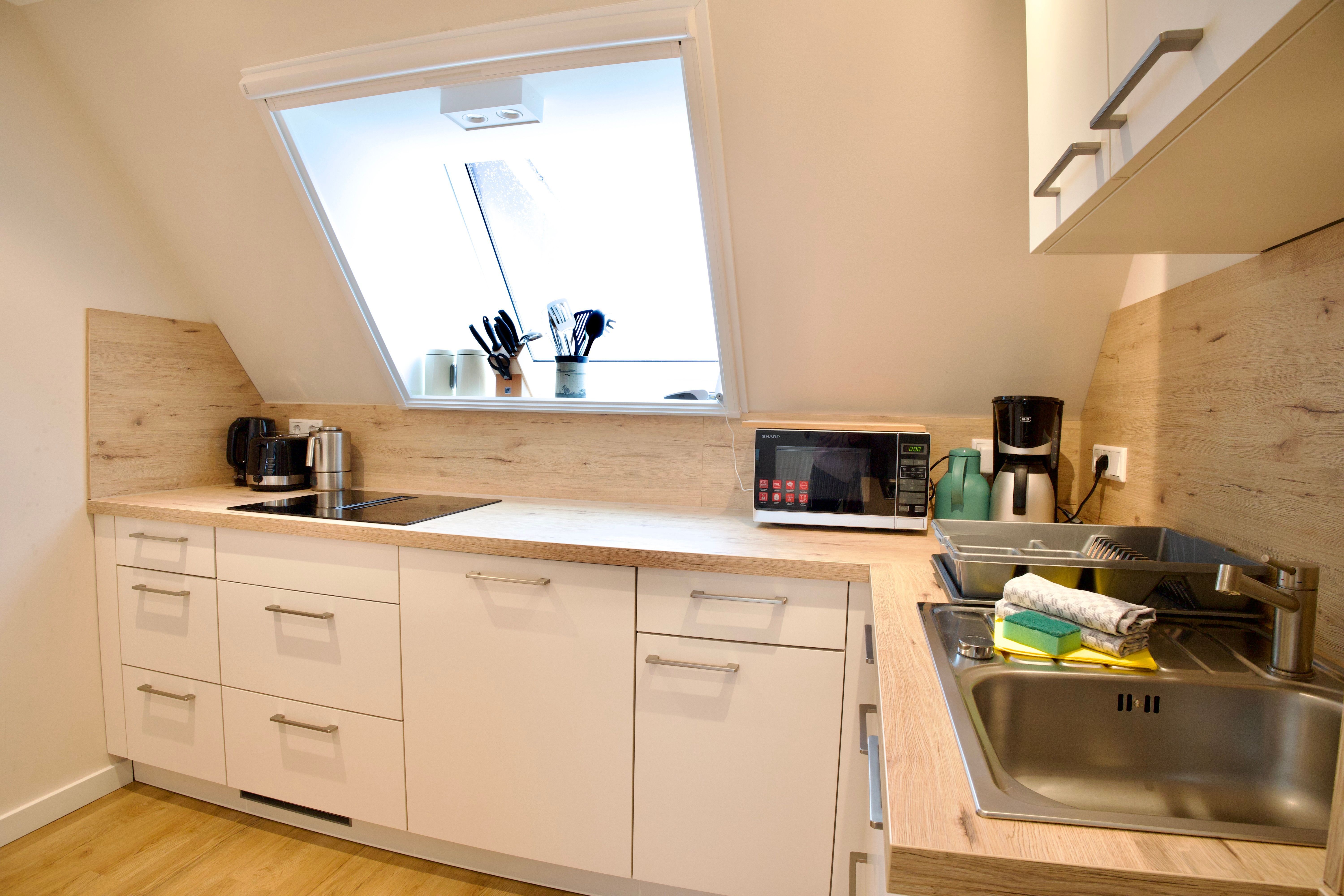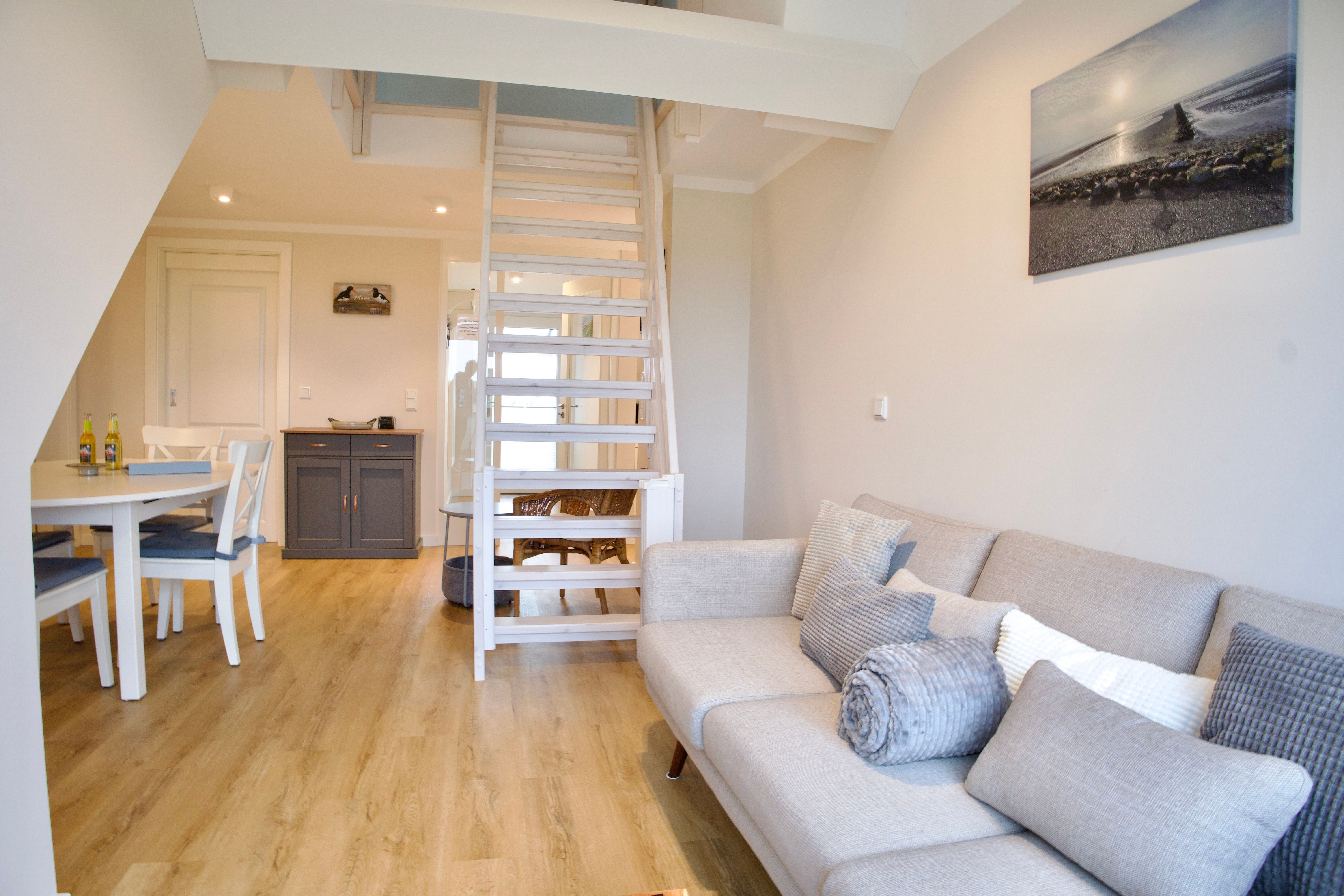 Der großzügige Wohnraum ist offen gestaltet und verbindet Wohnen, Essen und Kochen miteinander. Die Küche ist hell gehalten, verfügt über ein Fenster und lässt keine Wünsche für die Selbstversorgung im Urlaub offen, unter anderem mit Spülmaschine, Kaffeemaschine, Gefriermöglichkeit und Waschmaschine. Eine gemütliche Couch, ein Esstisch sowie ein Smart-TV schaffen einen zentralen Treffpunkt für gemeinsame Zeit. Vom Wohnbereich aus gelangen Sie auf den Balkon mit Blick auf den Deich.