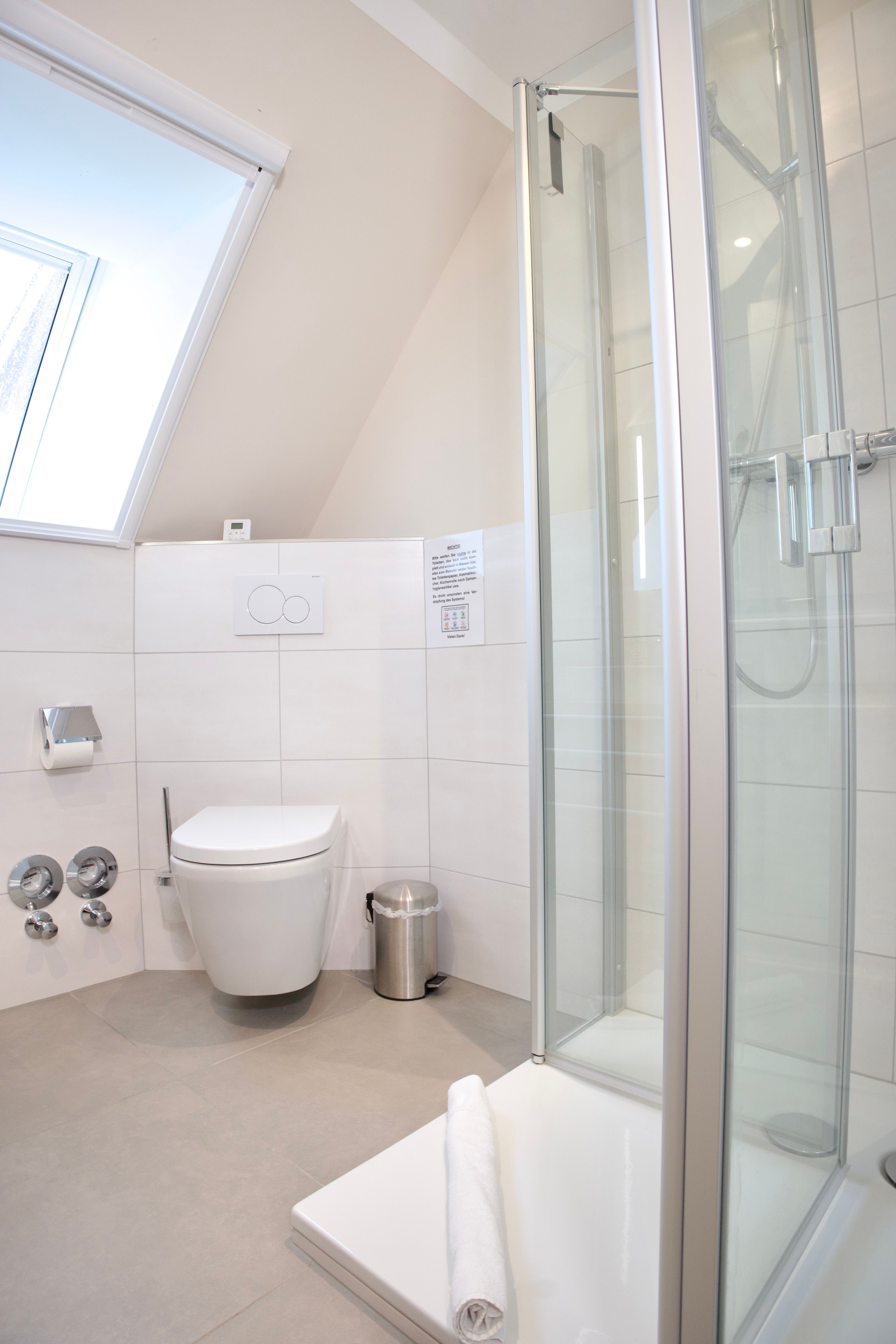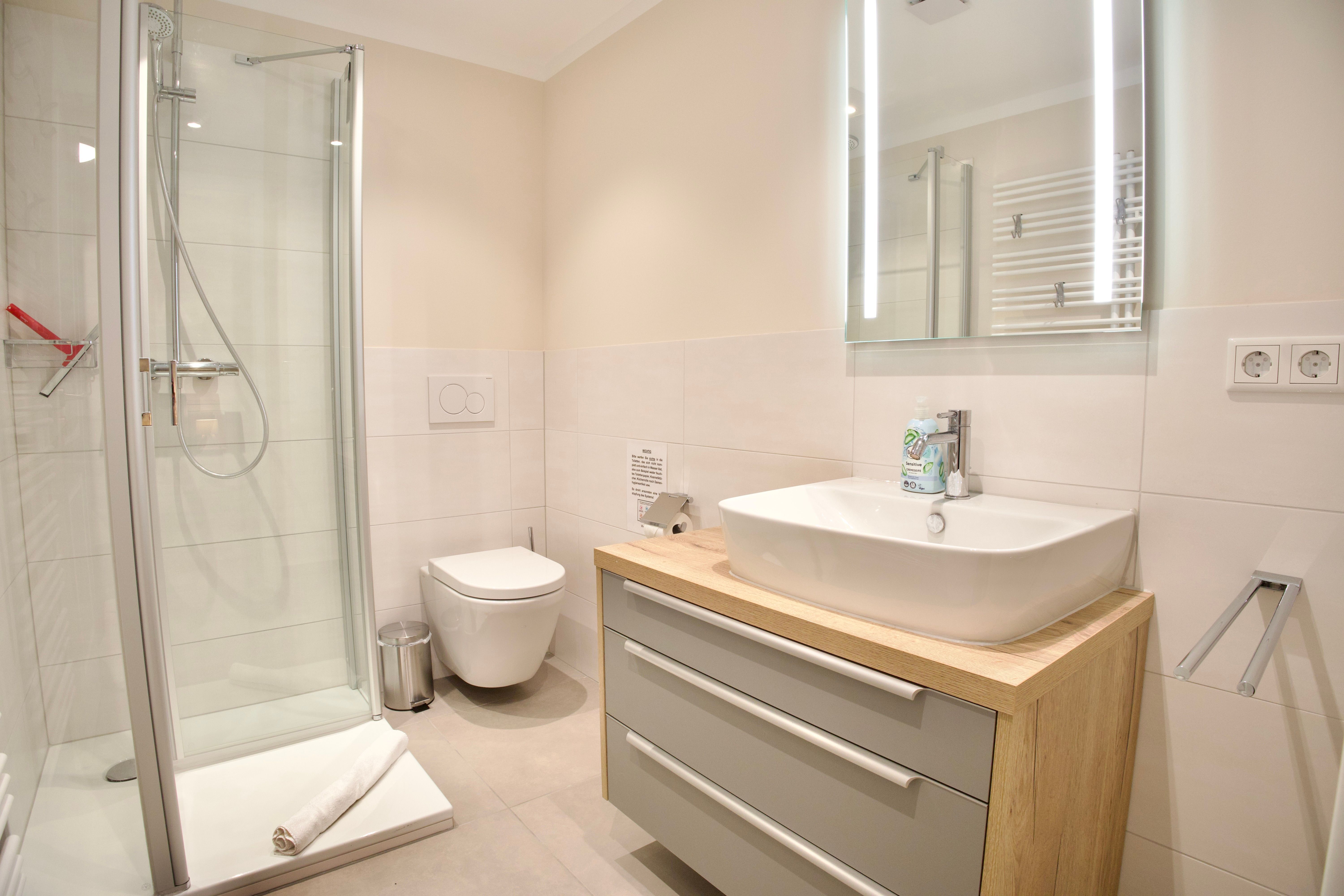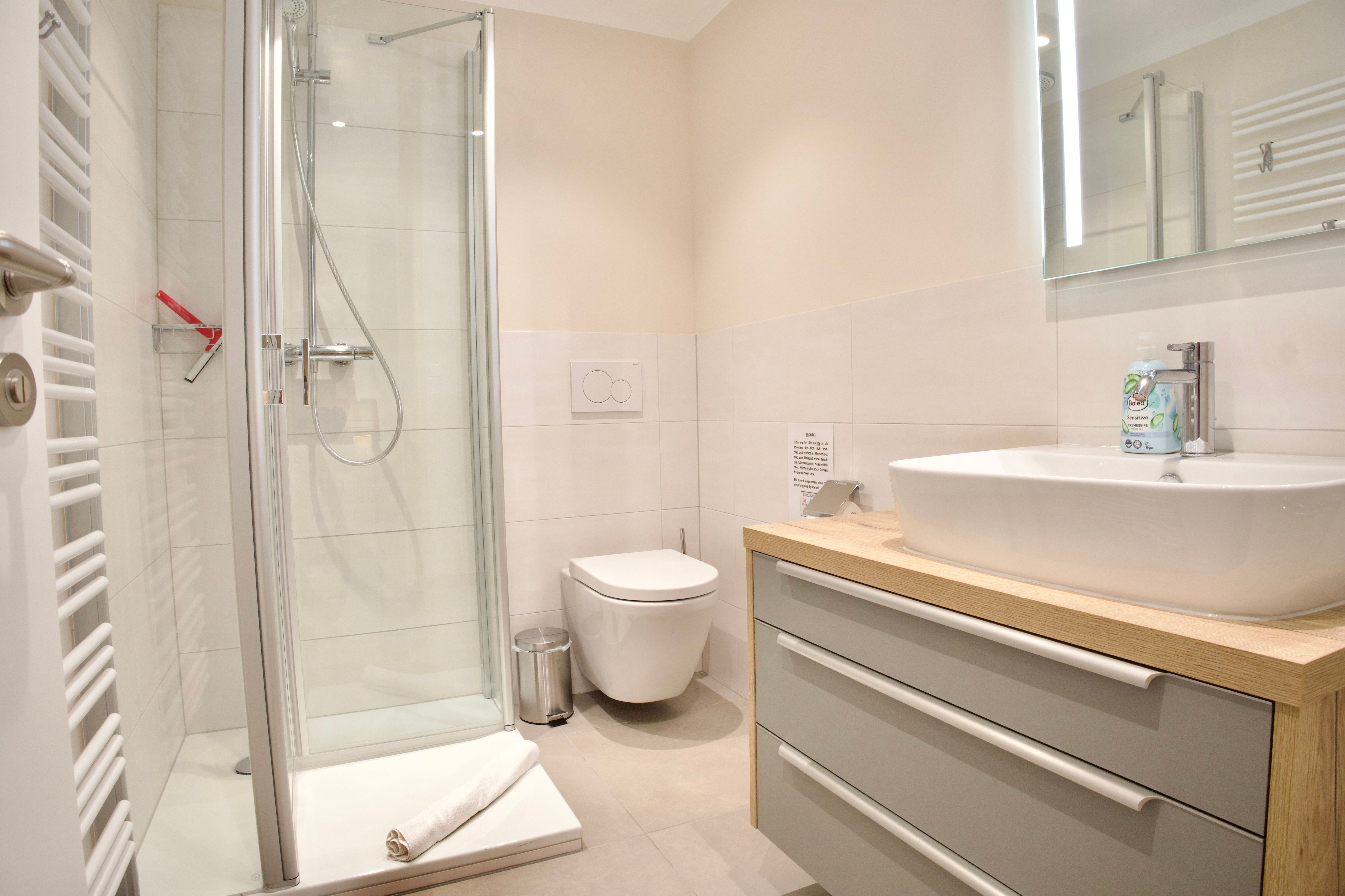Ein weiteres modernes Duschbad ergänzt die Ausstattung der Wohnung und ist großzügig gestaltet mit ausreichend Stauraum. Zur Wohnung gehört außerdem eine voll möblierte Sonnenterrasse zur Südseite, die zum Verweilen im Freien einlädt. Ein abschließbarer Fahrradraum mit Stromanschluss für E-Bikes steht zur Verfügung, ebenso eine Lademöglichkeit für E-Autos am Haus.