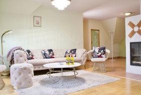Herzstück der Wohnung ist das große Wohnzimmer. Eine gemütliche Sitzecke, der Esstisch sowie der Kamin bilden einen offenen Wohnbereich mit viel Platz für gemeinsame Zeit. Der Blick aus dem Wohnzimmer reicht weit über die umliegenden Felder und vermittelt ein Gefühl von Ruhe und Weite. Für entspannte Abende steht hier ein 65-Zoll-Smart-TV zur Verfügung, der den Wohnkomfort dezent ergänzt.