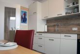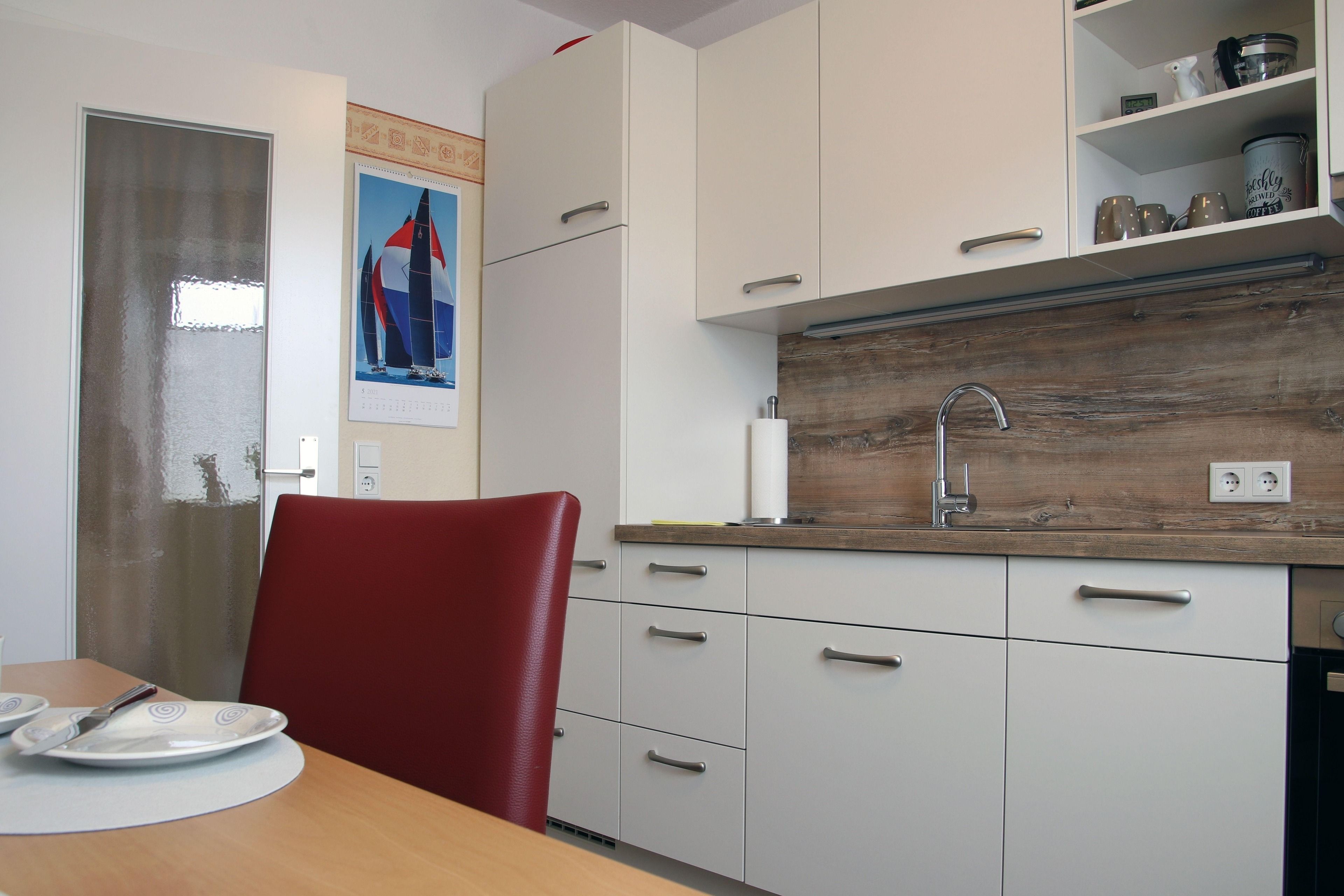 Die separate geräumige Küche ist ausgestattet mit Cerankochfeld und Backofen, Dunstabzugshaube, Spülmaschine, Kühlschrank mit Gefrierfach, Mikrowelle mit Grill. Diverse Küchenkleingeräte vervollständigen die Ausstattung. Der Küchentisch mit bequemen Stühlen lädt zum Verweilen ein.