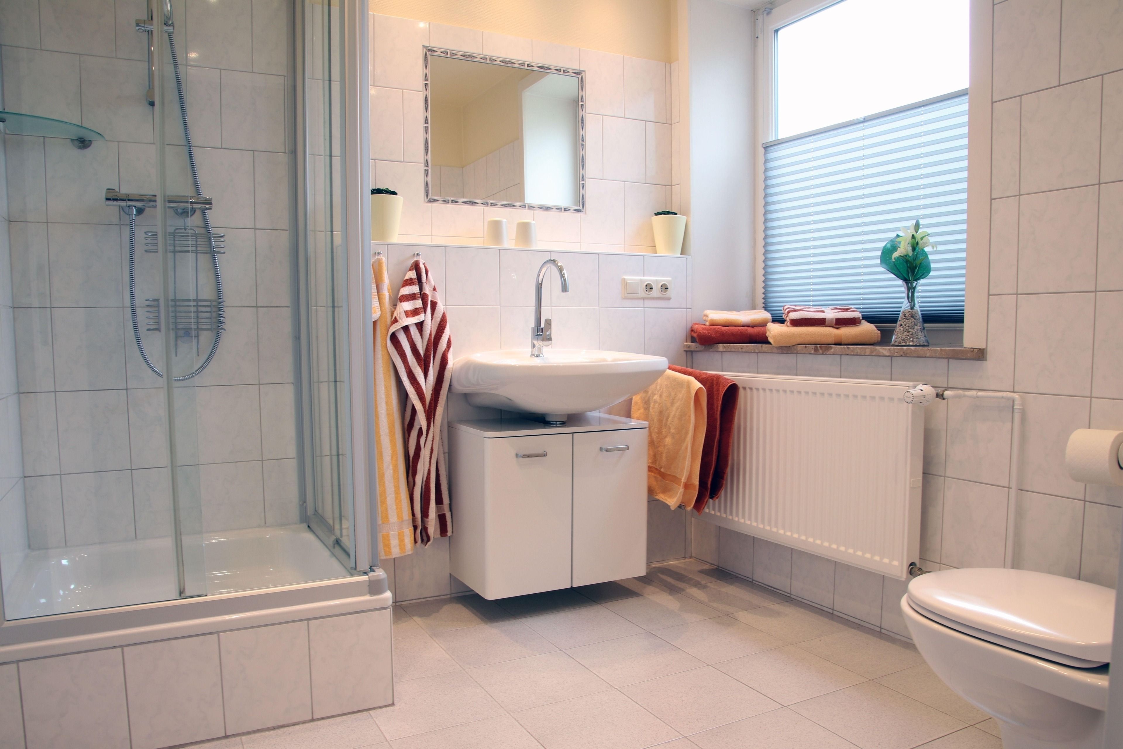 Das helle Bad mit Fenster ist mit einer Dusche ausgestattet.