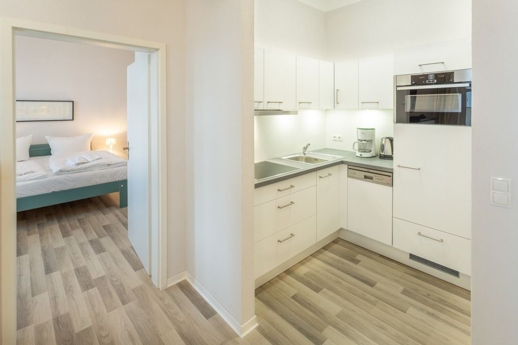 Halboffene, hochwertige Küche, voll ausgestattet u. a. mit Spülmaschine, Kühlschrank mit Gefrierfach, Backofen mit integrierter Mikrowelle, Cerankochfeld mit TouchControl Bedienung, Kaffeemaschine, Wasserkocher und Toaster.