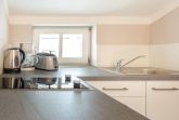 Kleine Küche, ausgestattet mit Kühlschrank, Vario Cerankochfeld 30cm, Kaffeemaschine, Wasserkocher und Toaster.