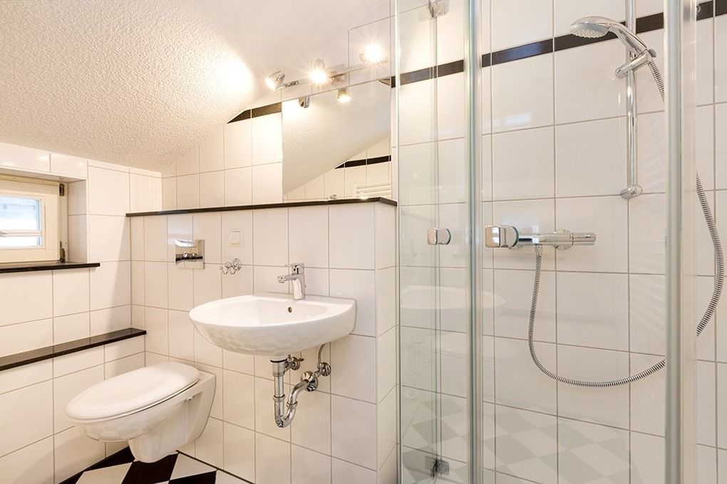 Kleines Badezimmer mit Fenster, Glasdusche, Waschbecken, Spiegel, WC, Handtuchheizkörper und Föhn (Dachschräge)