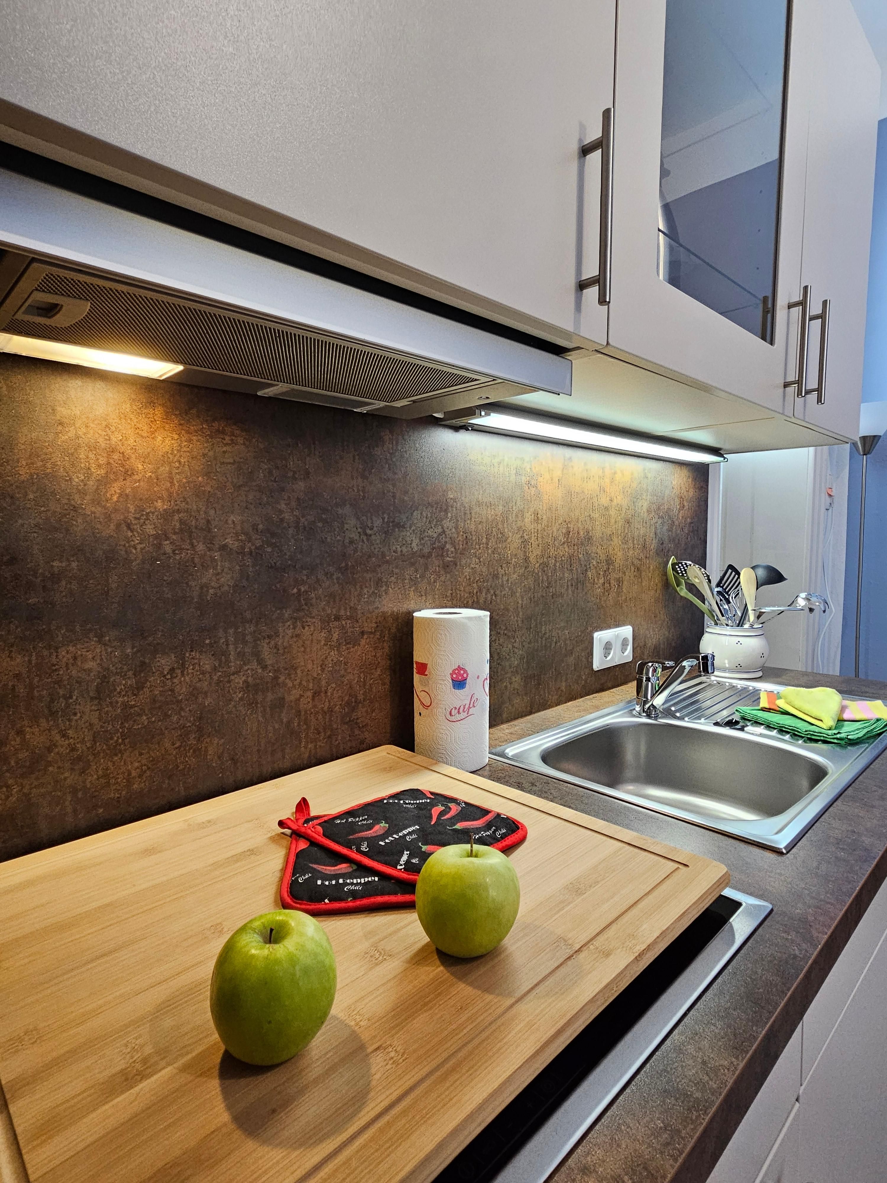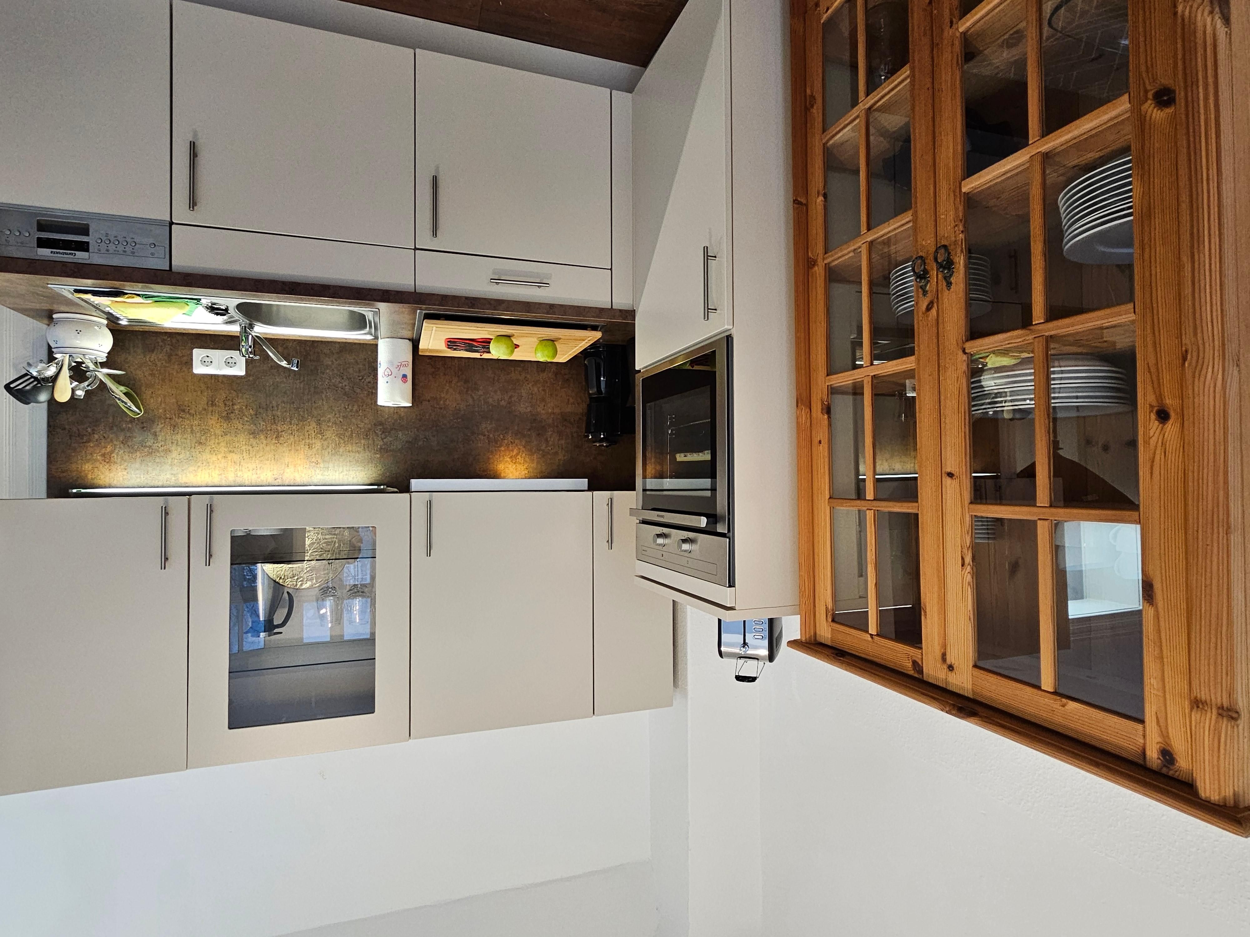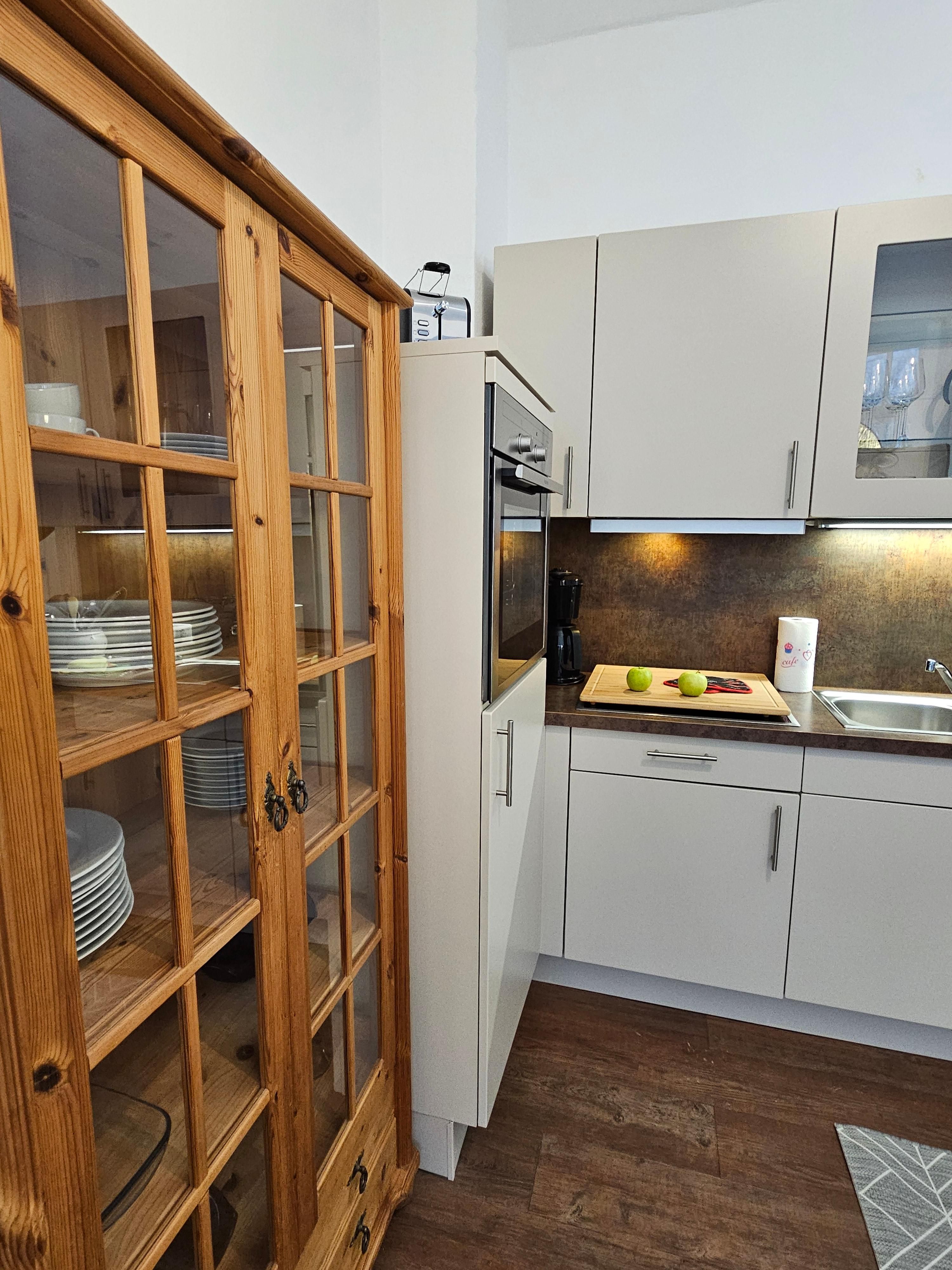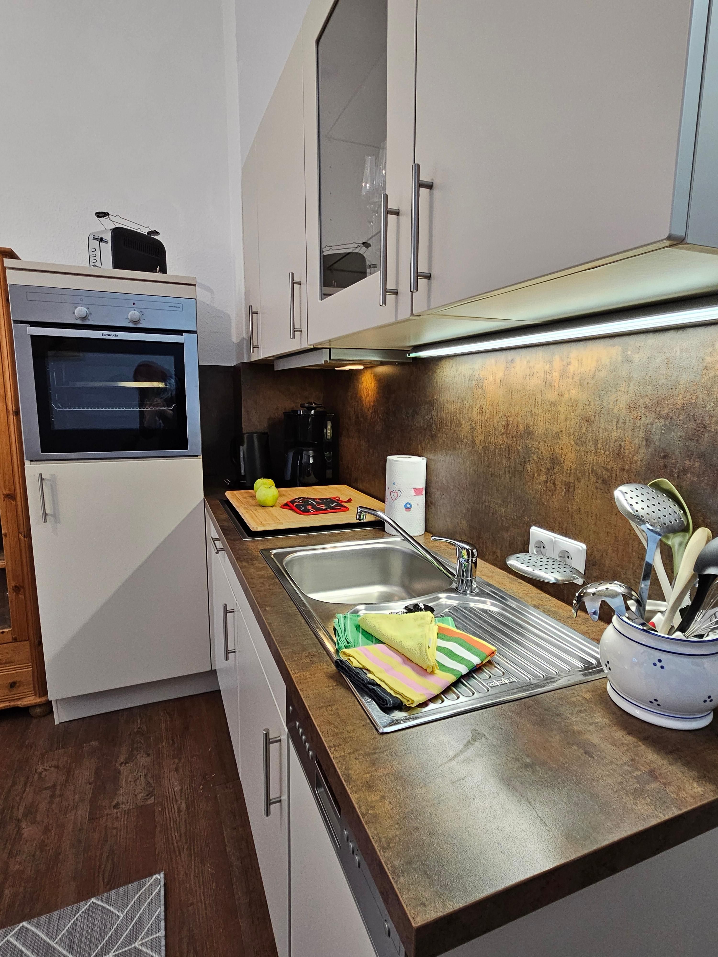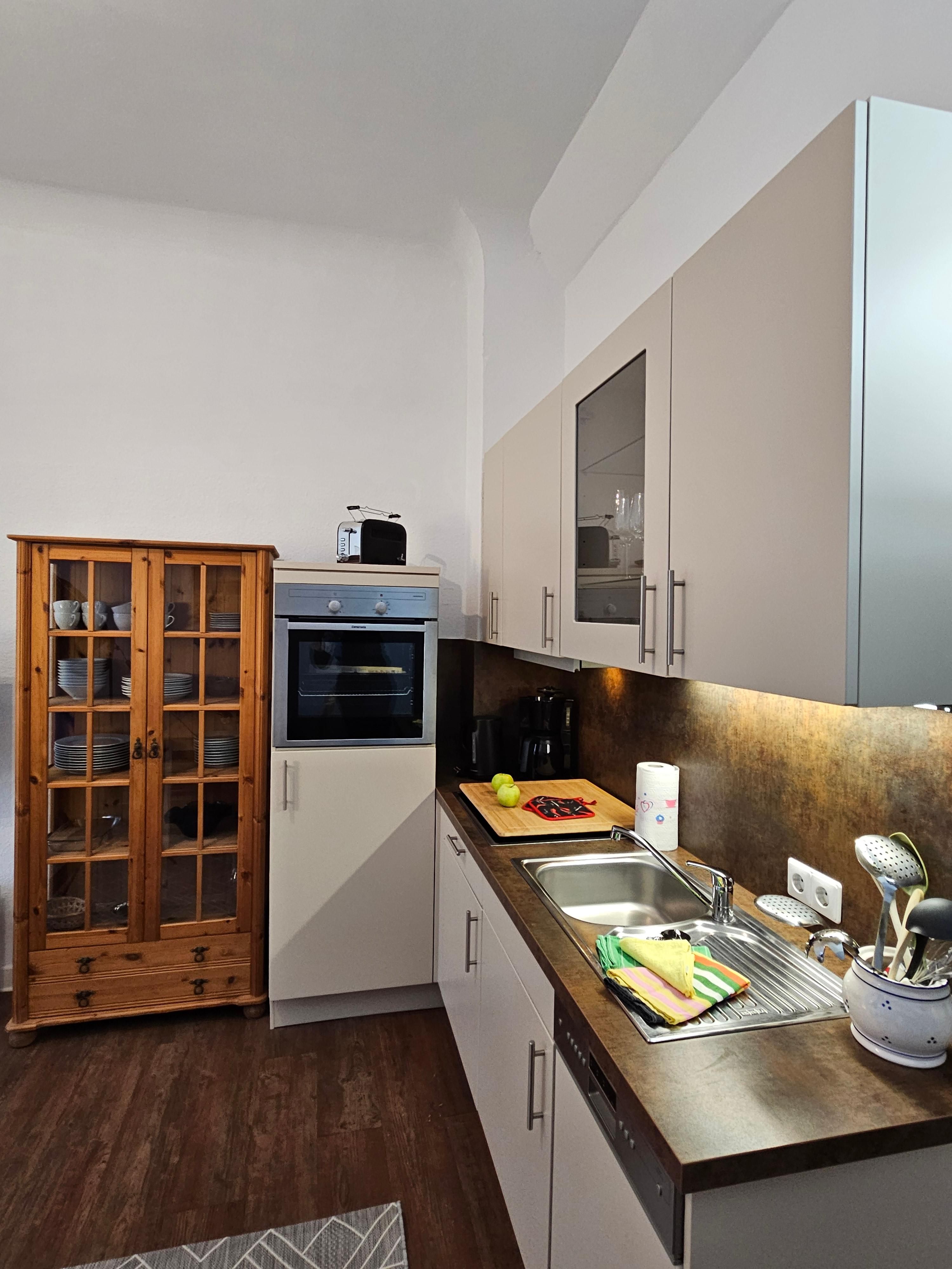 - Küchenzeile mit Kaffeemaschine, Wasserkocher, Toaster, Kühlschrank, Backofen Spülmaschine
