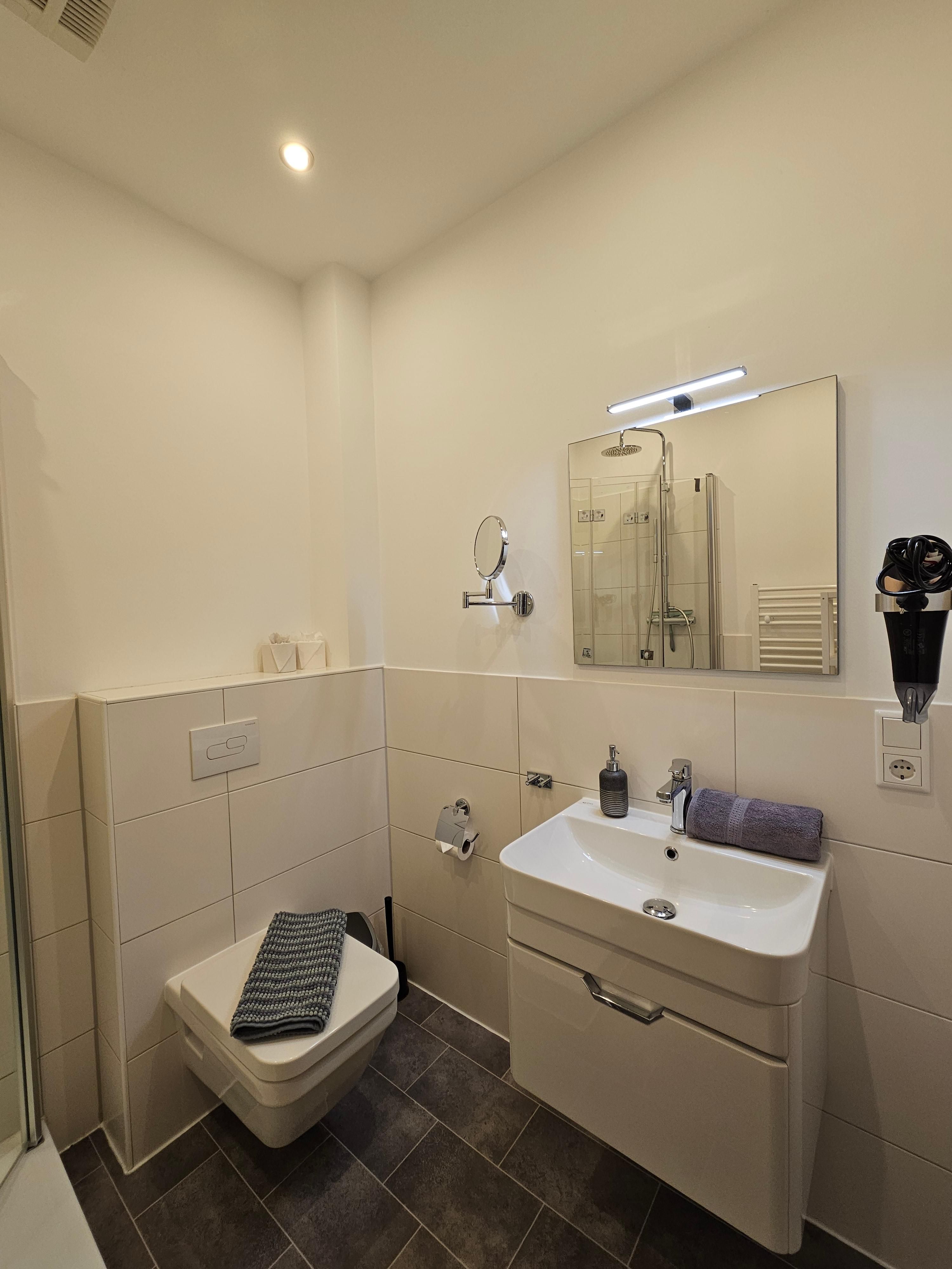 - Badezimmer mit Kosmetikspiegel und Haartrockner