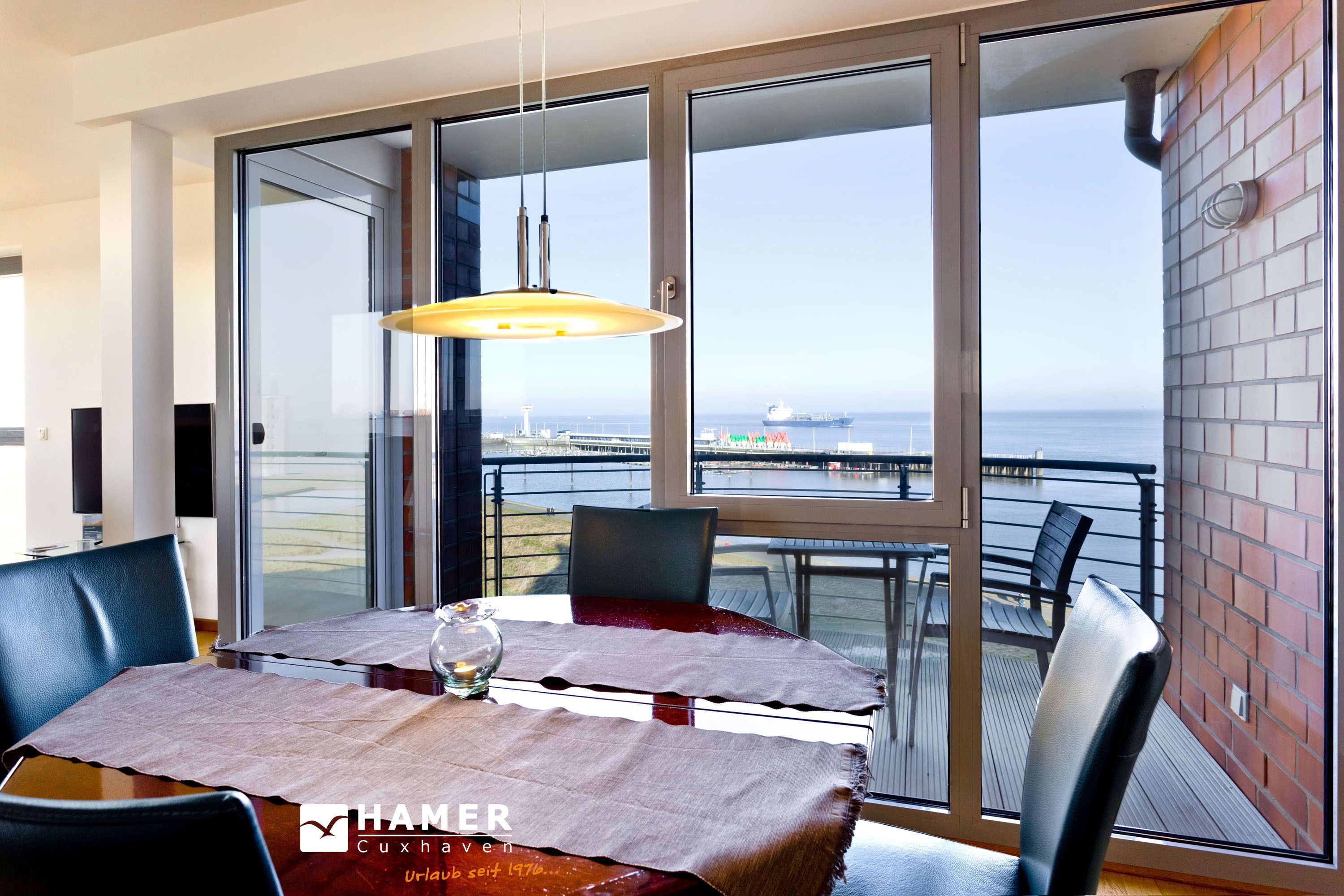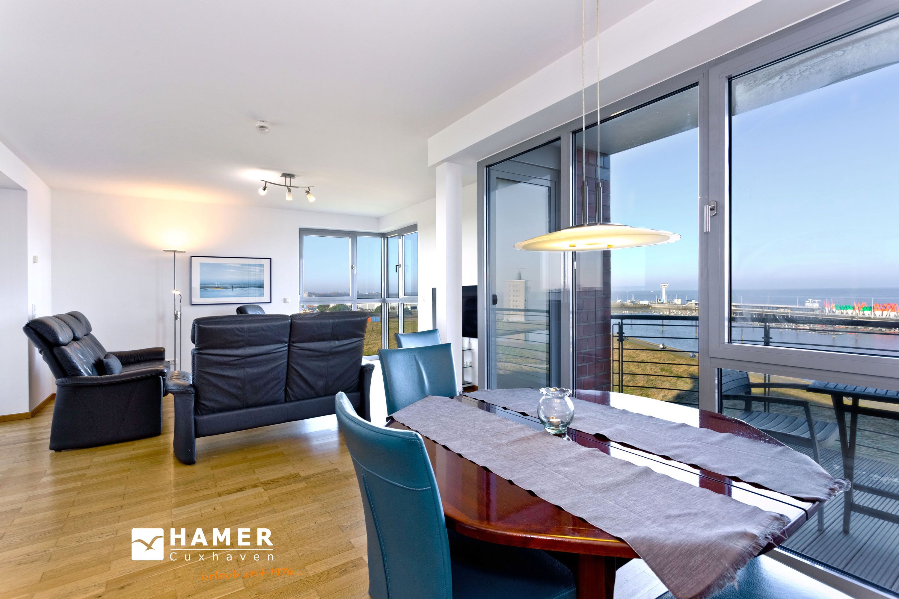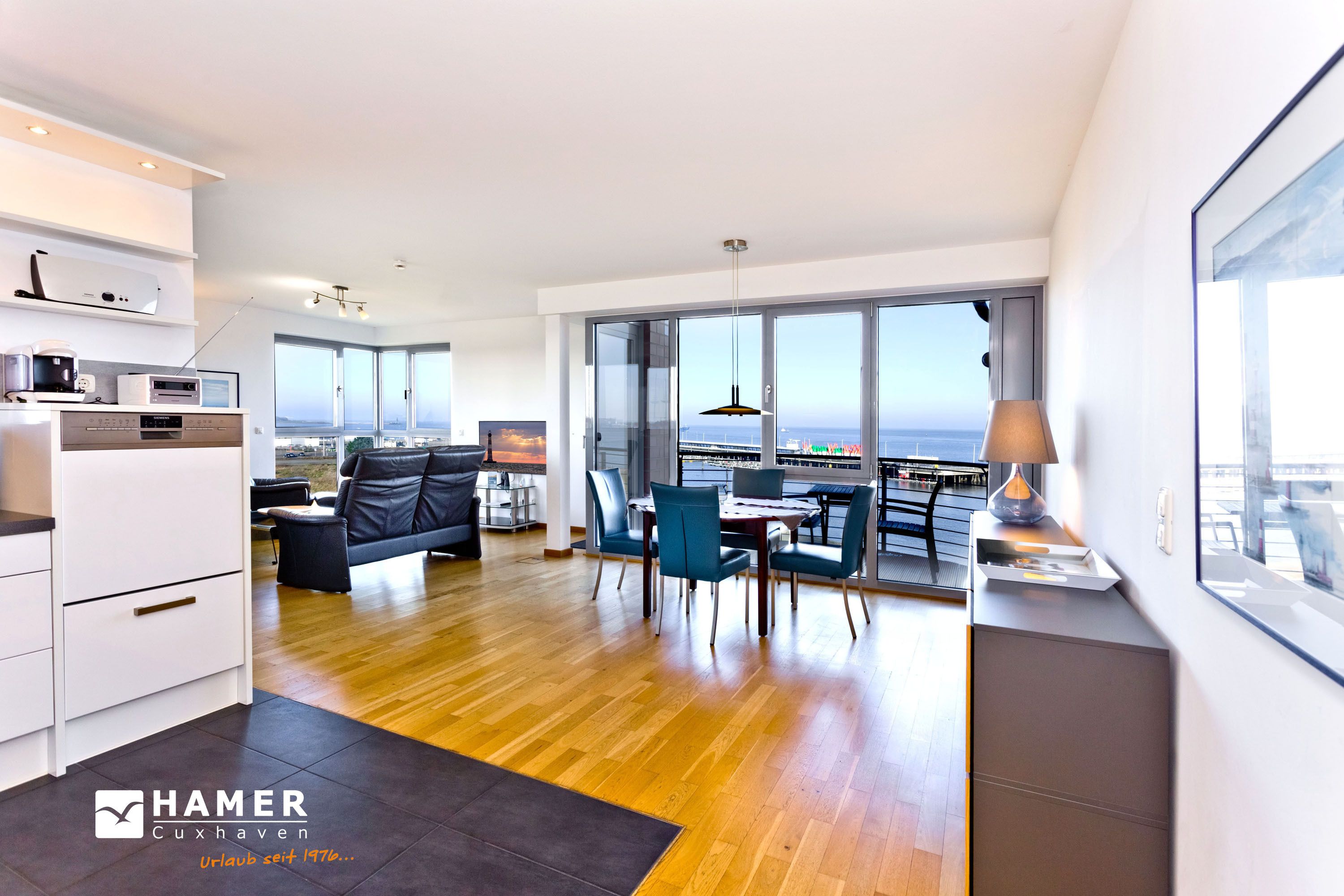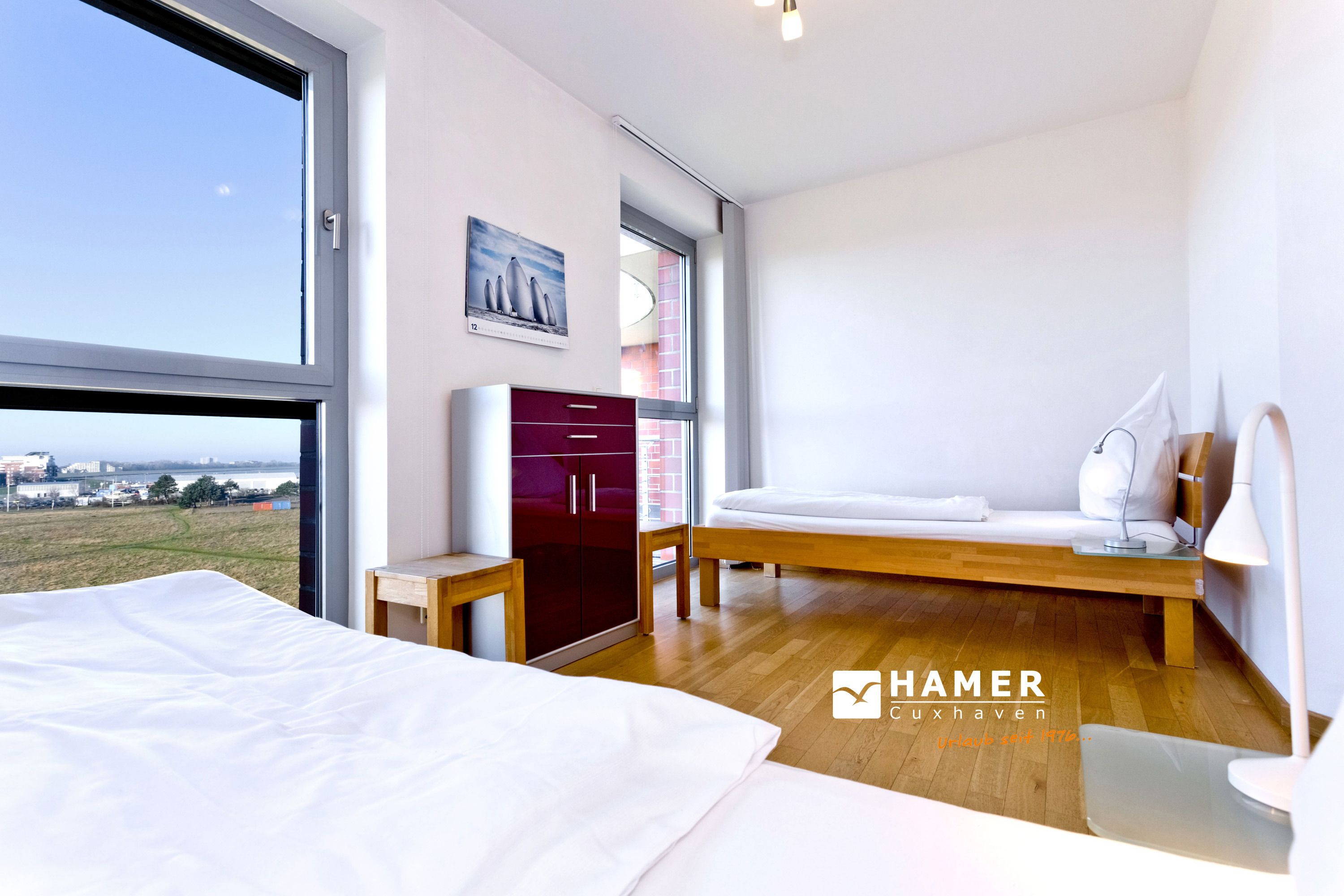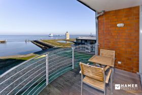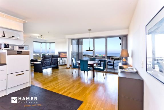 Traumwohnung! Aus allen drei Räumen dieser 105m² Wohnung in der 4.Etage haben Sie die Traumseesicht auf den Weltschifffahrtsweg. 1 Schlafzimmer mit Doppelbett, 1 Schlafzimmer mit Einzelbetten, Du/Wc, Föhn, Gäste-WC, begehbarer Kleiderschrank, großes Wohnzimmer mit komplett ausgestatteter Küchenzeile, 2 Balkone (nord+süd). Alle Räume sind hochwertig mit Parkett gestaltet und verfügen über Rollladen. Zur Wohnung gehört ein reservierter Stellplatz in der Tiefgarage (schmal, zur Wand). Nichtraucher, keine Haustiere erlaubt.