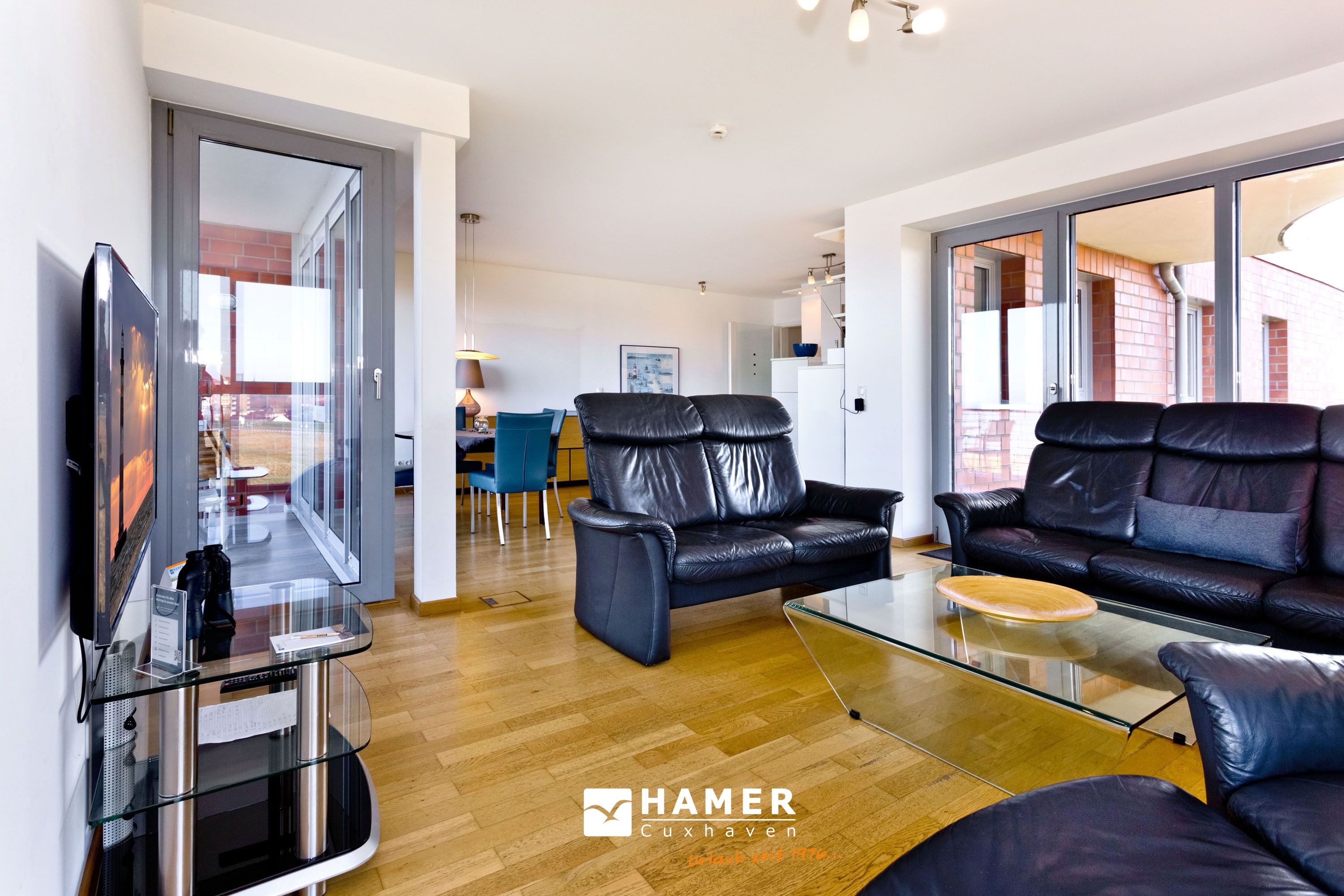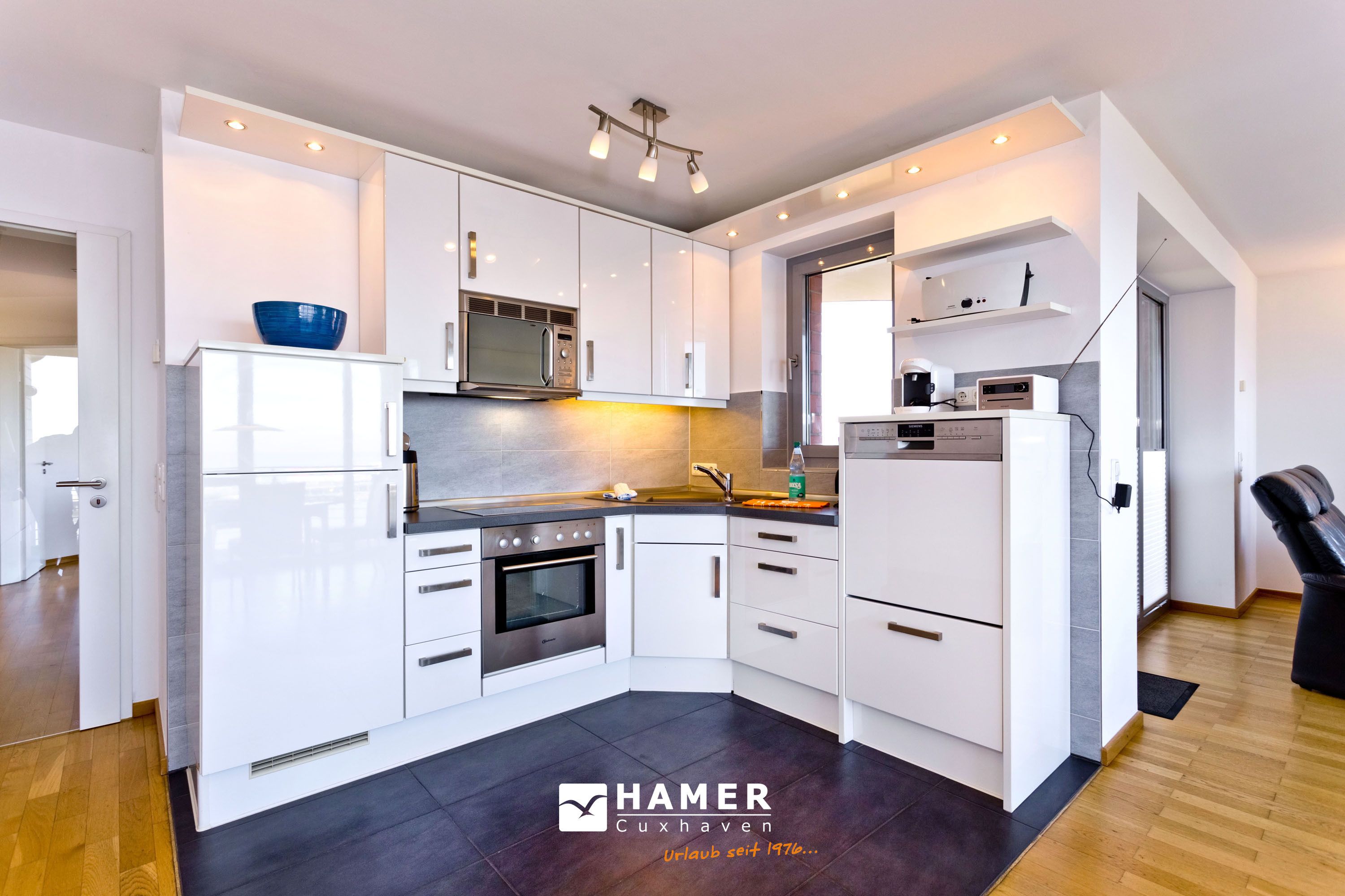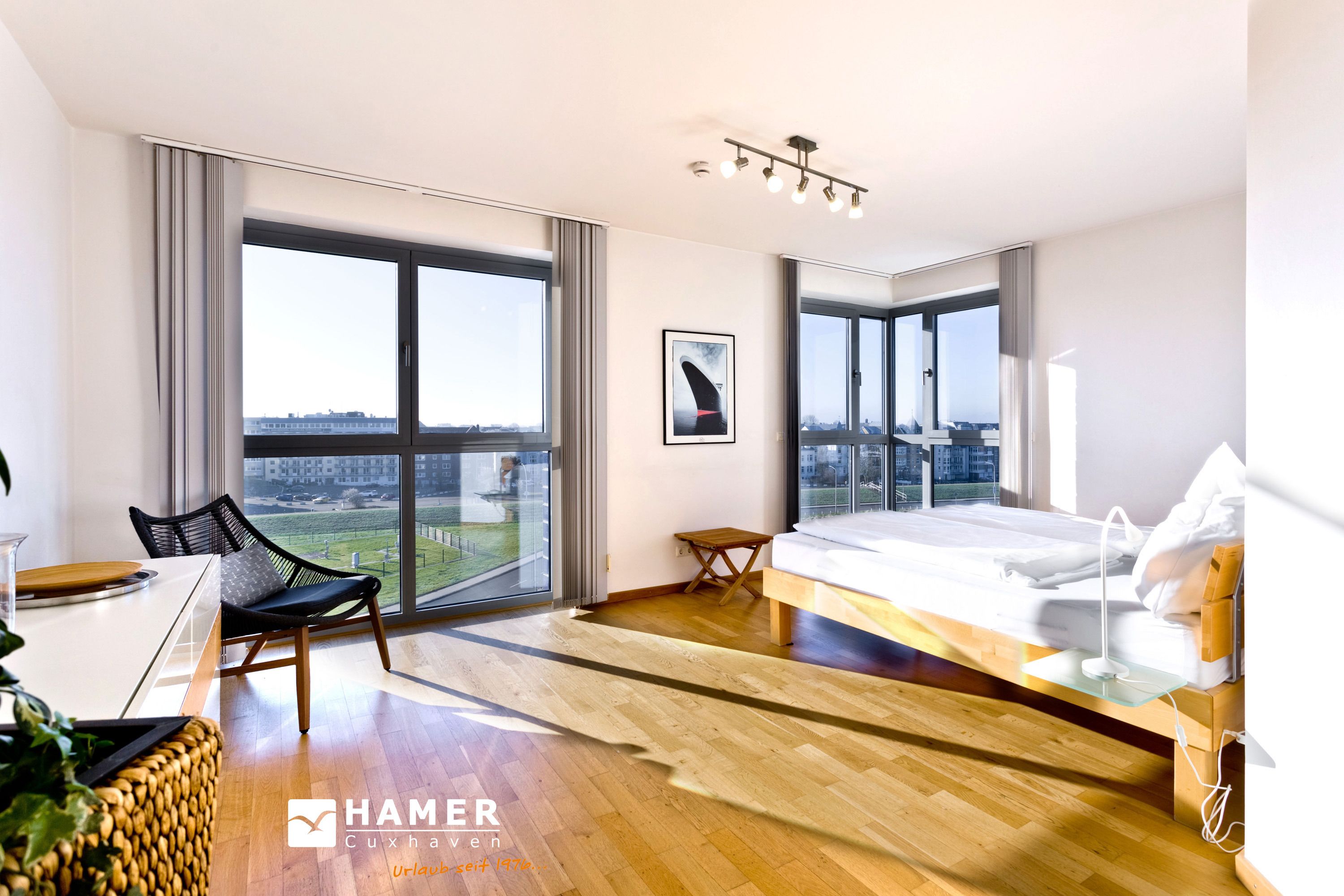 Traumwohnung! Aus allen drei Räumen dieser 105m² Wohnung in der 4.Etage haben Sie die Traumseesicht auf den Weltschifffahrtsweg. 1 Schlafzimmer mit Doppelbett, 1 Schlafzimmer mit Einzelbetten, Du/Wc, Föhn, Gäste-WC, begehbarer Kleiderschrank, großes Wohnzimmer mit komplett ausgestatteter Küchenzeile, 2 Balkone (nord+süd). Alle Räume sind hochwertig mit Parkett gestaltet und verfügen über Rollladen. Zur Wohnung gehört ein reservierter Stellplatz in der Tiefgarage (schmal, zur Wand). Nichtraucher, keine Haustiere erlaubt.