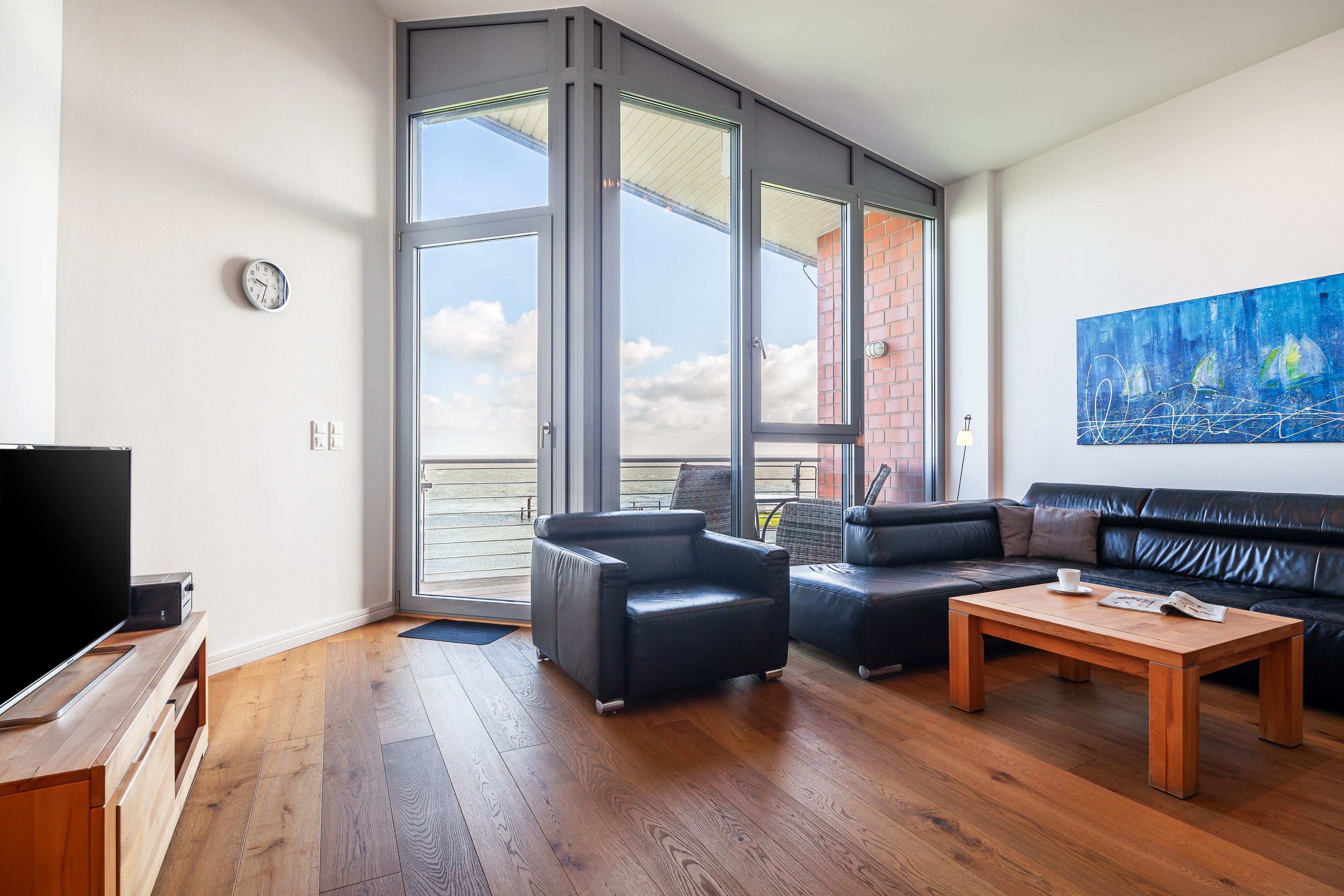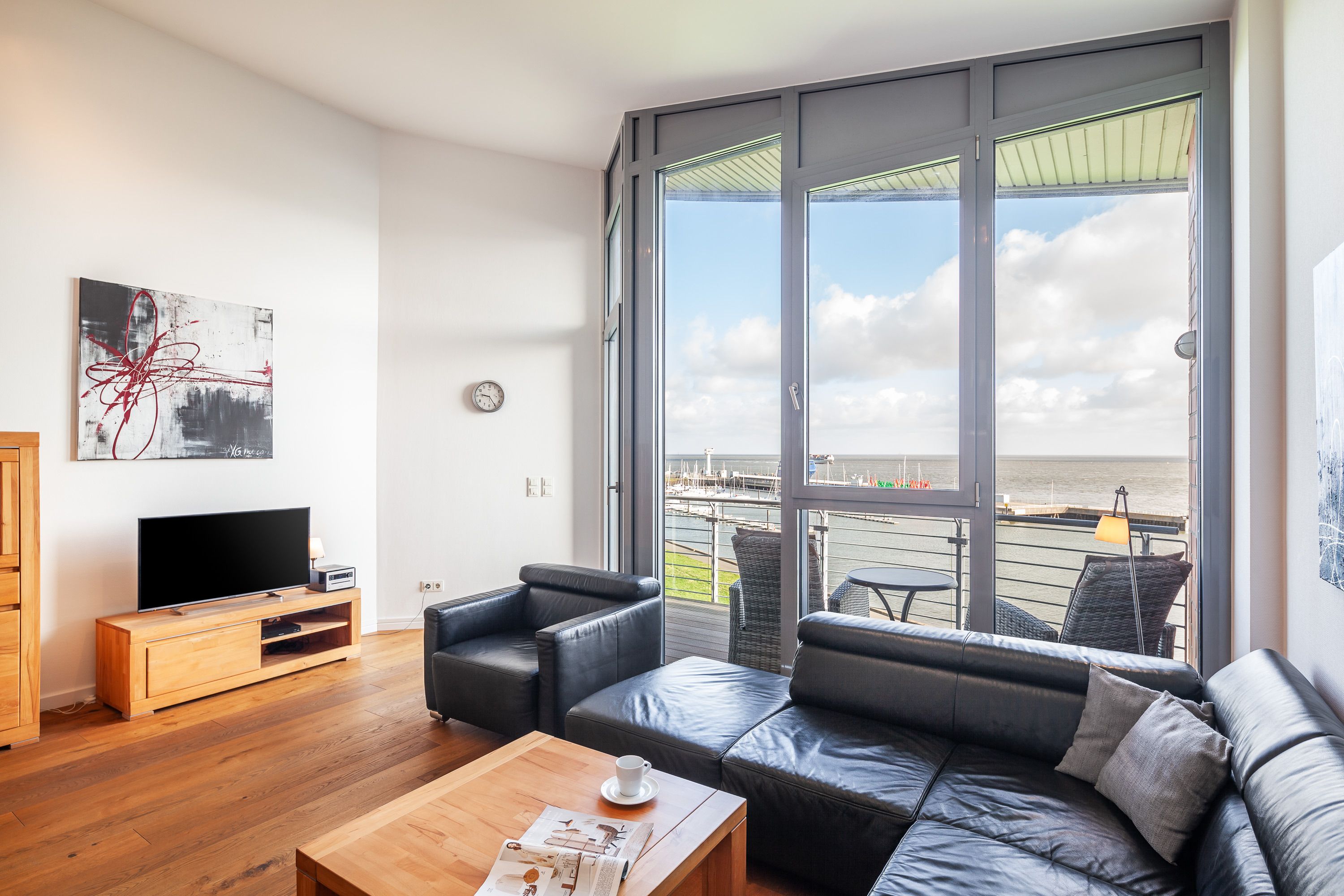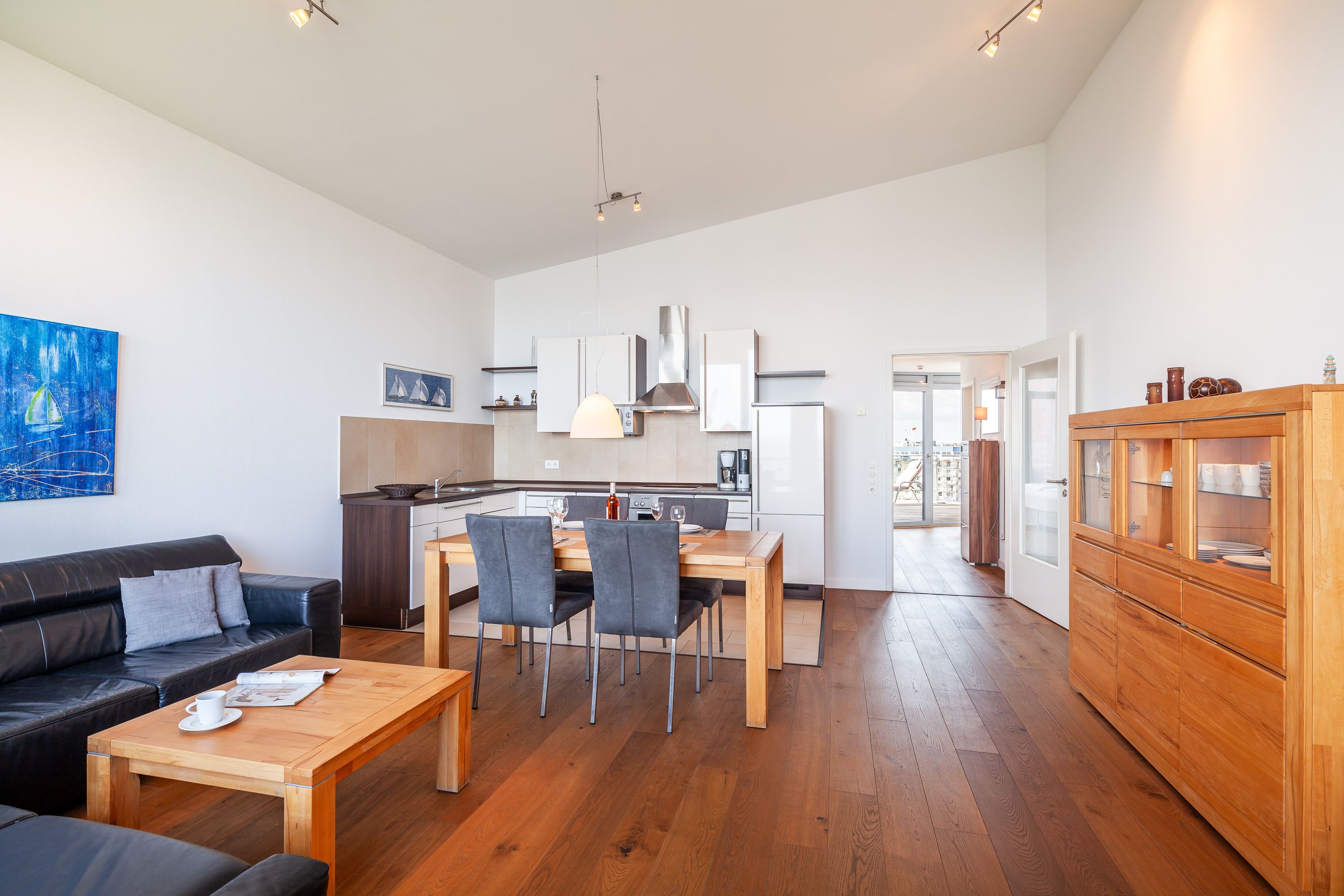 Die Penthousewohnung! 5.Etage mit dem absoluten Blick auf den Elbstrom. (Die Webcam befindet sich an dieser Whg) Wohnzimmer mit Esstisch und geschmackvoller Sitzecke, 2xKabel/TV/Bluray, Stereoanlage, Balkon zur Seeseite, riesige Terrasse zur Südseite mit Blick auf den Hafen, vollständig ausgestattete Küchenzeile, Schlafzimmer mit Doppelbett (Boxspringbett) und elektr. Rollläden, Bad/Du/Wc mit Fön, die gesamte Wohnung ist hochwertig mit Parkett bzw. Fliesen ausgestattet, Fußbodenheizung, je ein reservierter Pkw-Stellplatz außen u. i. der Tiefgarage, keine Haustiere und natürlich Nichtraucher und keine Haustiere.