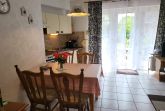 • Küchenzeile im Wohnraum mit 4 Kochstellen, Backofen, Abluft-Dunstabzug, Kühlschrank mit Gefrierfach, Spüle, Kaffeemaschine, Toaster und Wasserkocher, ausreichend Geschirr und Kochutensilien. Esstisch mit 4 Stühlen.