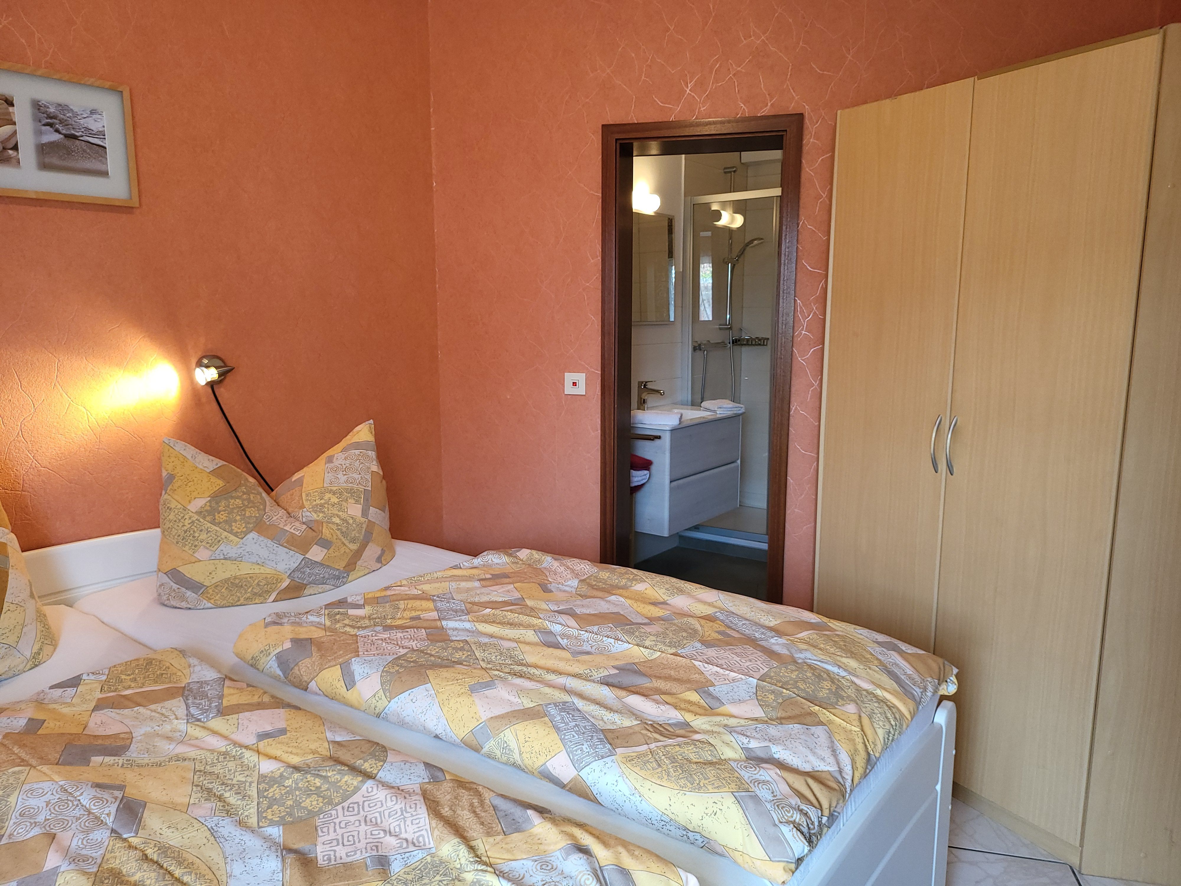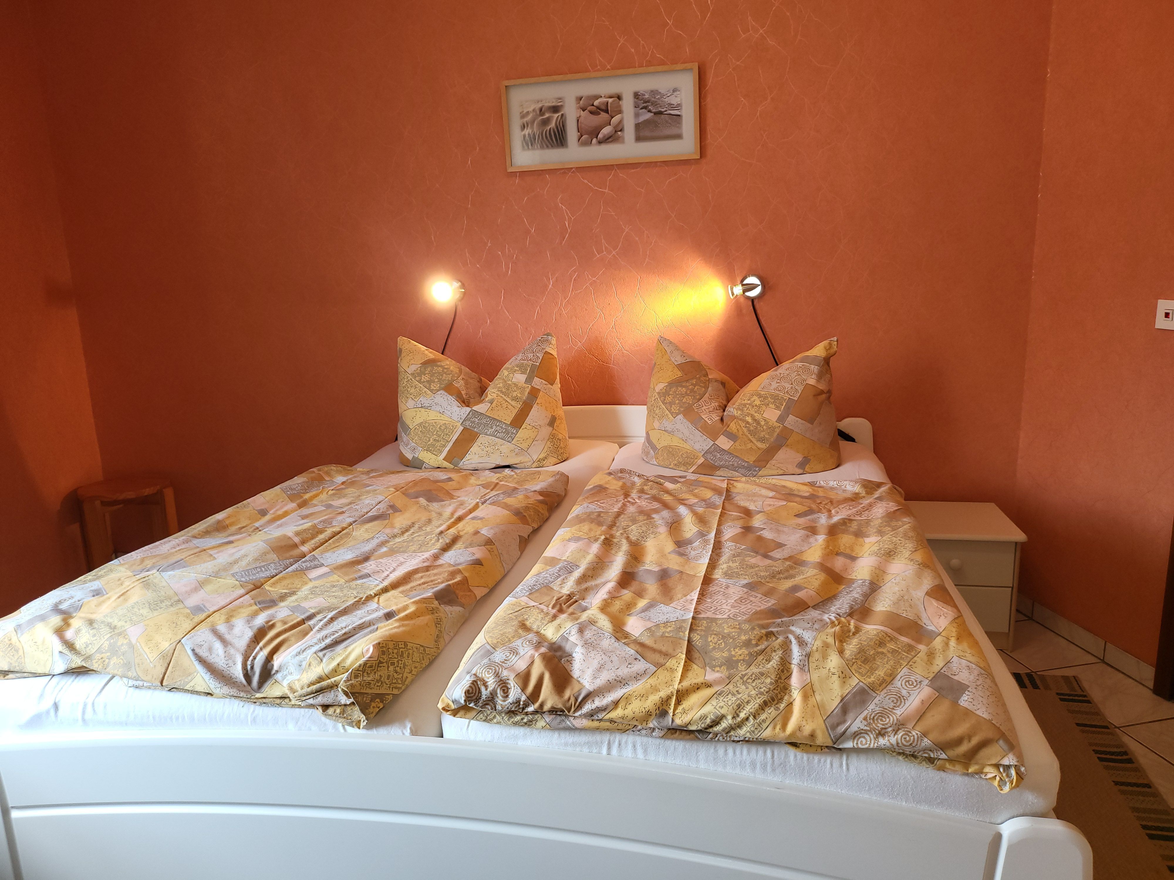 • Schlafraum in warmen Farbtönen gehalten, mit Doppelbett, großer Eck-Kleiderschrank, Kommode und Nachtschränke, Babybett bei Bedarf. Fußboden gefliest.