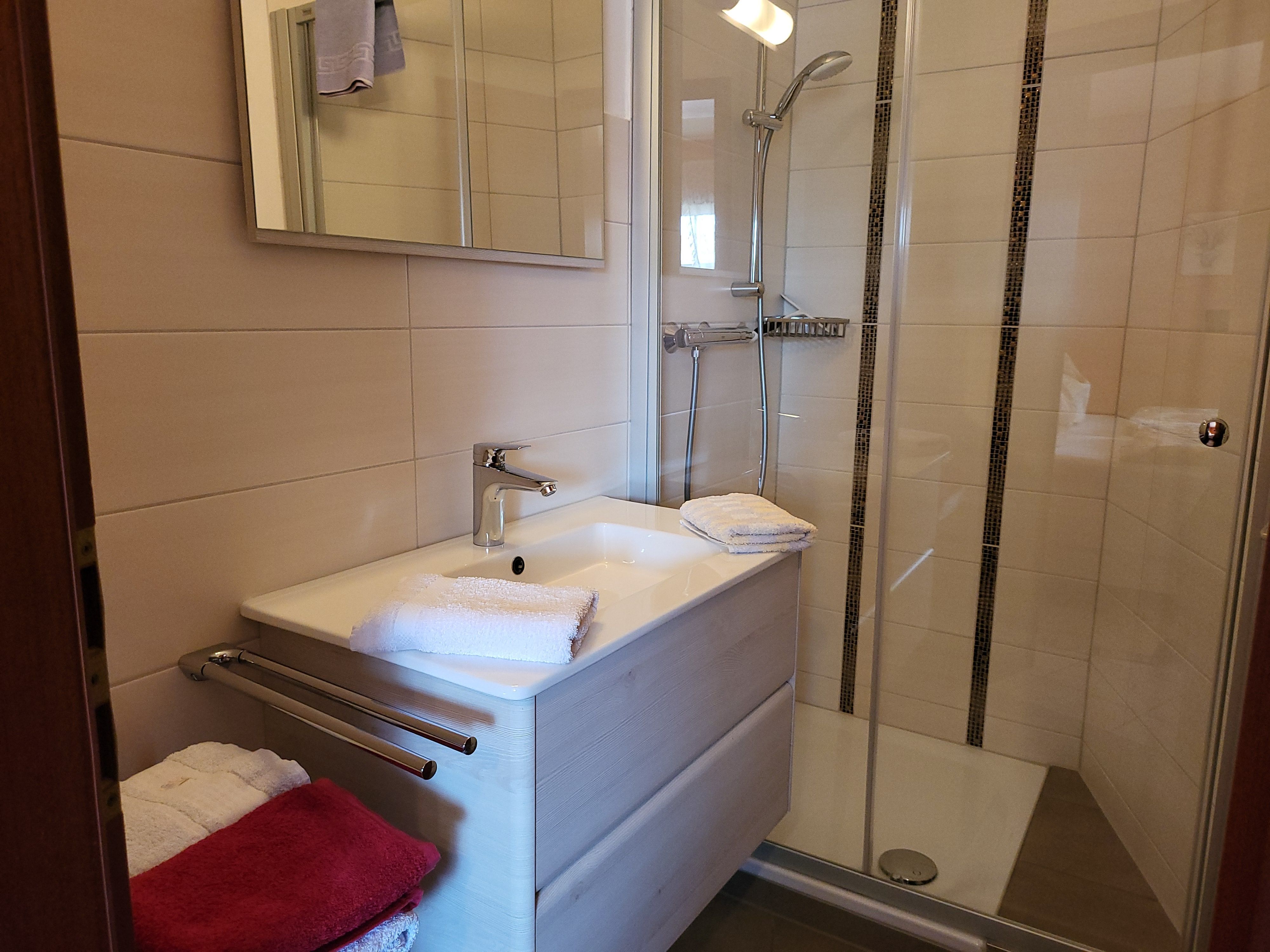 • Badezimmer, vom Schlafzimmer aus zugänglich. Neue bodengleiche Dusche und Waschbecken.