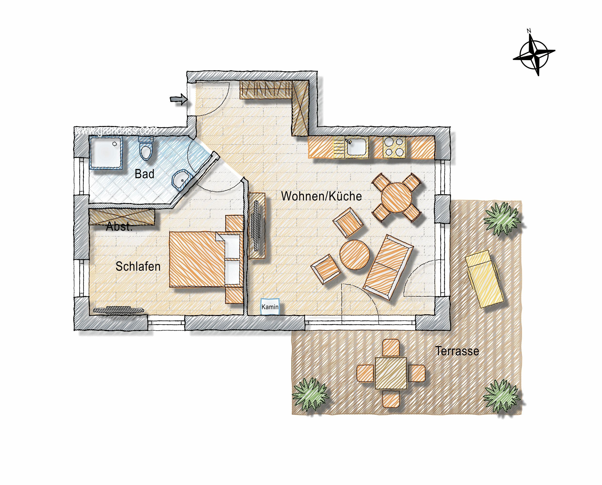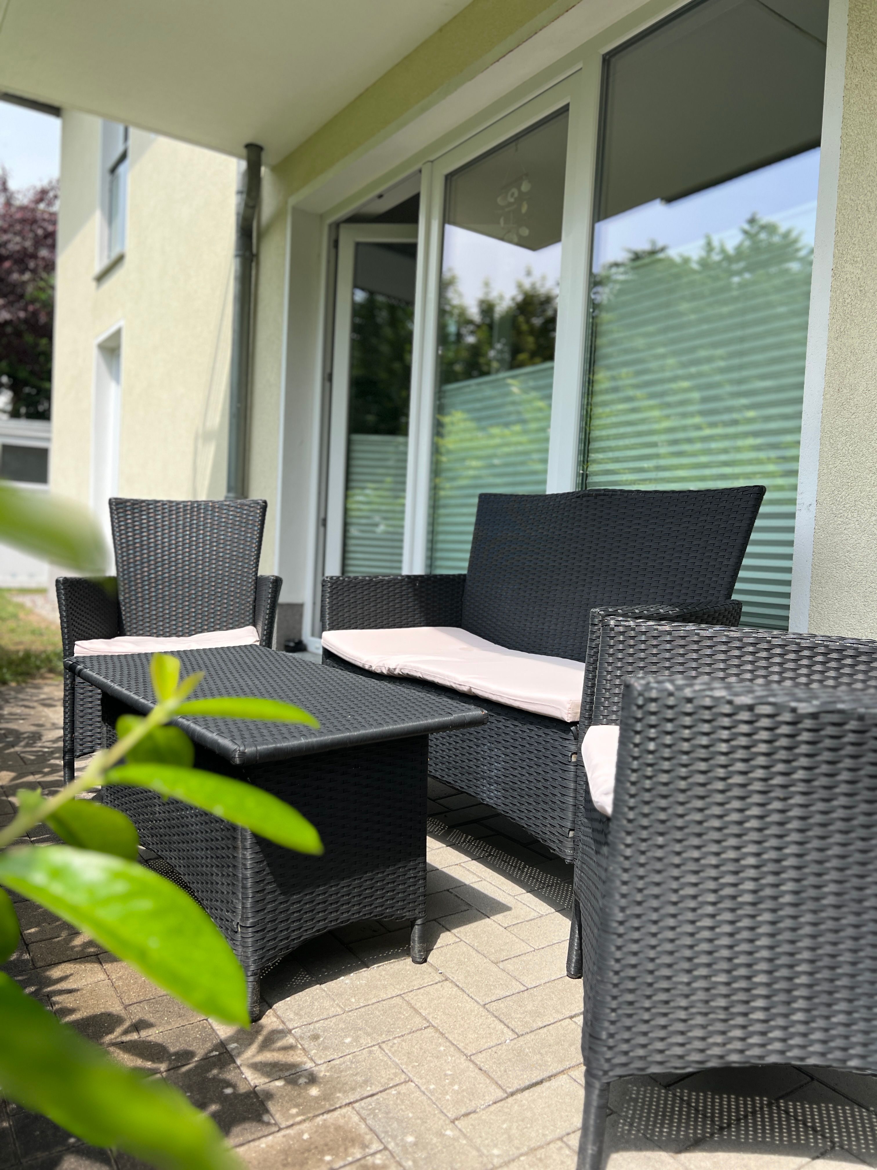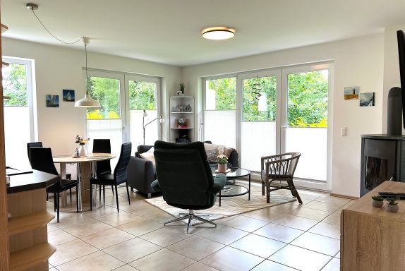 Die Wohnung befindet sich im Erdgeschoss und bietet einen hellen und gemütlichen Wohnbereich mit komfortablem Schlafsofa, eine voll ausgestattete Küche sowie ein Schlafzimmer mit bequemem Bett (160x200). Das moderne Badezimmer ist mit einer großzügige Dusche ausgestattet.