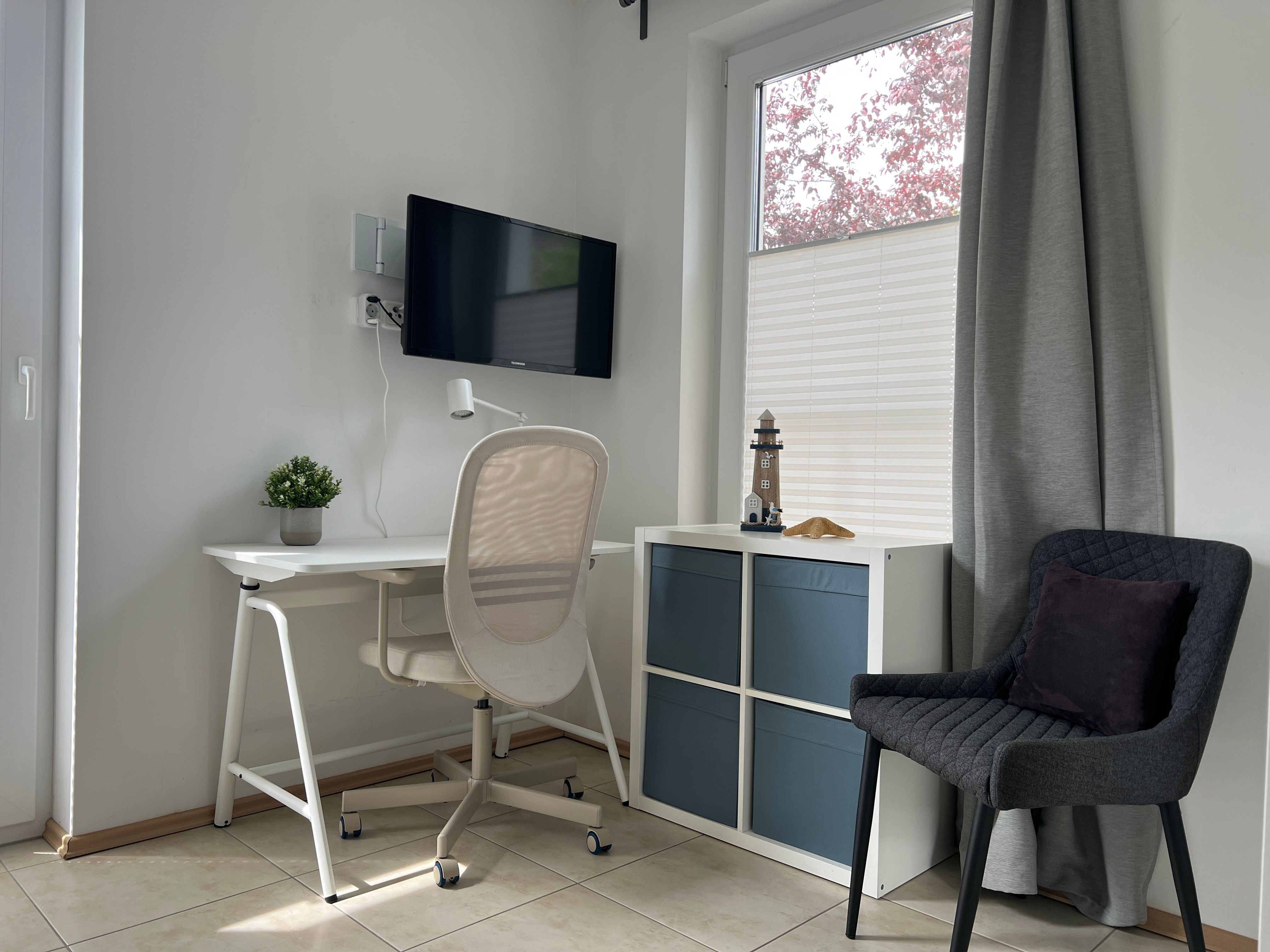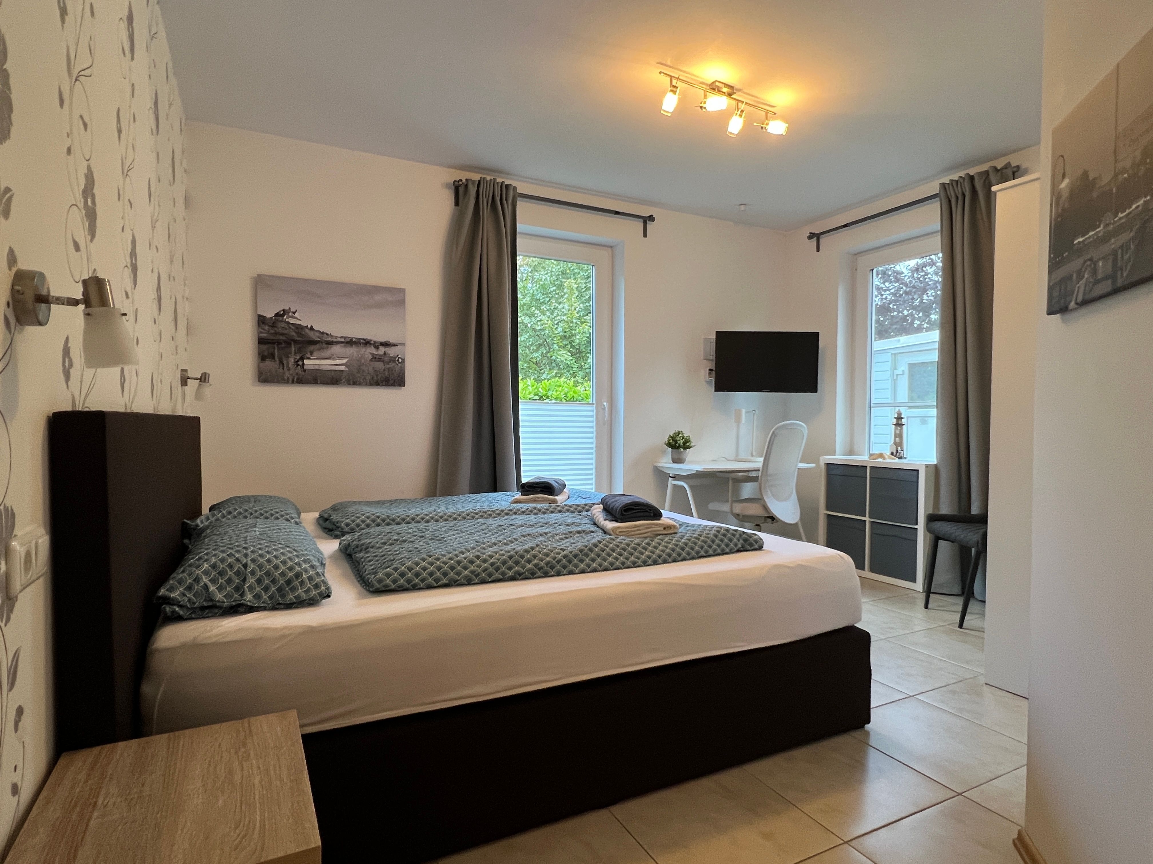 • Schlafzimmer mit Doppelbett, Kleiderschrank, Schreibtisch und Stuhl, Flat-Screen