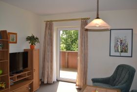 • im Wohnbereich: Schlafsofa, Sessel u. TV, von hier aus Zugang zum Südbalkon