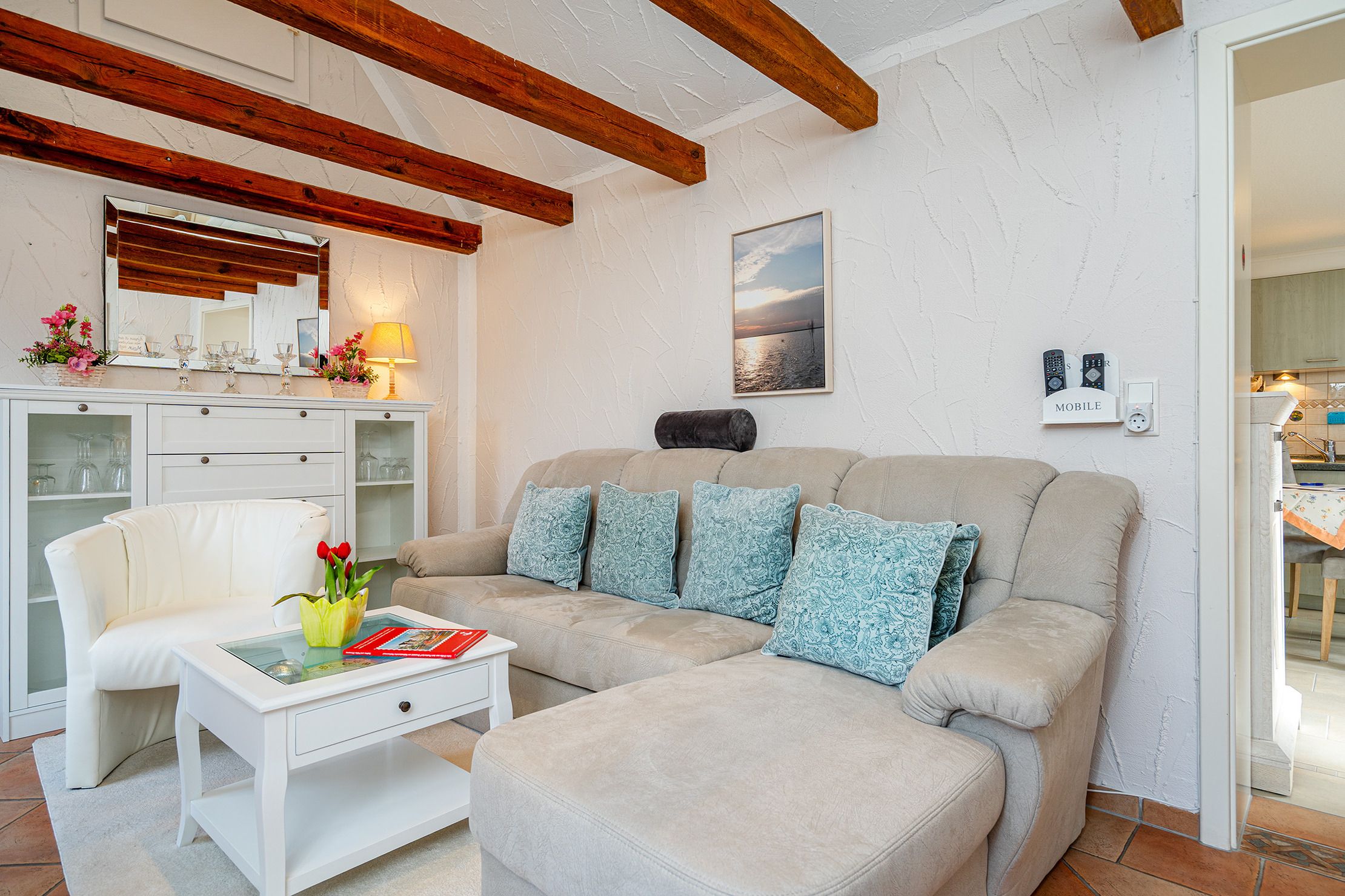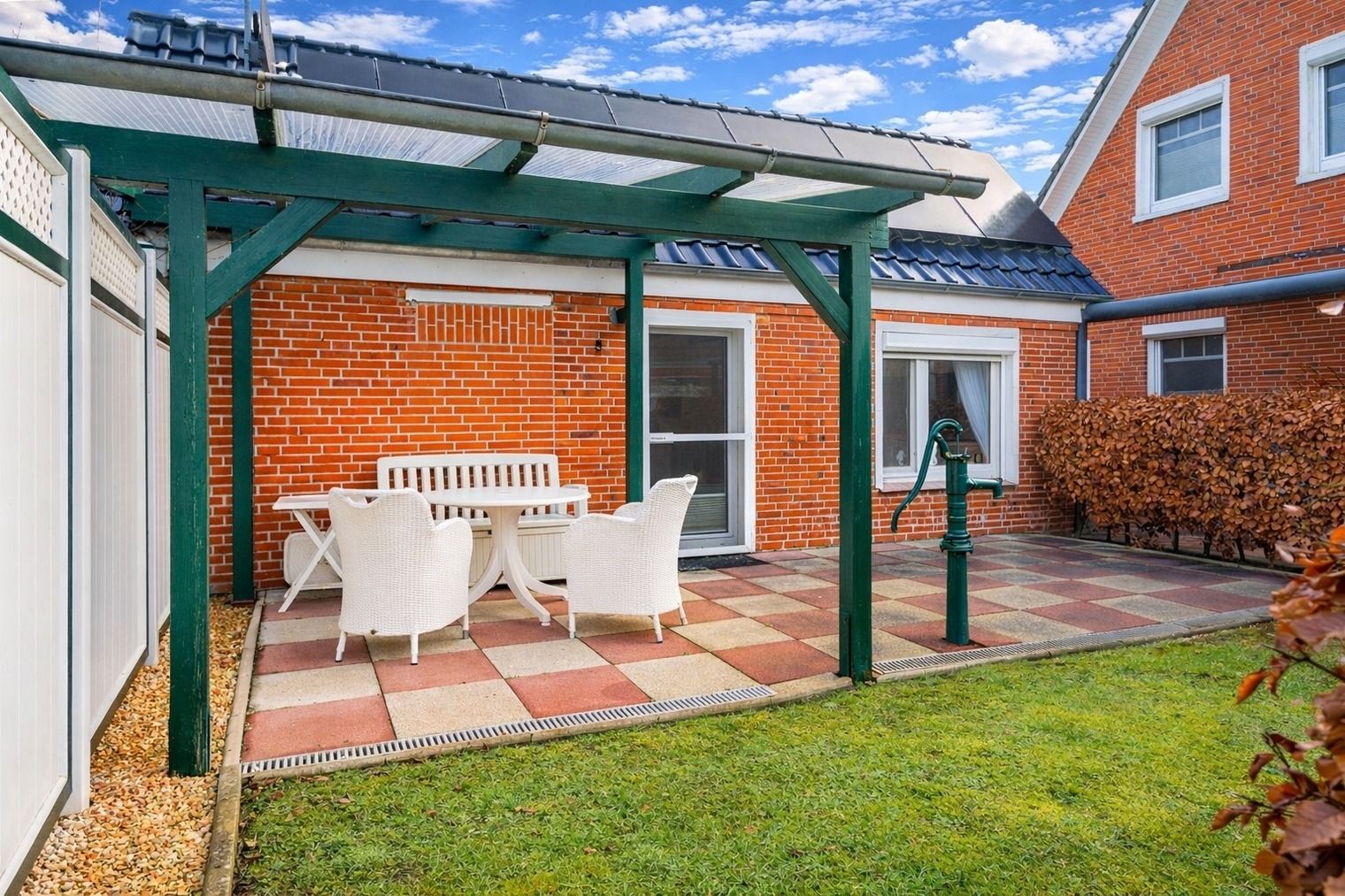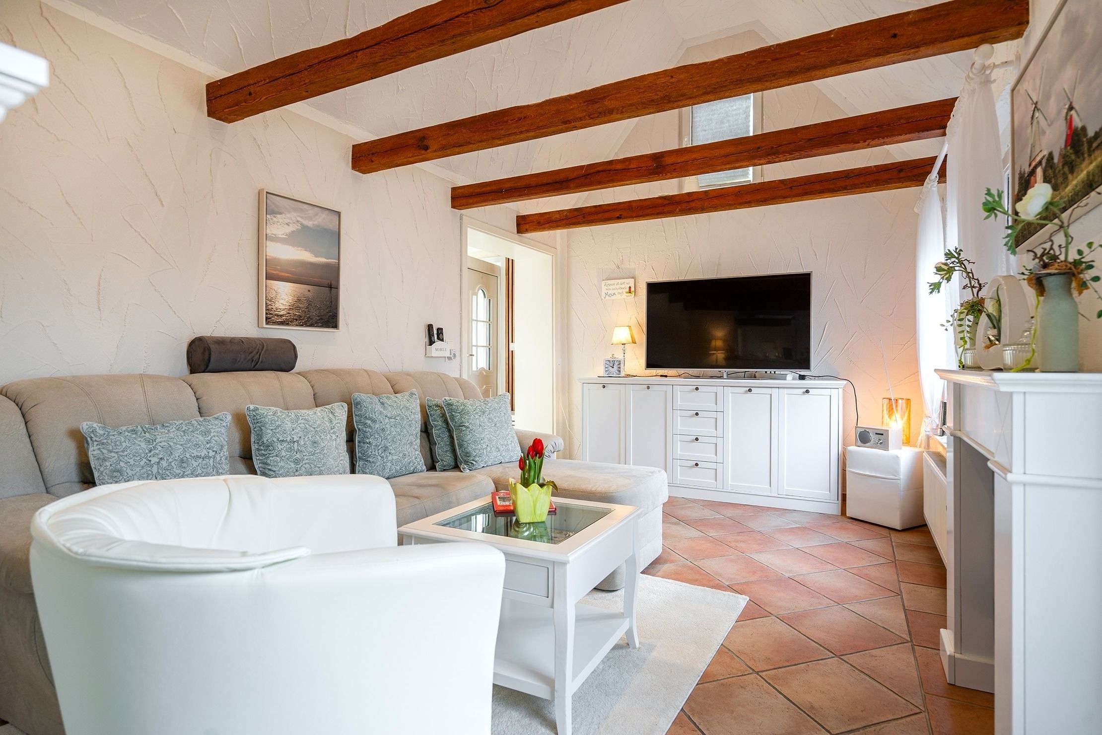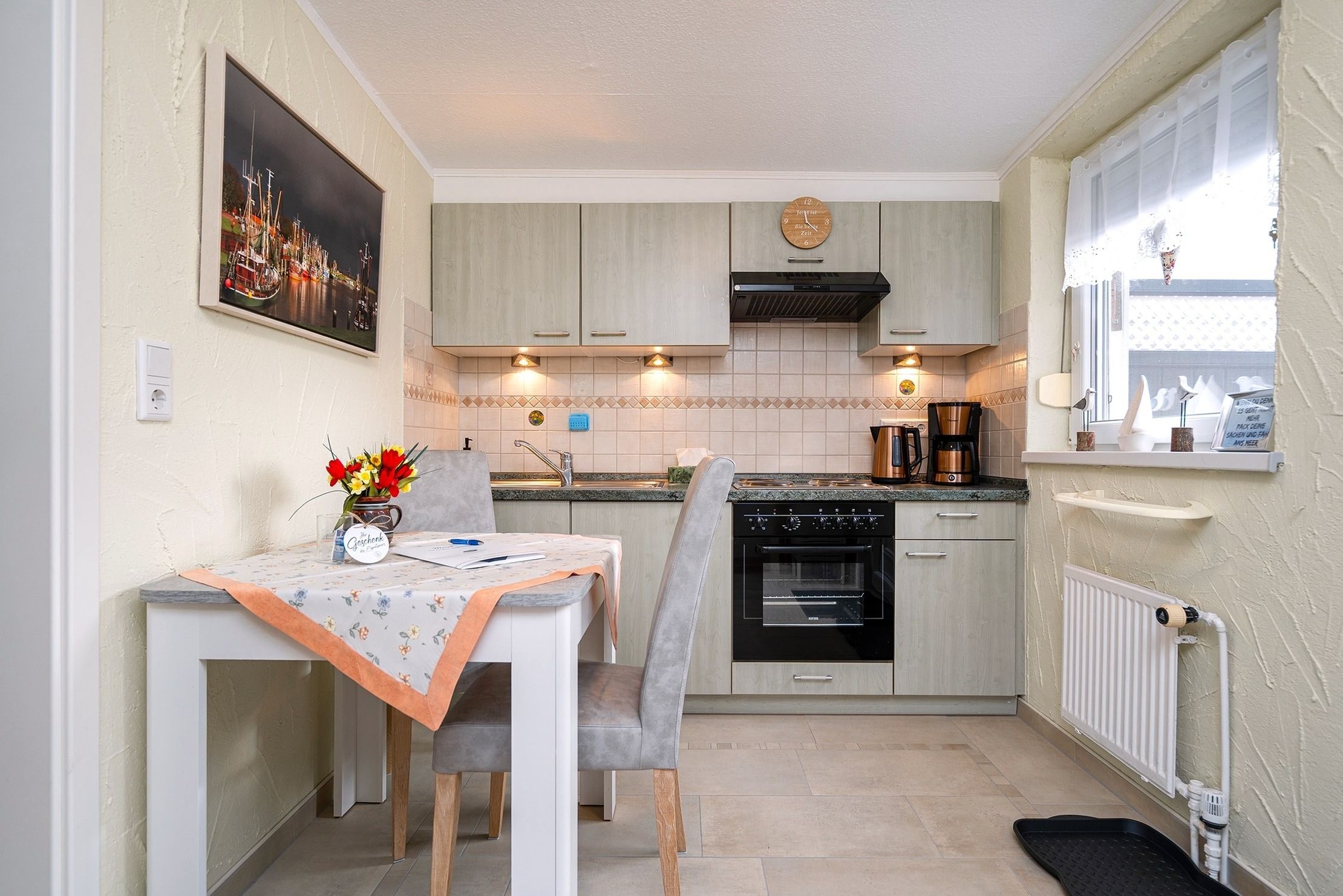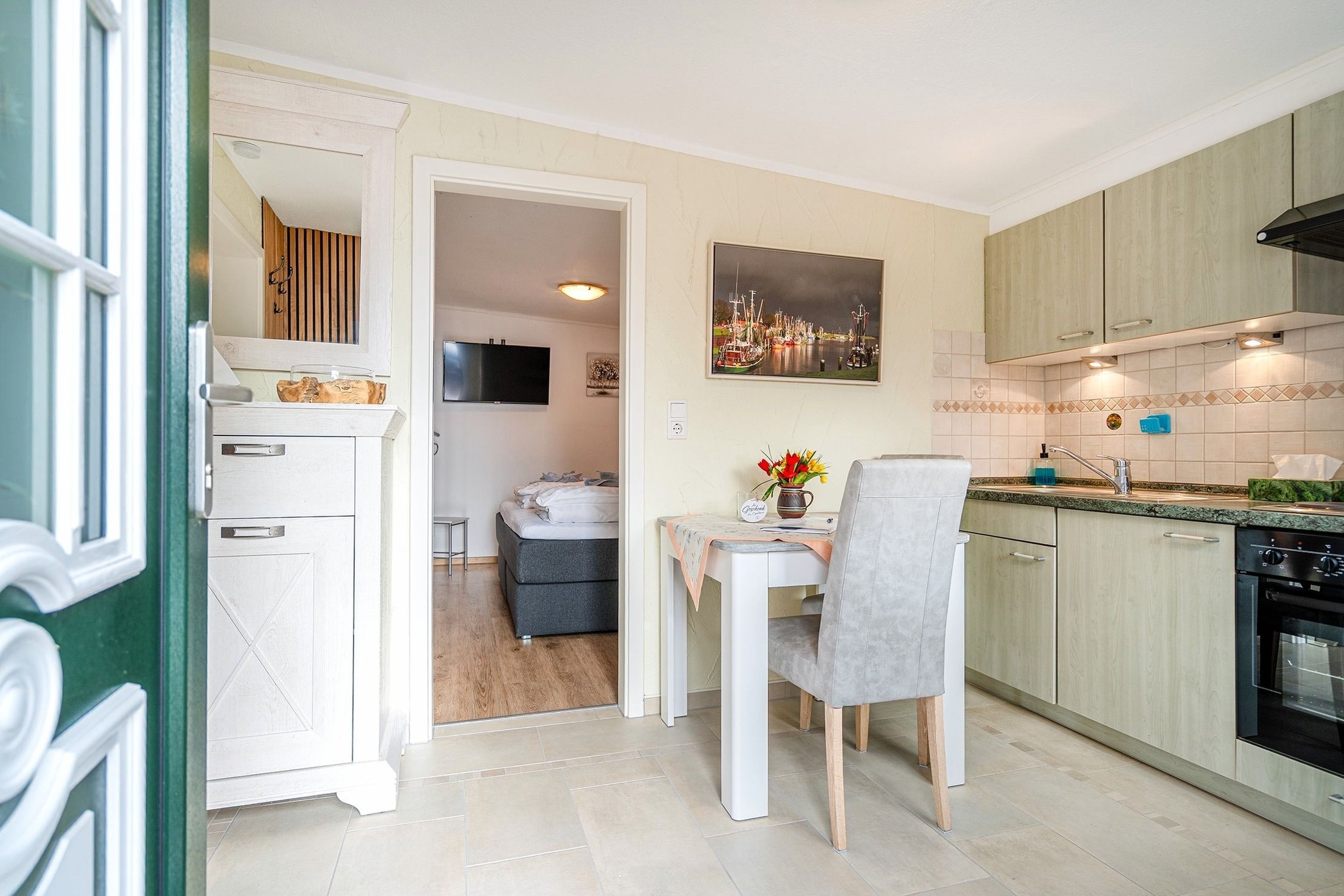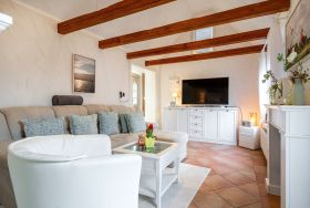 Die Ferienwohnung Emskate in Greetsiel überzeugt nicht nur durch ihre gemütliche und traditionelle Ausstattung, sondern vor allem durch ihre besonders attraktive Lage. In der Edzard-Cirksena-Straße 24, ruhig und dennoch zentral gelegen, erreichen Sie den historischen Ortskern mit den bekannten Zwillingsmühlen und seinen charakteristischen Gassen, kleinen Geschäften und gemütlichen Cafés bequem in wenigen Minuten. Die Wohnung selbst befindet sich im Erdgeschoss, ist für zwei Personen ausgelegt und traditionell ostfriesisch und mit viel Liebe zum Detail eingerichtet. Die Holzbalken an der Decke strahlen eine warme und behagliche Atmosphäre aus. Der helle Wohnbereich mit großem Sofa und Blick ins Grüne lädt zum Entspannen ein, während die abgeschlossene Küche ausreichend Platz und Ausstattung für gemeinsame Kochmomente bietet. Das großzügige Tageslichtbad sorgt für eine angenehme Atmosphäre. Im separaten Schlafzimmer erwartet Sie ein komfortables Boxspringbett. Ein weiteres Highlight ist der Außenbereich mit der goßen und teilweise überdachten Terrasse sowie einer Rasenfläche. Hier genießen Sie Privatsphäre und Ruhe – perfekt für ein Frühstück im Freien oder entspannte Stunden an der frischen Nordseeluft. Auch ein Fahrradabstellraum sowie ein reservierter und überdachter Parkplatz direkt vor der Wohnung stehen zur Verfügung. Die Ferienwohnung Emskate verbindet eine hervorragende, ruhige und dennoch zentrale Lage mit traditionellem ostfriesischem Charme – die ideale Kombination für eine erholsame Auszeit an der Küste.