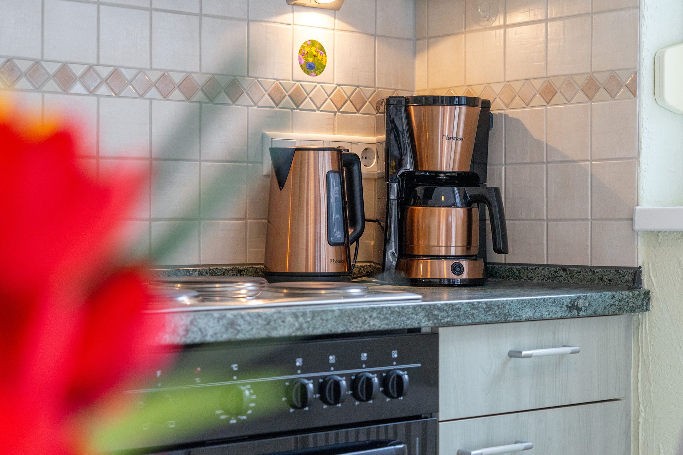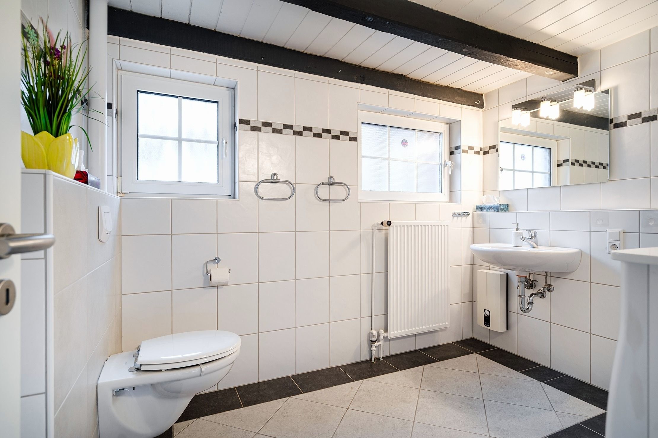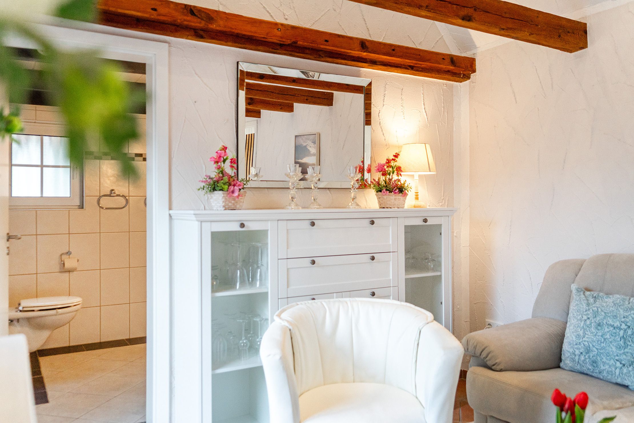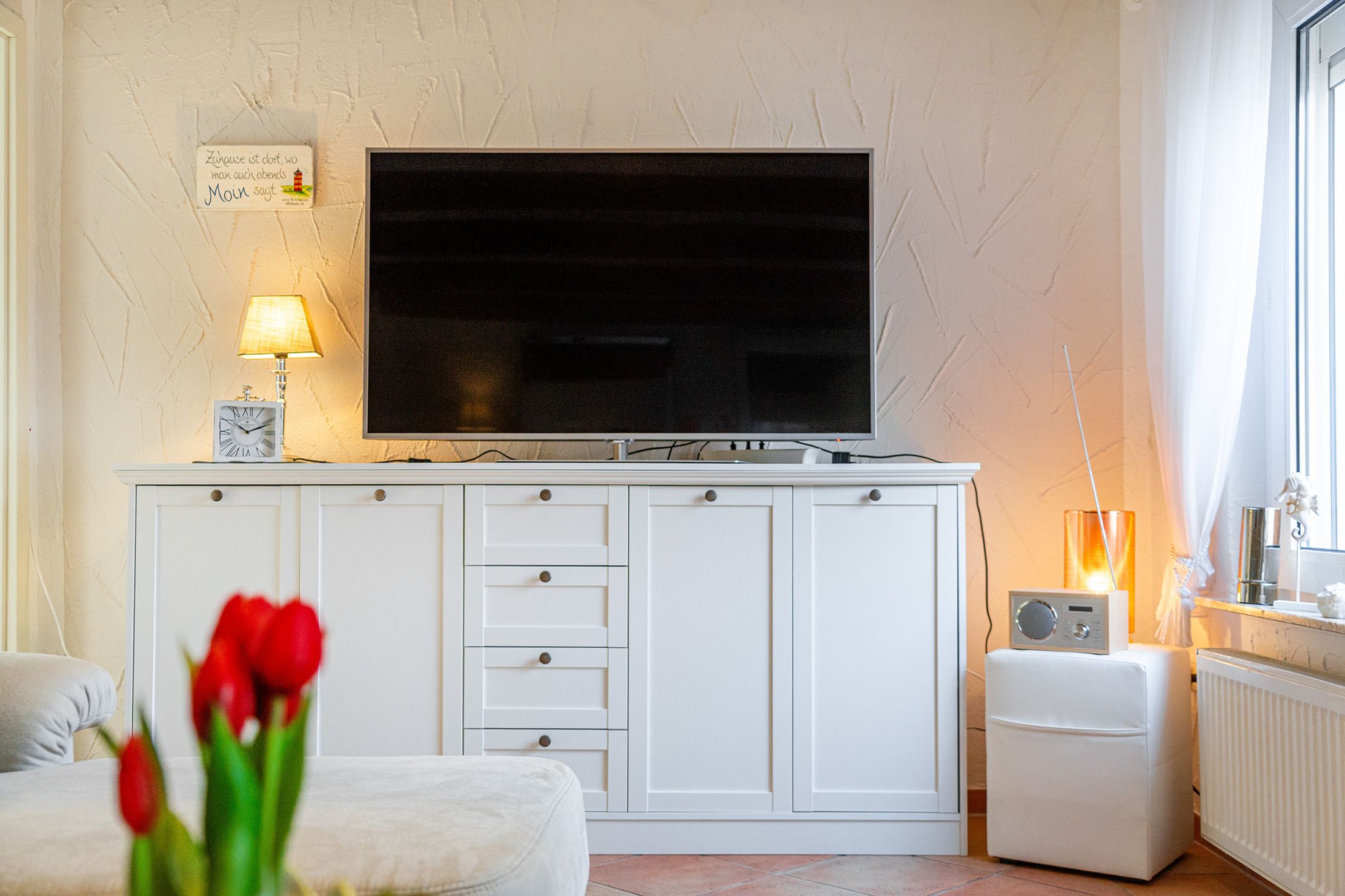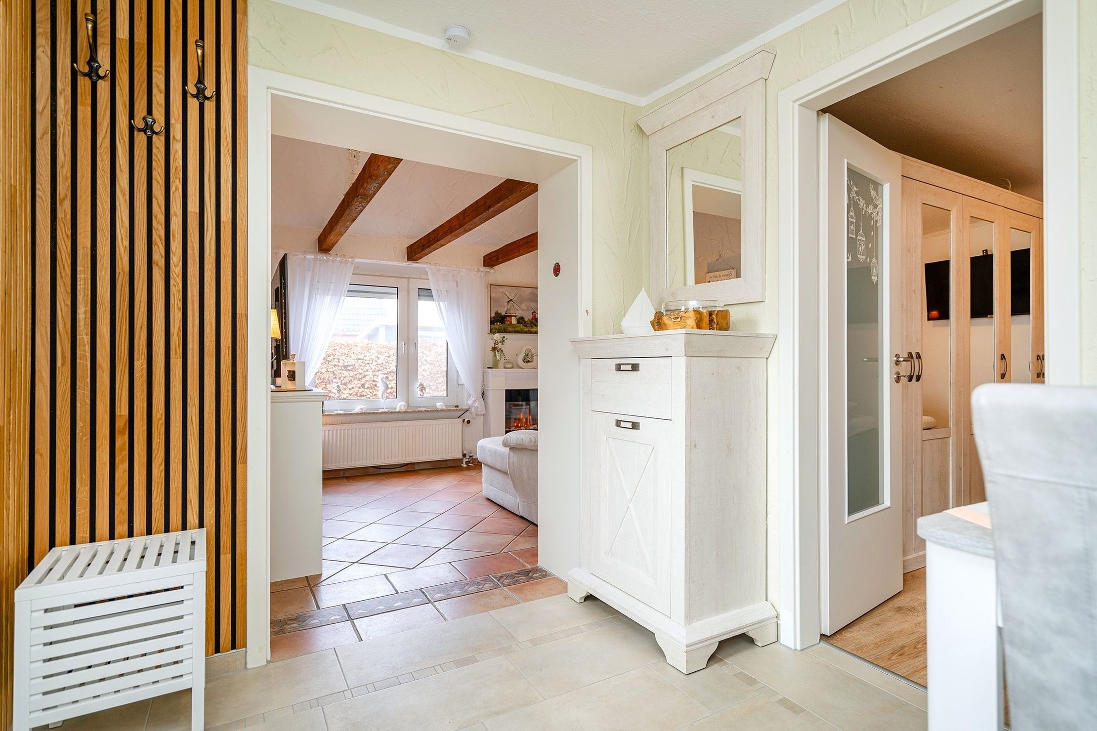 Die Ferienwohnung Emskate in Greetsiel überzeugt nicht nur durch ihre gemütliche und traditionelle Ausstattung, sondern vor allem durch ihre besonders attraktive Lage. In der Edzard-Cirksena-Straße 24, ruhig und dennoch zentral gelegen, erreichen Sie den historischen Ortskern mit den bekannten Zwillingsmühlen und seinen charakteristischen Gassen, kleinen Geschäften und gemütlichen Cafés bequem in wenigen Minuten. Die Wohnung selbst befindet sich im Erdgeschoss, ist für zwei Personen ausgelegt und traditionell ostfriesisch und mit viel Liebe zum Detail eingerichtet. Die Holzbalken an der Decke strahlen eine warme und behagliche Atmosphäre aus. Der helle Wohnbereich mit großem Sofa und Blick ins Grüne lädt zum Entspannen ein, während die abgeschlossene Küche ausreichend Platz und Ausstattung für gemeinsame Kochmomente bietet. Das großzügige Tageslichtbad sorgt für eine angenehme Atmosphäre. Im separaten Schlafzimmer erwartet Sie ein komfortables Boxspringbett. Ein weiteres Highlight ist der Außenbereich mit der goßen und teilweise überdachten Terrasse sowie einer Rasenfläche. Hier genießen Sie Privatsphäre und Ruhe – perfekt für ein Frühstück im Freien oder entspannte Stunden an der frischen Nordseeluft. Auch ein Fahrradabstellraum sowie ein reservierter und überdachter Parkplatz direkt vor der Wohnung stehen zur Verfügung. Die Ferienwohnung Emskate verbindet eine hervorragende, ruhige und dennoch zentrale Lage mit traditionellem ostfriesischem Charme – die ideale Kombination für eine erholsame Auszeit an der Küste.