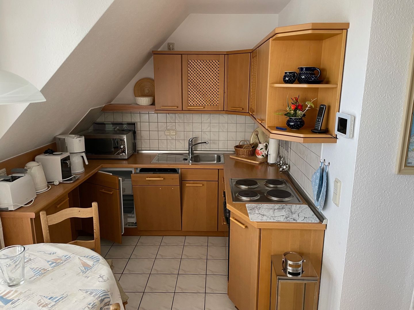 Die offene Küche ist zum Wohnzimmer hin gestaltet und umfassend ausgestattet: Backofen, Herd mit 4-Platten-Kochfeld, Kühlschrank mit Gefrierfach, Spülmaschine, Mikrowelle sowie Kaffeemaschine und Espressomaschine stehen bereit. Ergänzt wird dies durch Wasserkocher, Toaster, Mixer, Eierkocher, Küchenutensilien sowie Geschirr und Besteck; auch Geschirrhandtücher sind vorhanden. Für längere Aufenthalte ist die Waschmaschine zur Eigennutzung besonders praktisch, ebenso Wäscheständer, Bügelbrett und Bügeleisen.