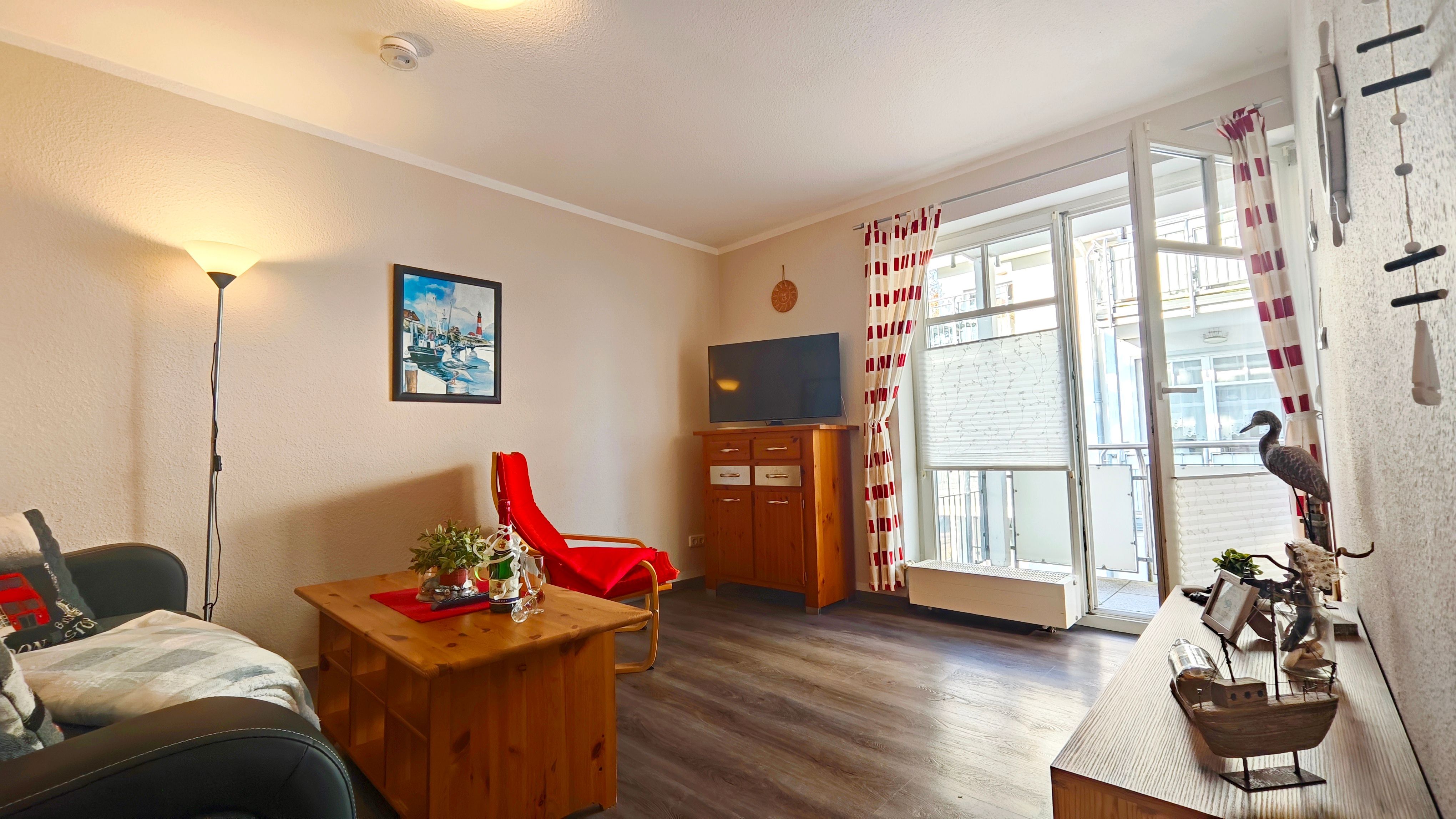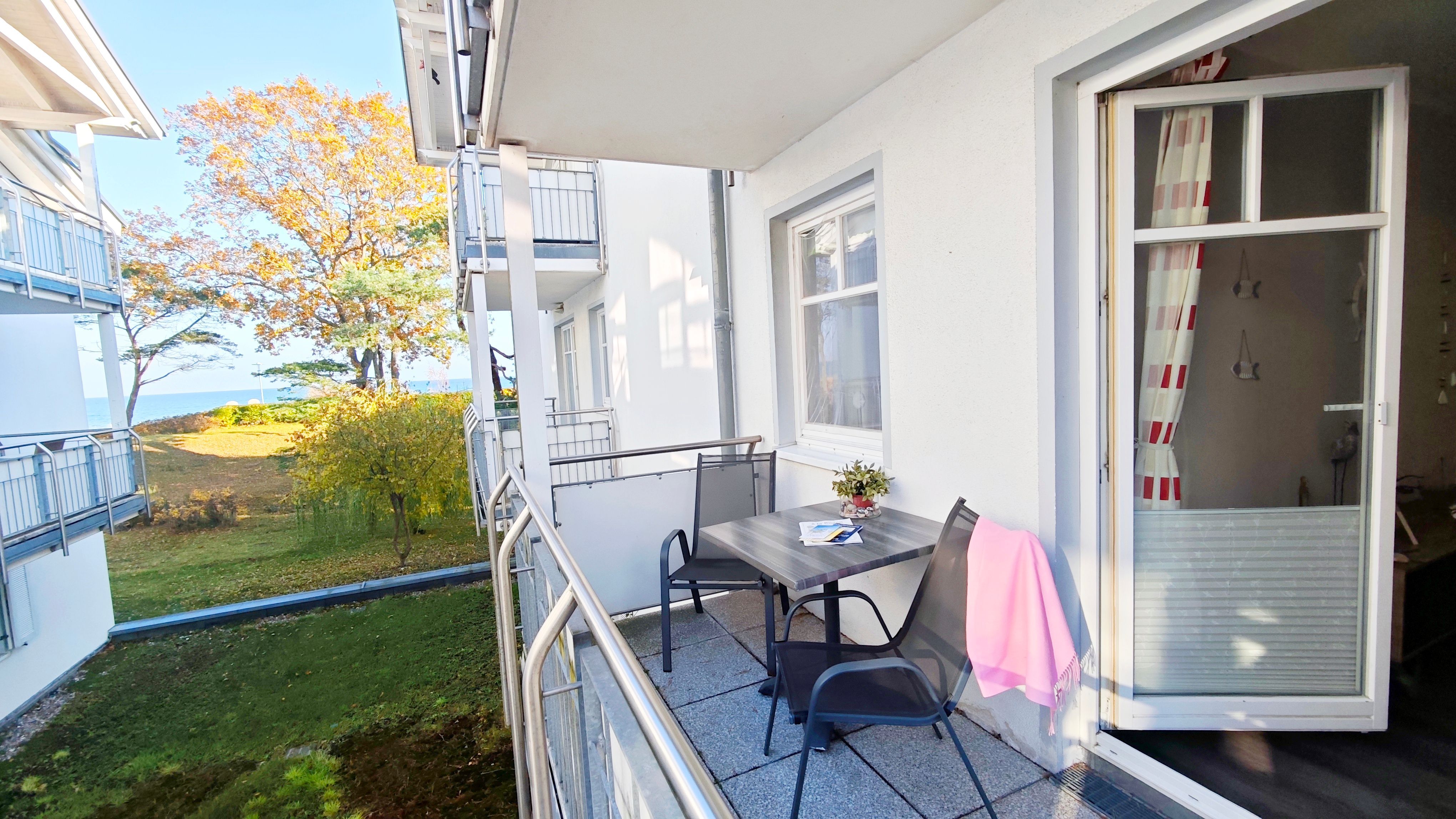 Vom Wohnraum gelangen Sie direkt auf den Balkon, wo Sie die frische Meeresluft in vollen Zügen genießen können.