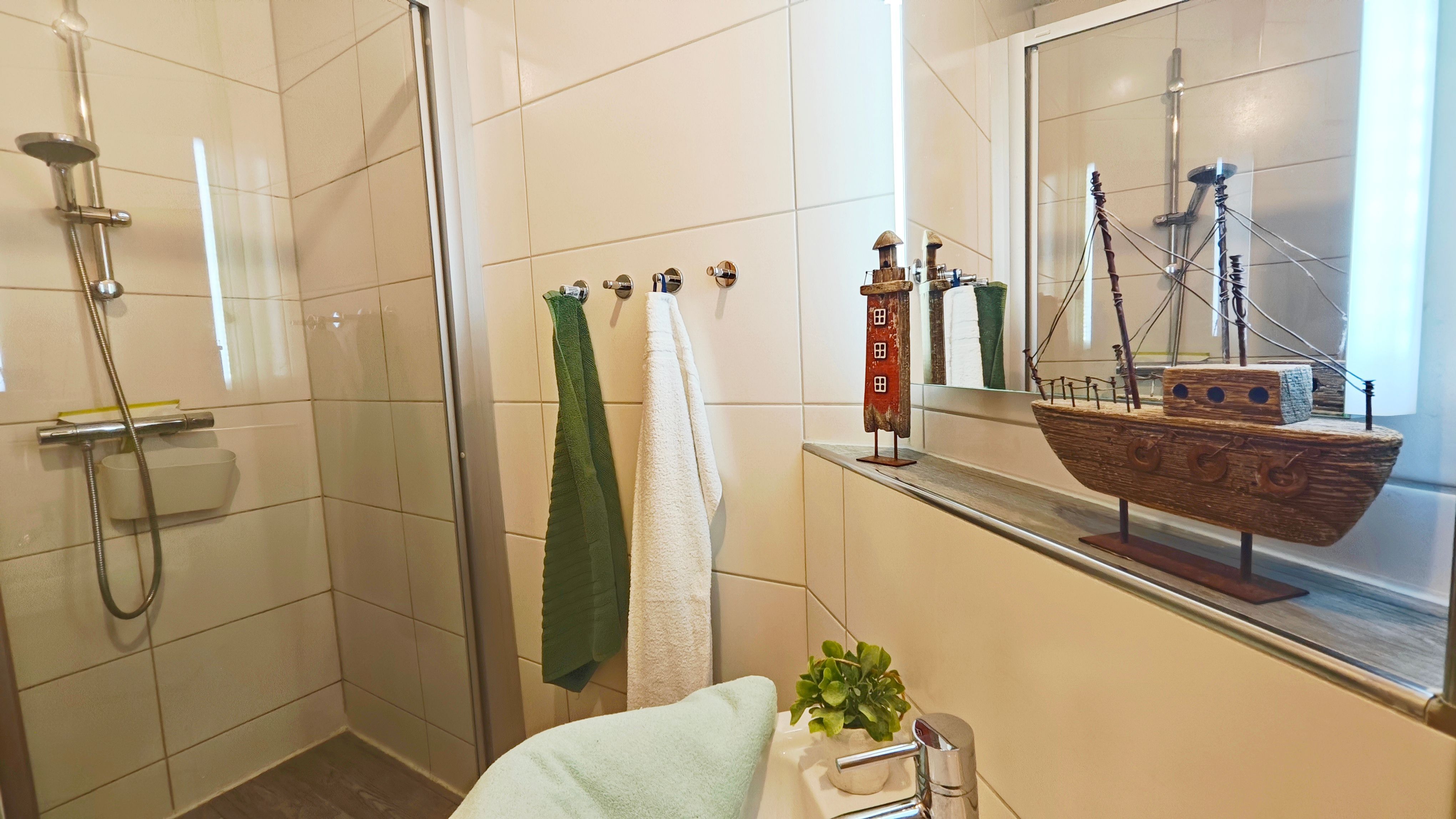 Das Badezimmer ist mit einer praktischen Dusche ausgestattet und rundet den Wohlfühlcharakter dieser charmanten Ferienwohnung ab.