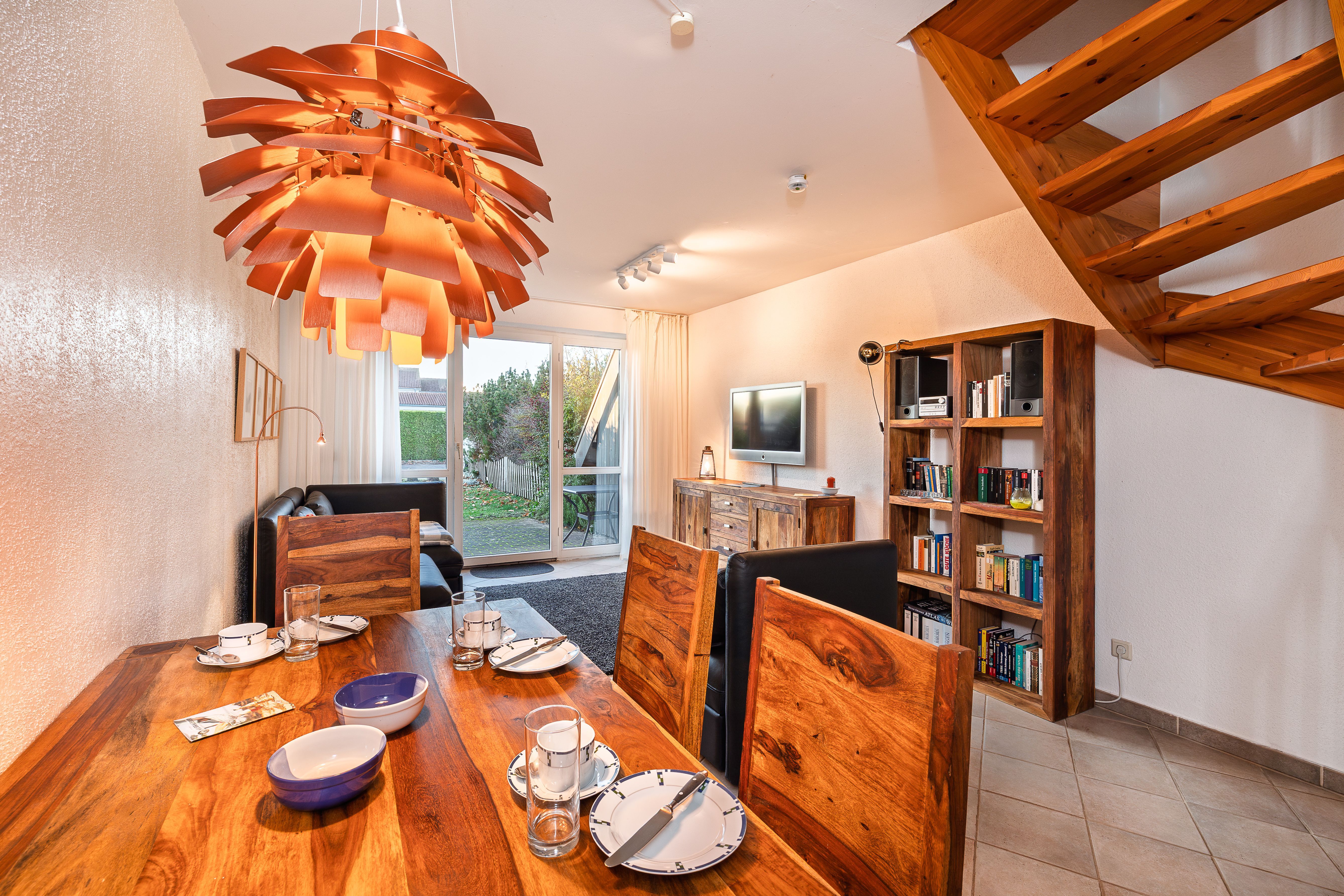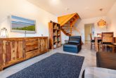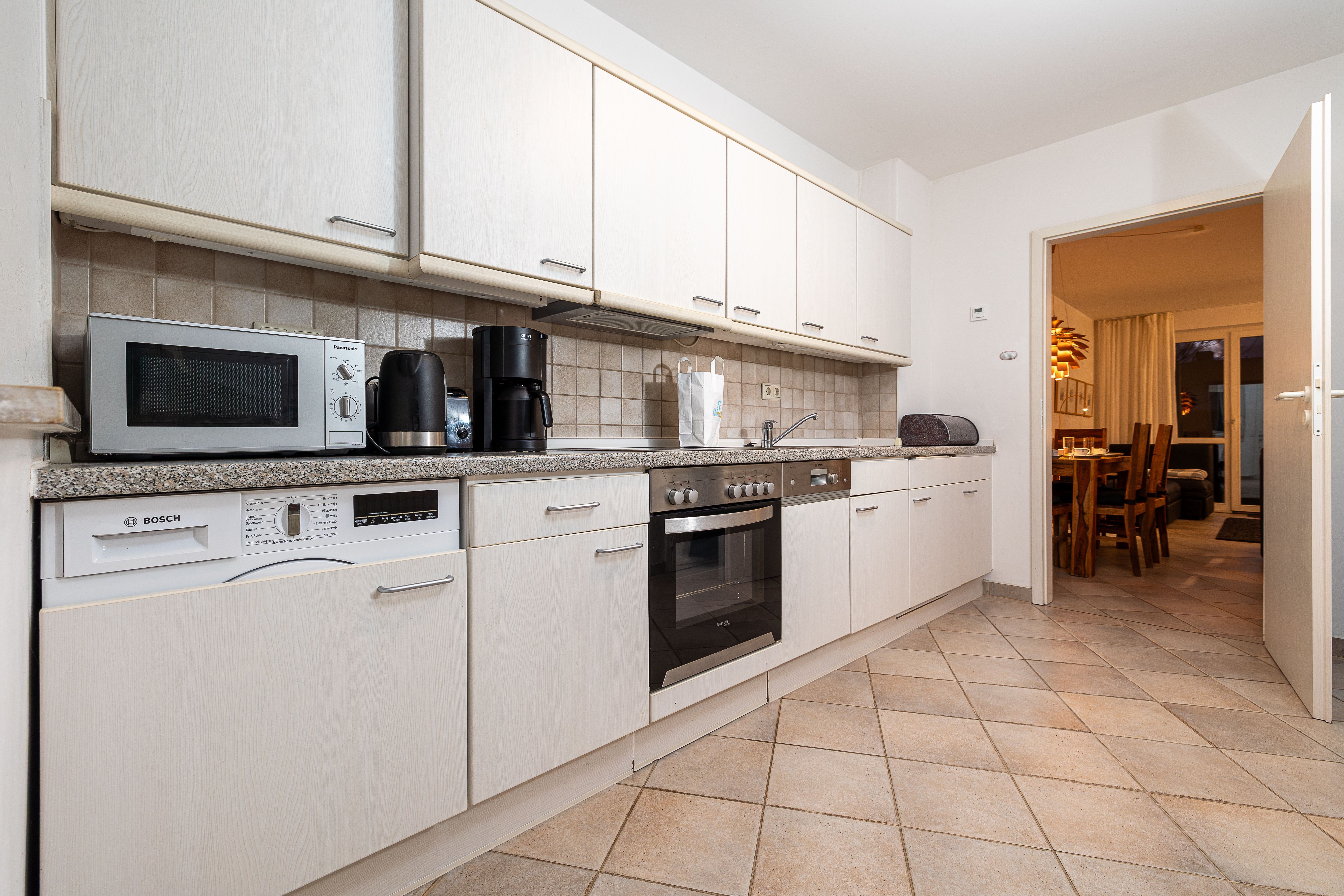 Der helle Wohnbereich öffnet sich direkt zur Terrasse und schafft eine freundliche Atmosphäre, die sich wunderbar ins Freie verlängert perfekt für ein Frühstück in der Morgensonne oder ruhige Momente an der frischen Luft. Die bestens ausgestattete Küche ermöglicht das mühelose Zubereiten gemeinsamer Mahlzeiten.