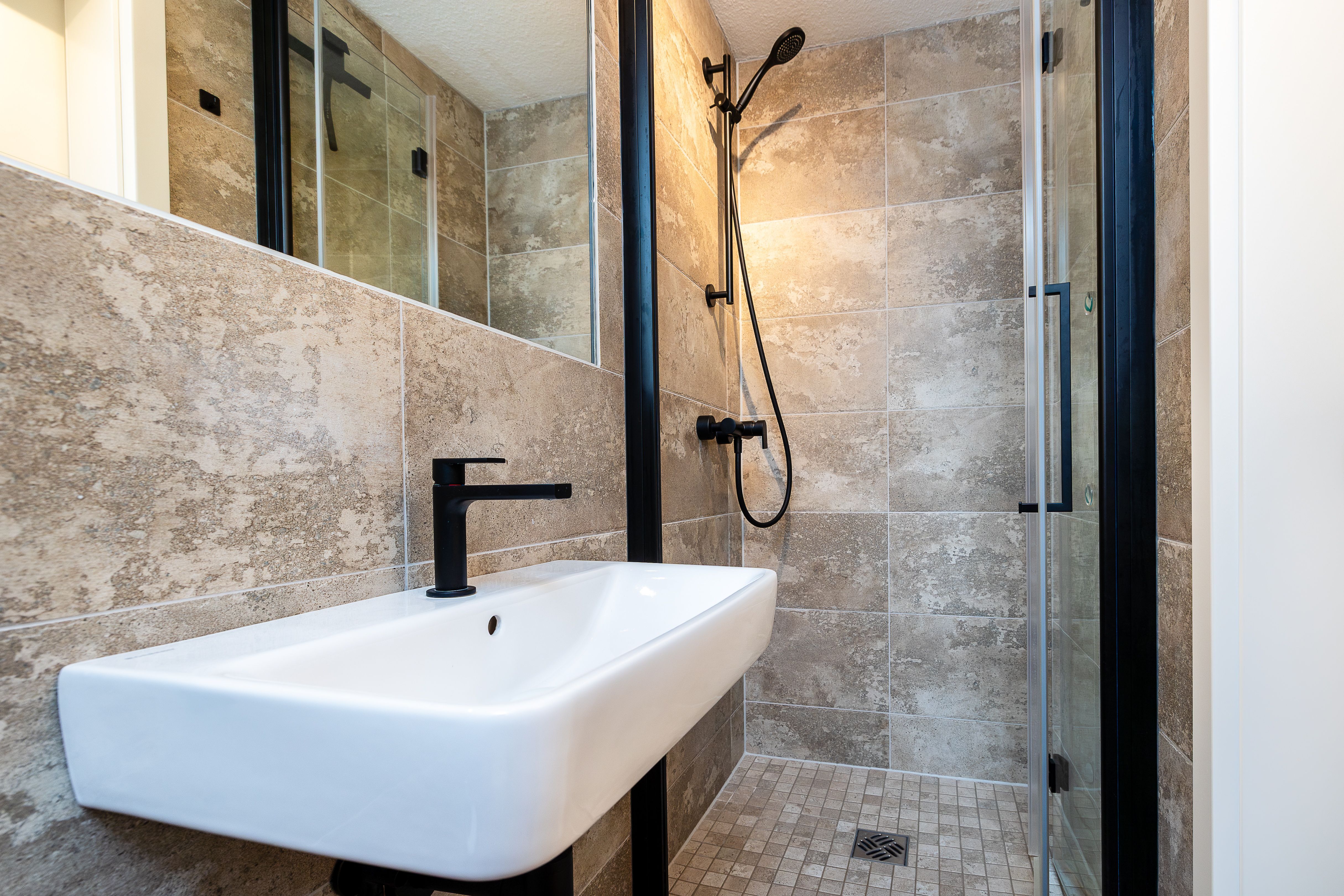 Das neu modern gestaltete Badezimmer überzeugt mit einer komfortablen, ebenerdigen Dusche und einem klaren, zeitgemäßen Design. Ein zusätzliches Gäste-WC ergänzt die Ausstattung.