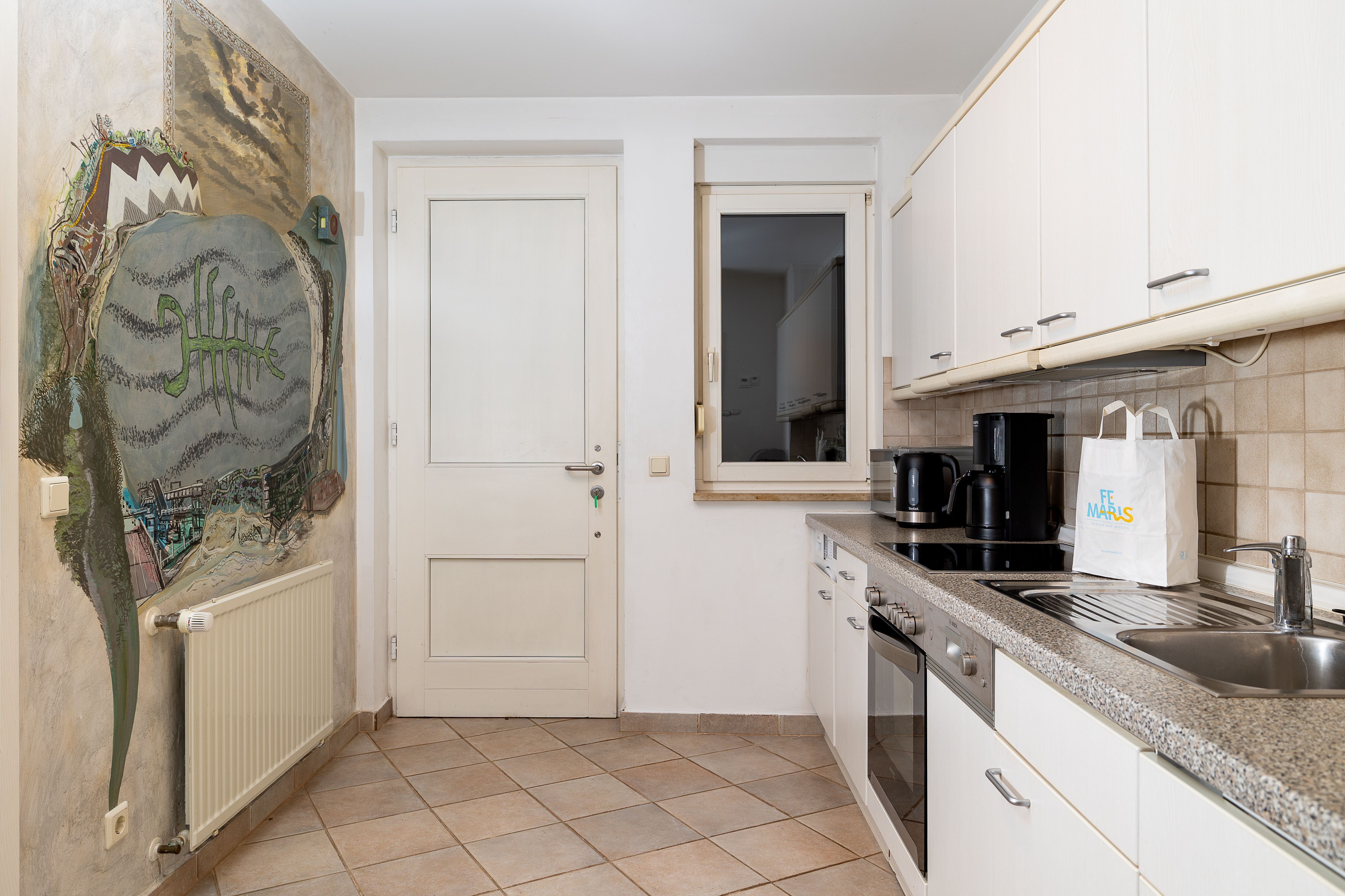 Küche mit Spülmaschine, Mikrowelle, Kühlschrank mit Gefriermöglichkeit, Kaffeemaschine, Wasserkocher, Toaster